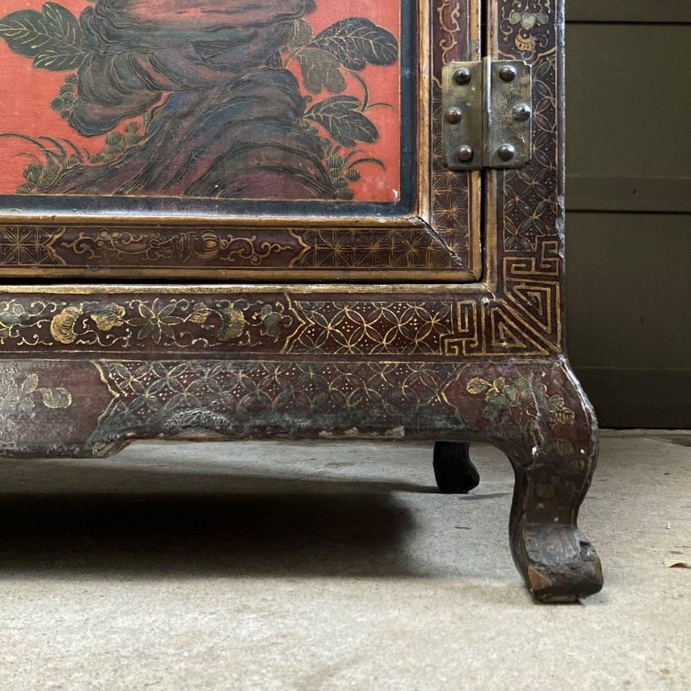An early 20th century chinoiserie lacquered and painted cabinet, comprising of a pair of drawers over a shelved two-door cupboard. Some chips and losses to surface, as to be expected, but these do not detract from the overall bold decorative effect. The top has watermarks and stains to it, possibly where vases of flowers have been placed upon it. The portrayals of birds and insects amongst branches of blossom do however make this piece particularly attractive.