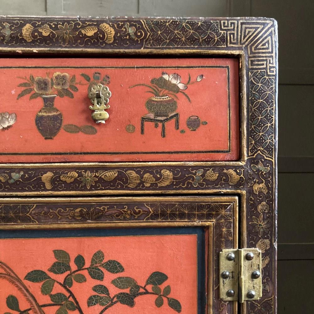 An early 20th century chinoiserie lacquered and painted cabinet, comprising of a pair of drawers over a shelved two-door cupboard. Some chips and losses to surface, as to be expected, but these do not detract from the overall bold decorative effect. The top has watermarks and stains to it, possibly where vases of flowers have been placed upon it. The portrayals of birds and insects amongst branches of blossom do however make this piece particularly attractive.