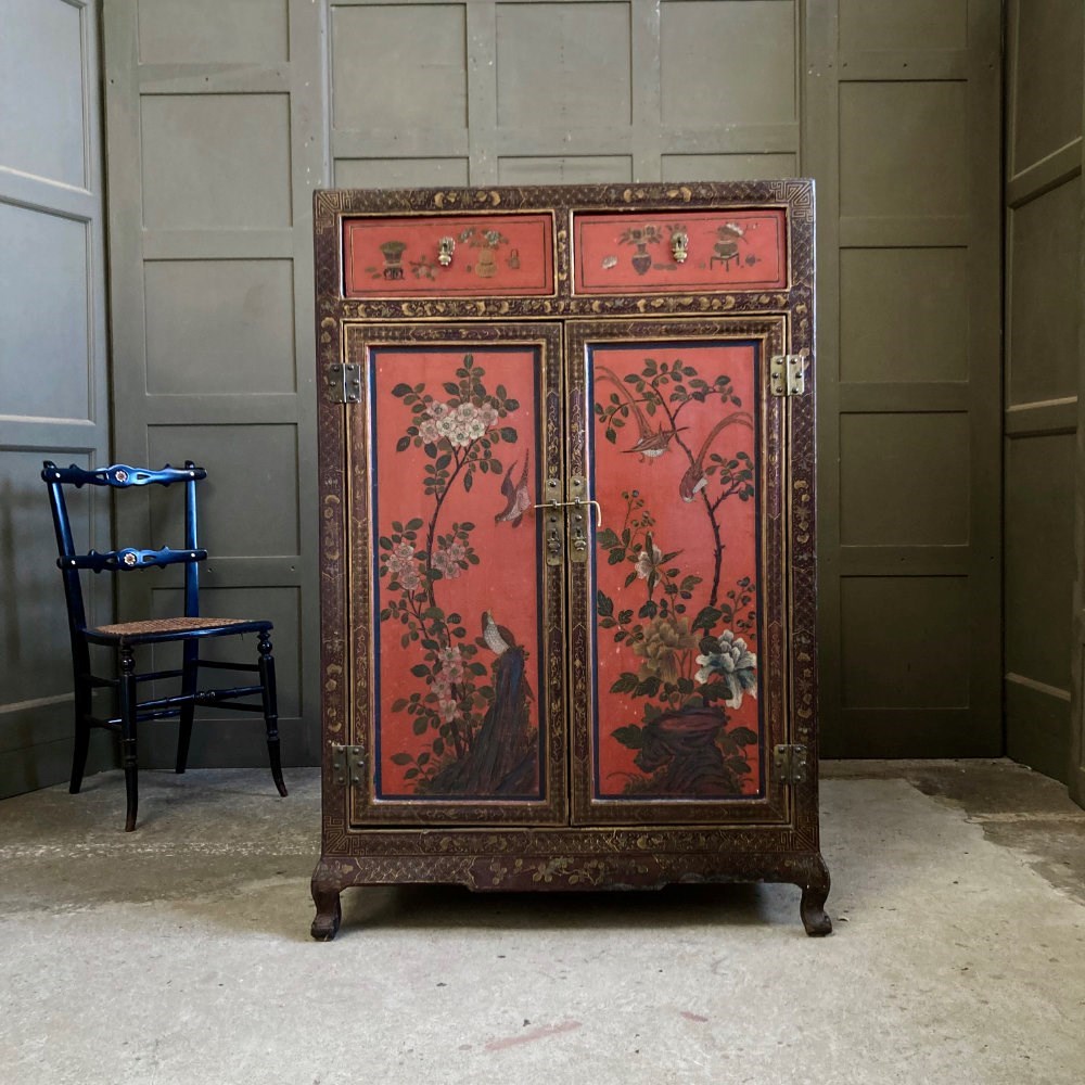An early 20th century chinoiserie lacquered and painted cabinet, comprising of a pair of drawers over a shelved two-door cupboard. Some chips and losses to surface, as to be expected, but these do not detract from the overall bold decorative effect. The top has watermarks and stains to it, possibly where vases of flowers have been placed upon it. The portrayals of birds and insects amongst branches of blossom do however make this piece particularly attractive.