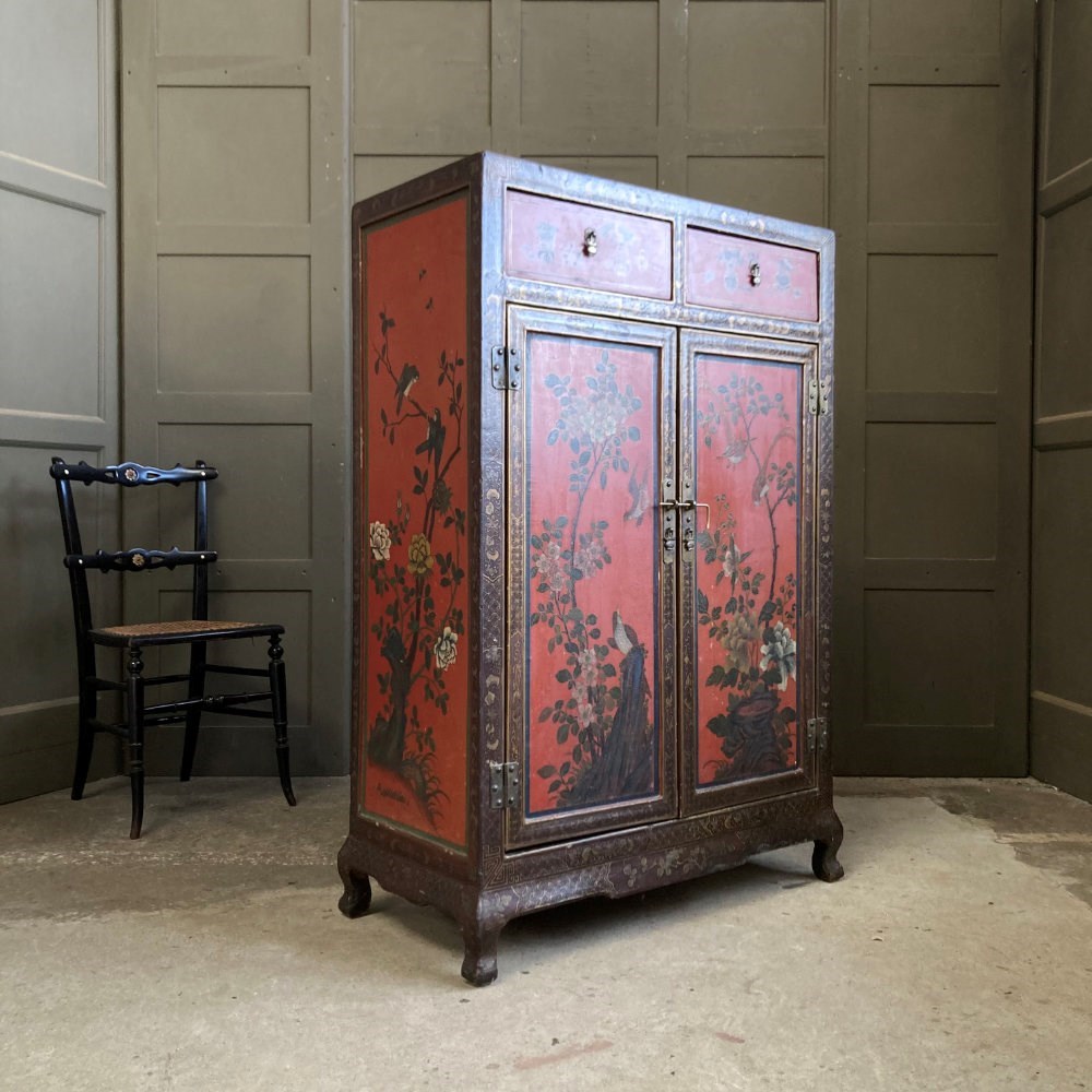 An early 20th century chinoiserie lacquered and painted cabinet, comprising of a pair of drawers over a shelved two-door cupboard. Some chips and losses to surface, as to be expected, but these do not detract from the overall bold decorative effect. The top has watermarks and stains to it, possibly where vases of flowers have been placed upon it. The portrayals of birds and insects amongst branches of blossom do however make this piece particularly attractive.