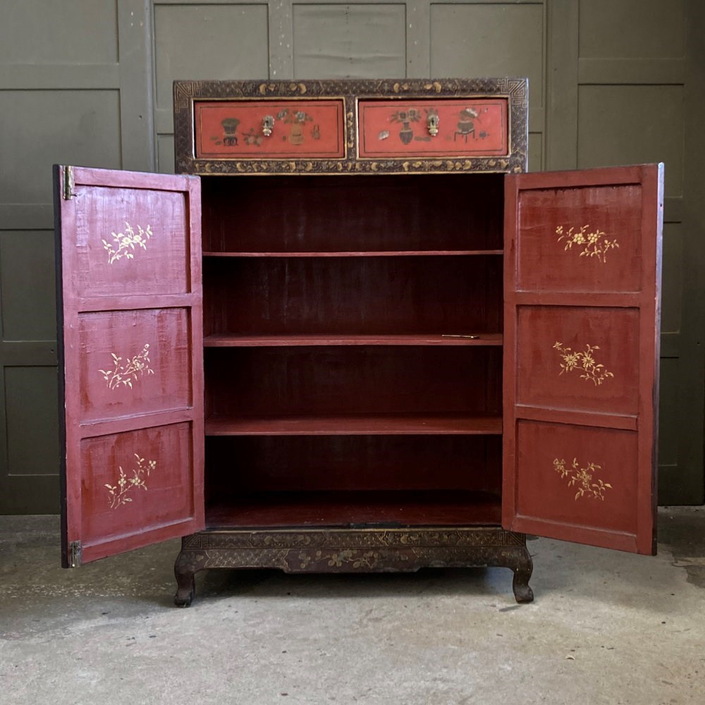 An early 20th century chinoiserie lacquered and painted cabinet, comprising of a pair of drawers over a shelved two-door cupboard. Some chips and losses to surface, as to be expected, but these do not detract from the overall bold decorative effect. The top has watermarks and stains to it, possibly where vases of flowers have been placed upon it. The portrayals of birds and insects amongst branches of blossom do however make this piece particularly attractive.