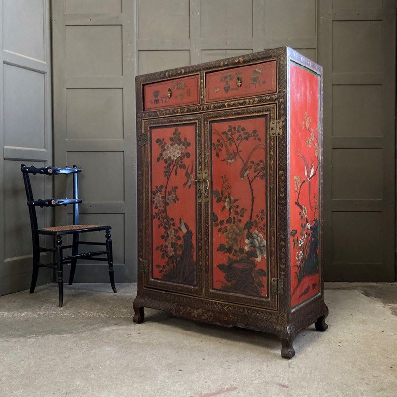 An early 20th century chinoiserie lacquered and painted cabinet, comprising of a pair of drawers over a shelved two-door cupboard. Some chips and losses to surface, as to be expected, but these do not detract from the overall bold decorative effect. The top has watermarks and stains to it, possibly where vases of flowers have been placed upon it. The portrayals of birds and insects amongst branches of blossom do however make this piece particularly attractive.