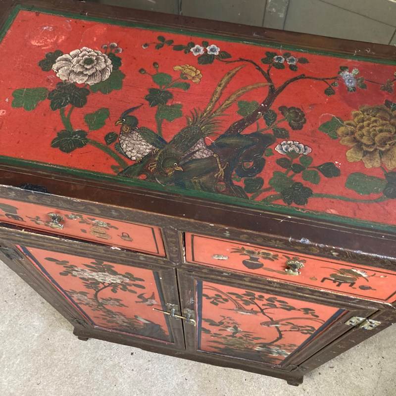 An early 20th century chinoiserie lacquered and painted cabinet, comprising of a pair of drawers over a shelved two-door cupboard. Some chips and losses to surface, as to be expected, but these do not detract from the overall bold decorative effect. The top has watermarks and stains to it, possibly where vases of flowers have been placed upon it. The portrayals of birds and insects amongst branches of blossom do however make this piece particularly attractive.