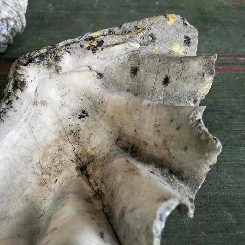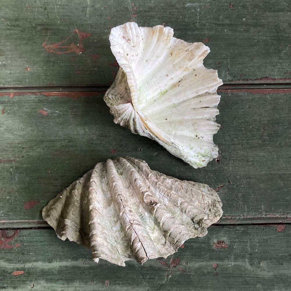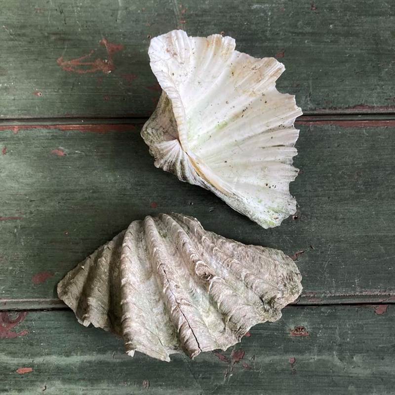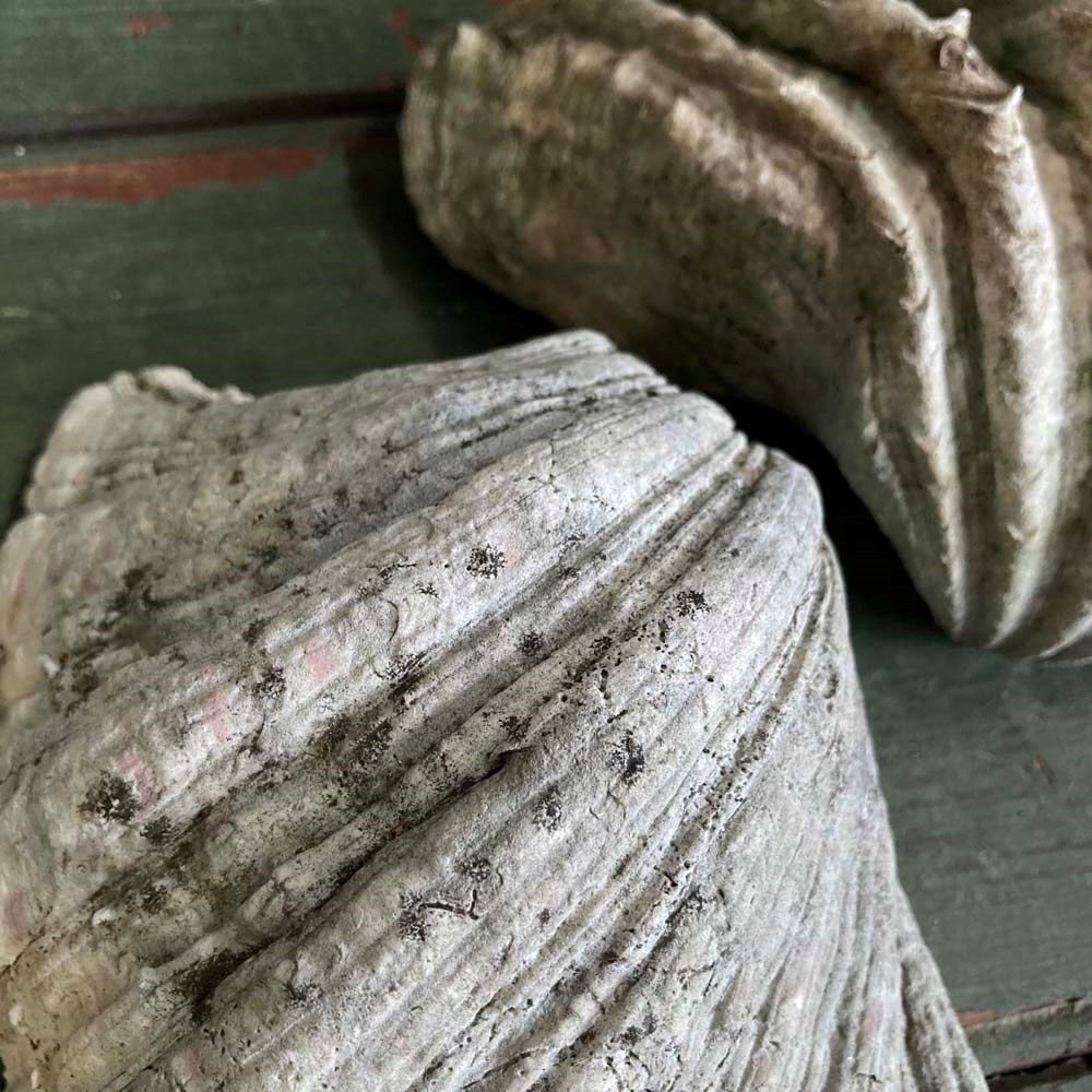 Two small very old clam shells discovered in a Cornish garden grotto. They have acquired a lovely 'weathered' patina to them.