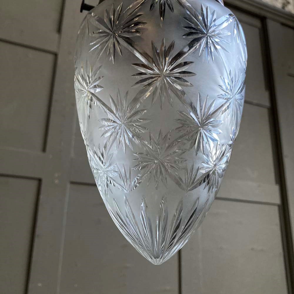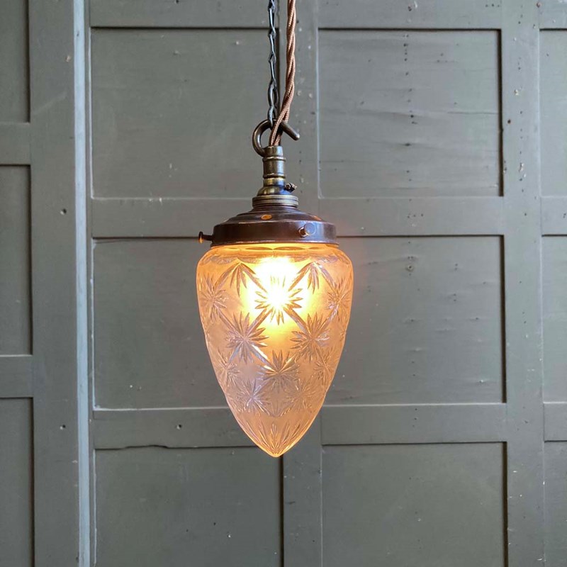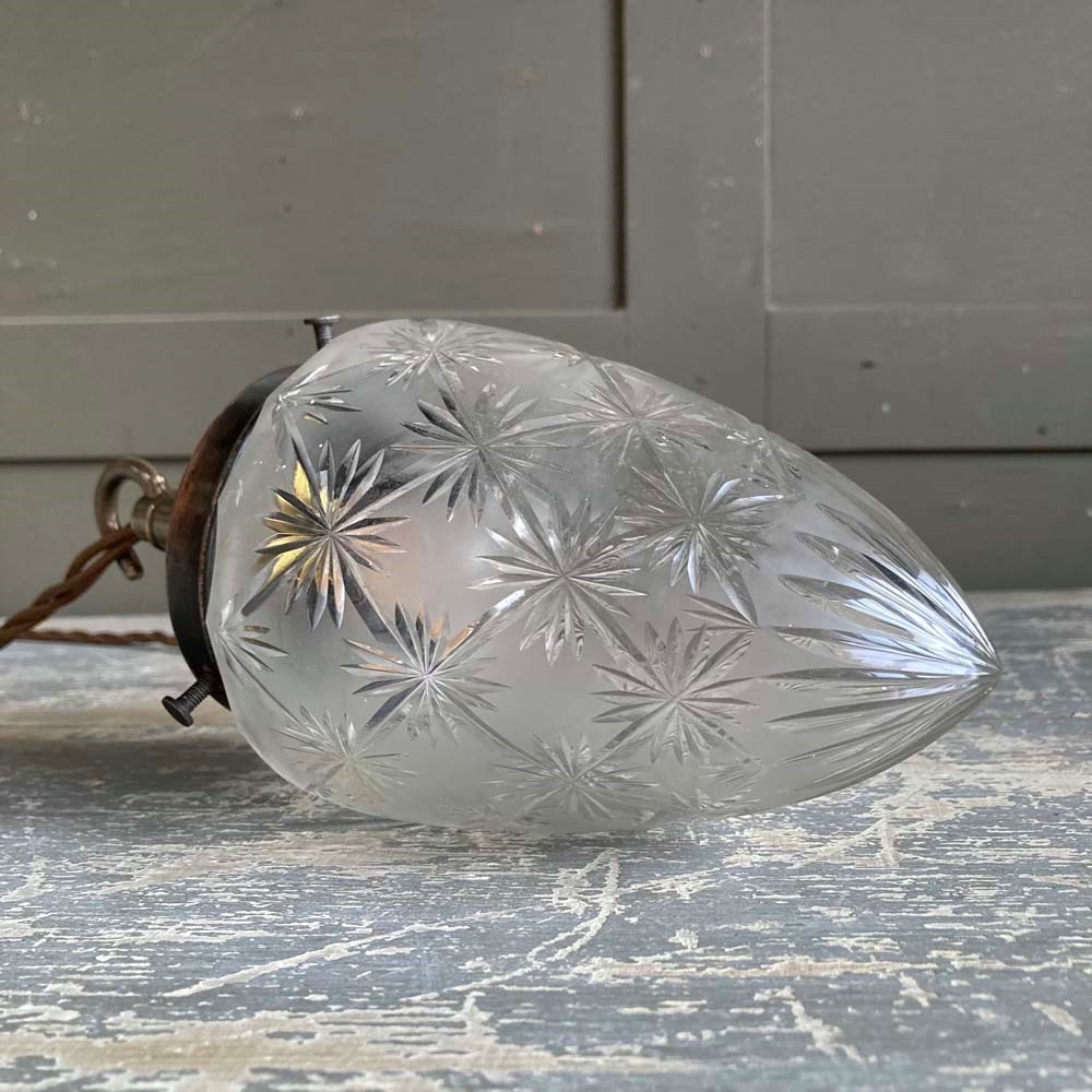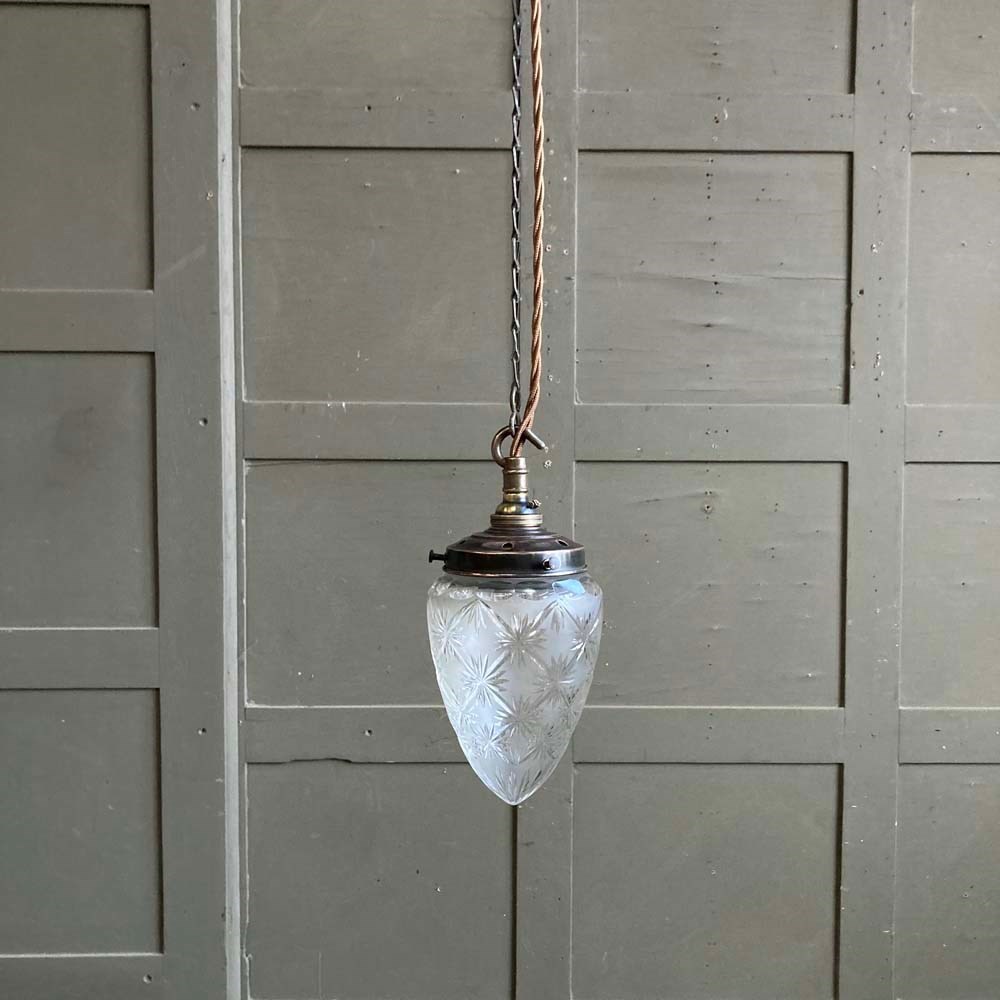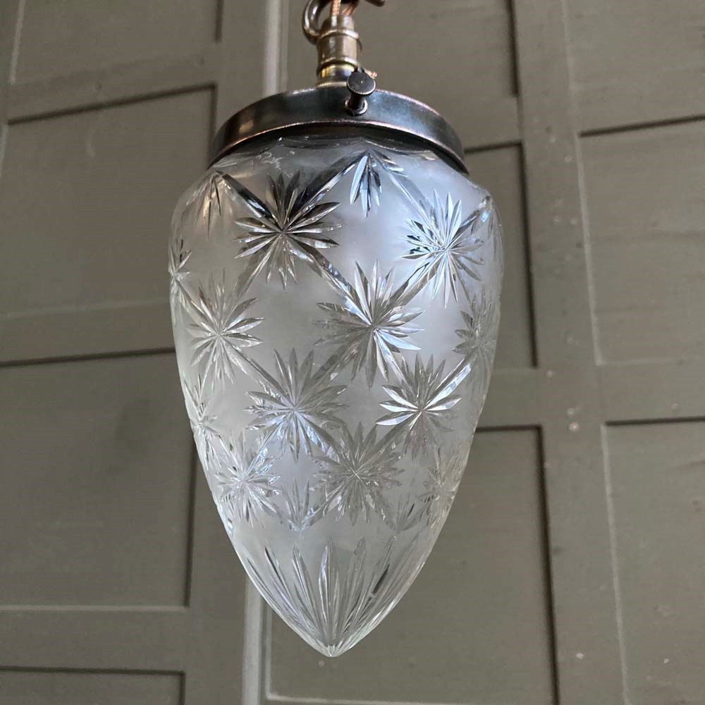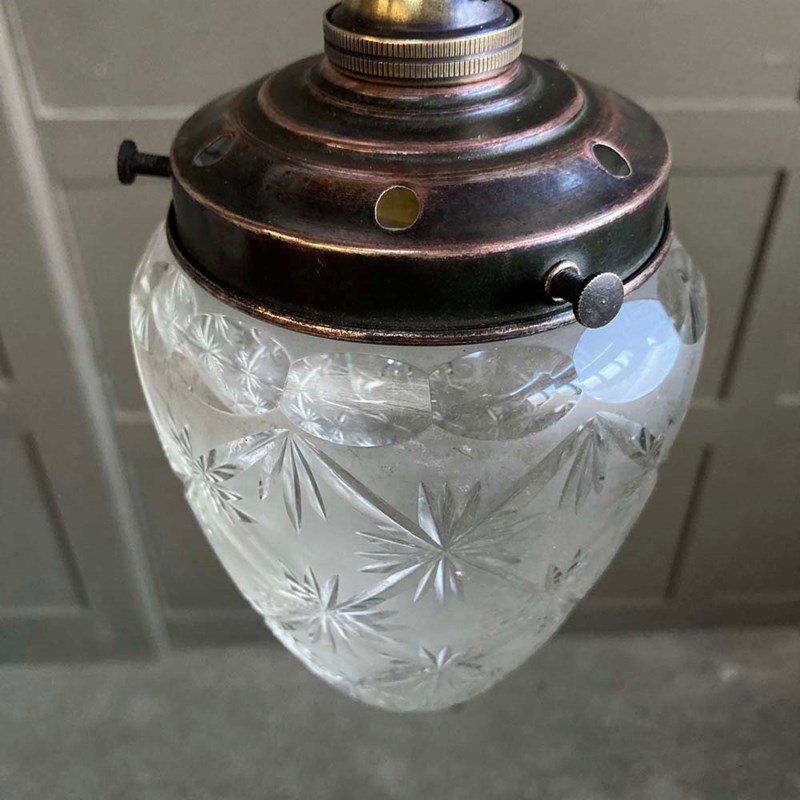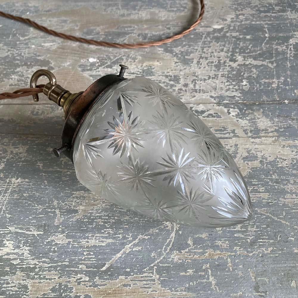 A small cut-glass star pattern pendant light with original copper gallery. Ideal for a hallway or small room. Rewired with new bulb holder and approx. 1 metre of silk-covered flex.