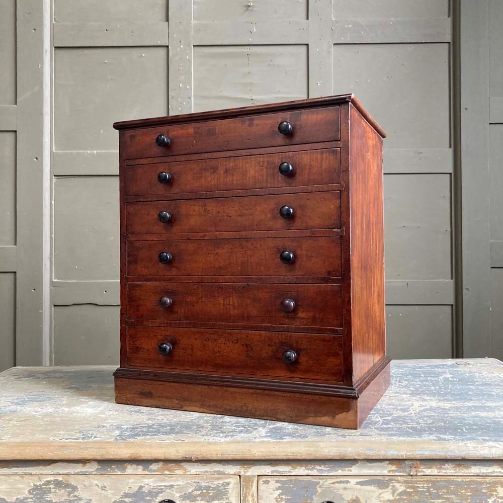 A set of Edwardian mahogany shop drawers originally made and supplied by 'Treble & Son, Shop Fitters, Gloucester Road, Hoxton, LONDON'. They were sourced from an old chemist's shop where they had been used to store small cosmetic items such as lipsticks. Solid mahogany-front drawers with original ebonised knobs. Some veneer losses to base, but otherwise in lovely condition with a rich-coloured patina, and smooth running gradated drawers. Maker's label inset to top drawer interior, as well as their 'stamp' to the back of every drawer.