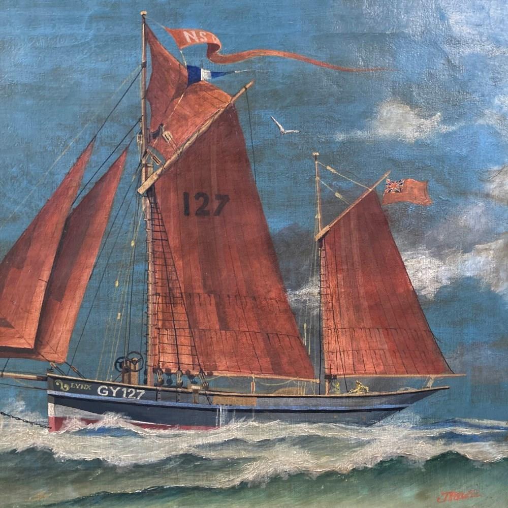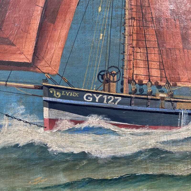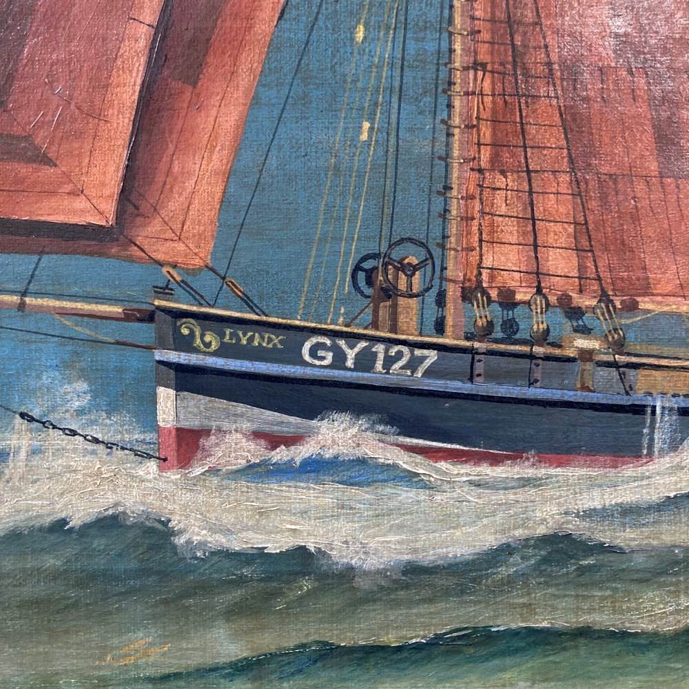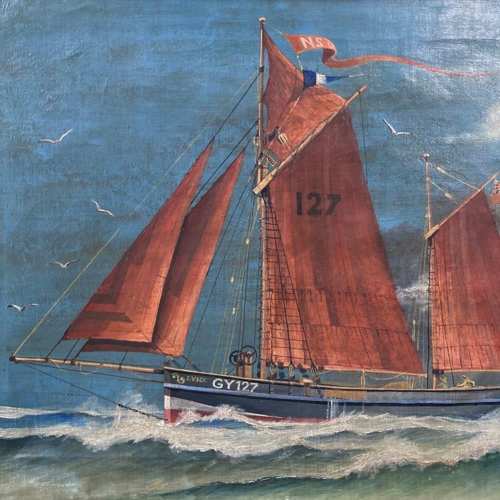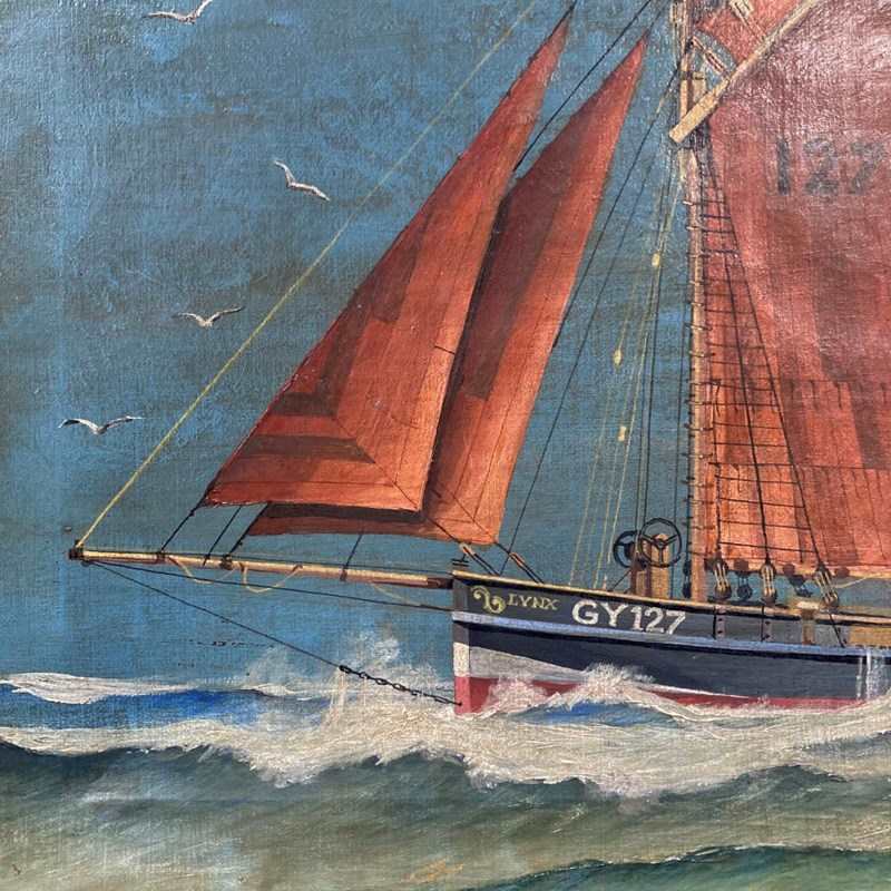 A naive British marine painting by J. Rodwell. This oil on canvas features the Grimsby fishing ketch LYNX GY127. The red canvas sails make this a particularly attractive painting, and perfect for a nautical-themed interior.
