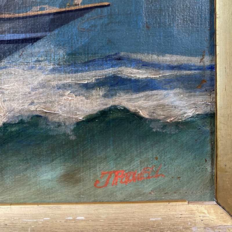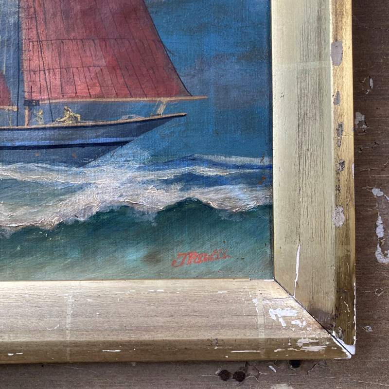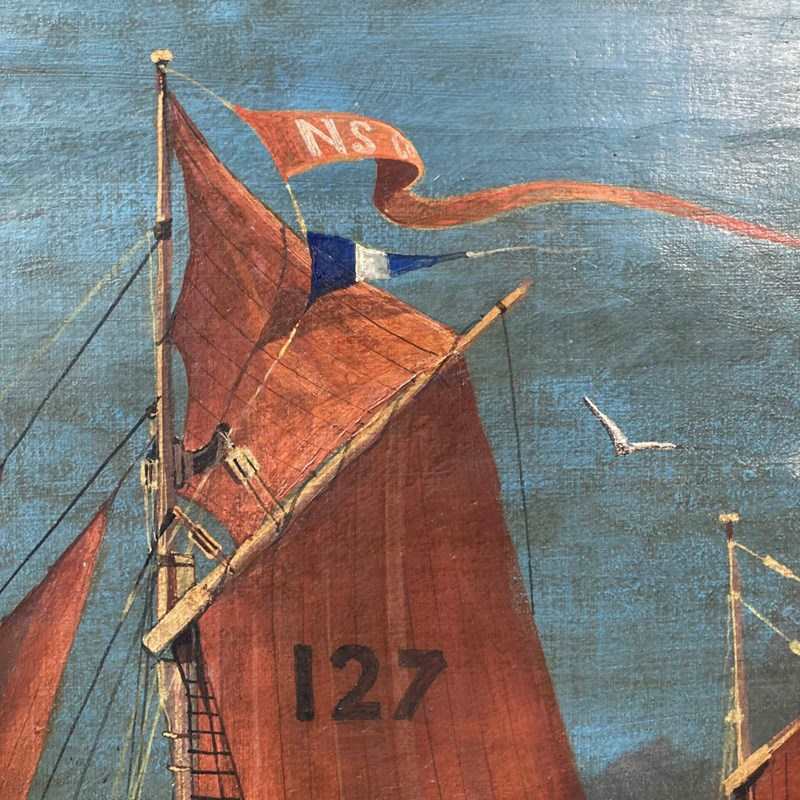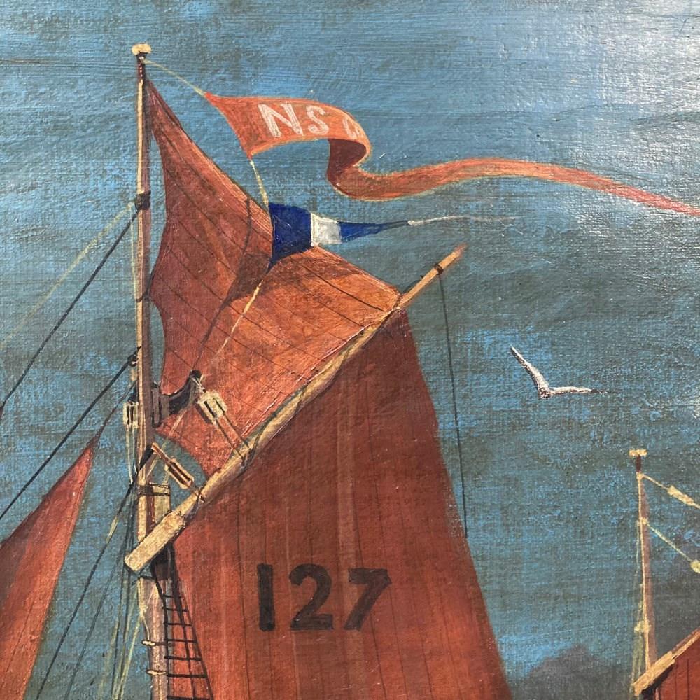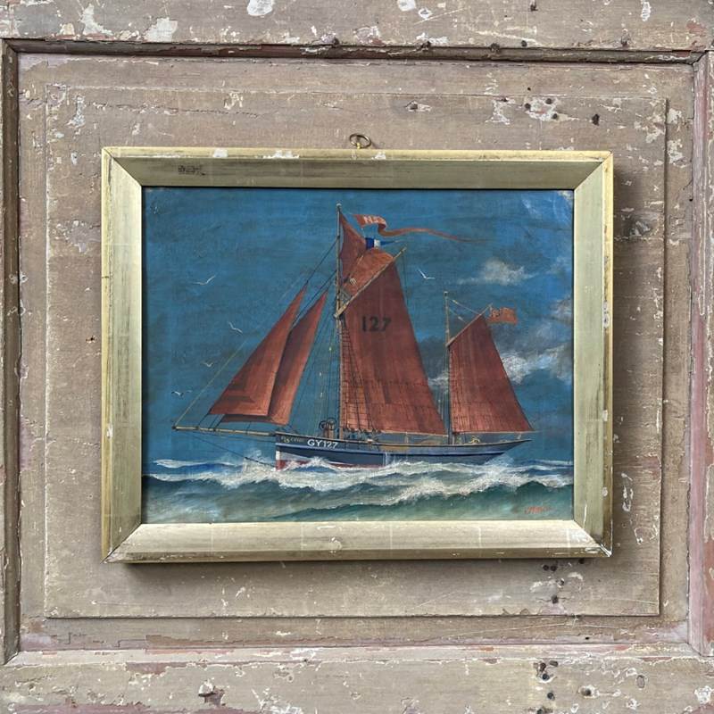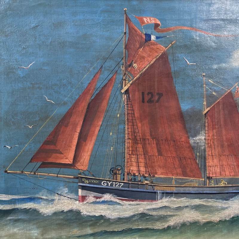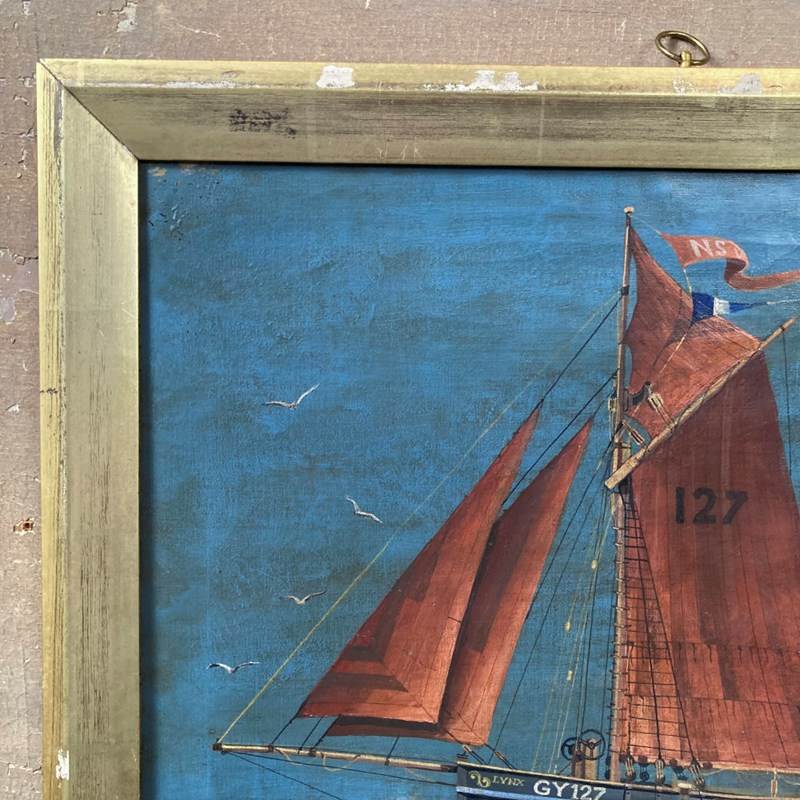 A naive British marine painting by J. Rodwell. This oil on canvas features the Grimsby fishing ketch LYNX GY127. The red canvas sails make this a particularly attractive painting, and perfect for a nautical-themed interior.