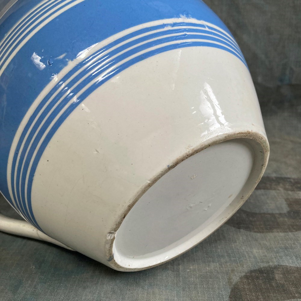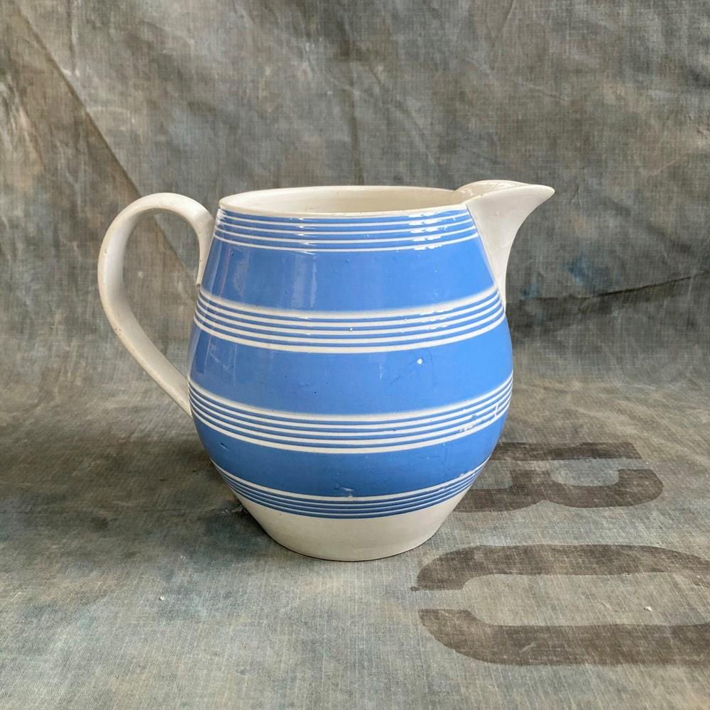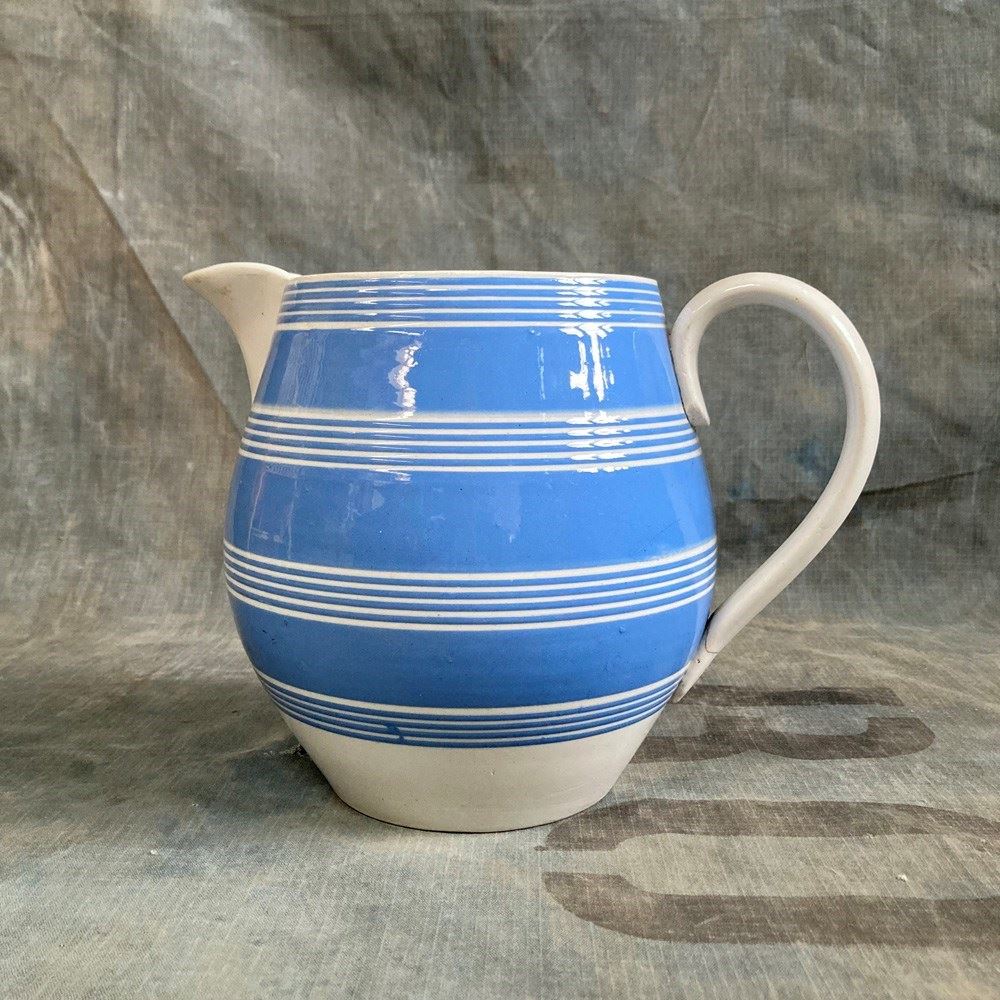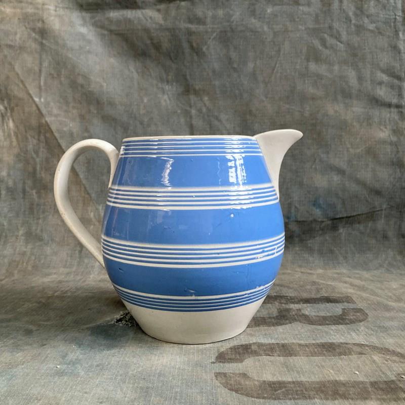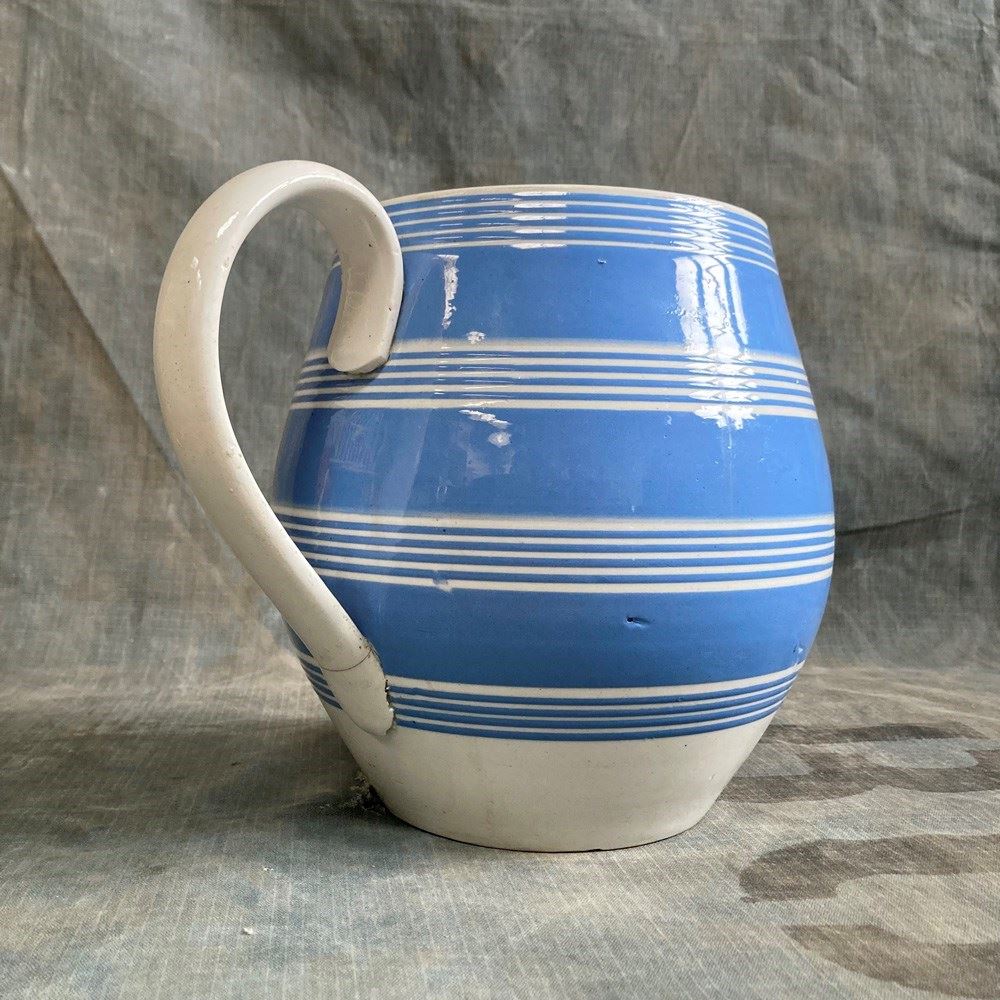 A large early 19th c. barrel shaped tavern jug, banded in blue slipware. In good condition for age, with no chips to spout or restored areas. Small hairline to base of handle but not very obvious, and not affecting its structure.