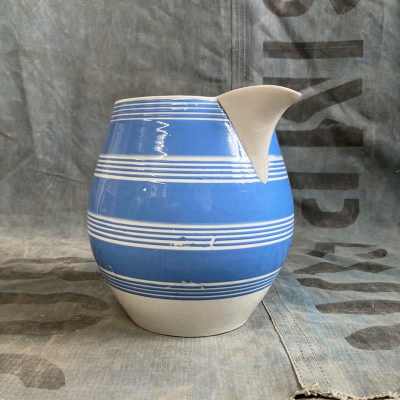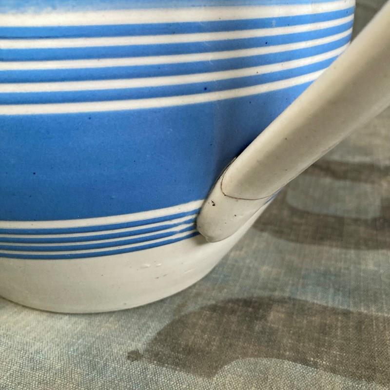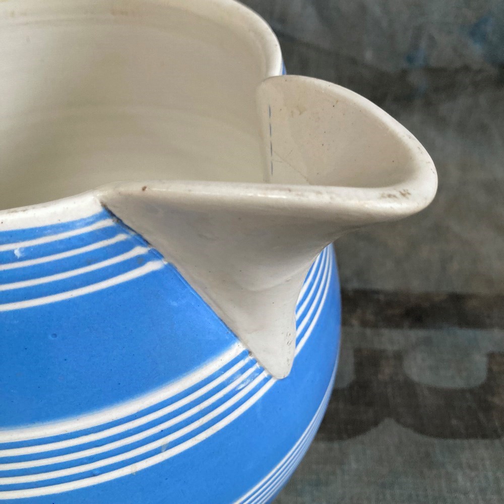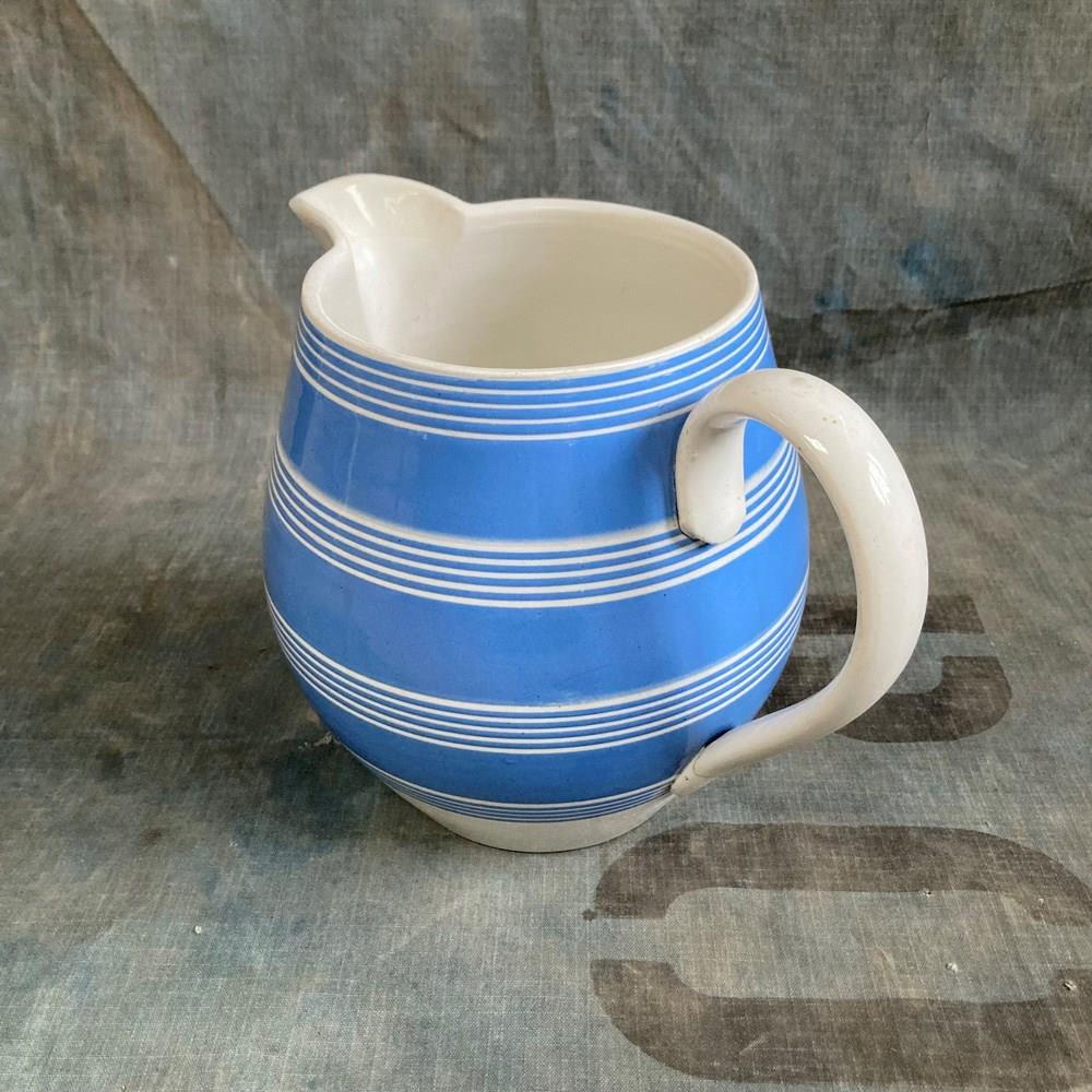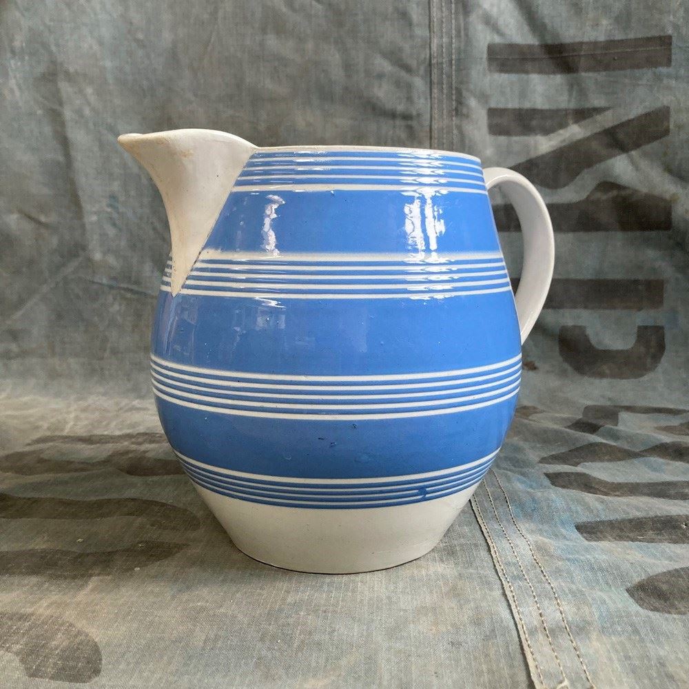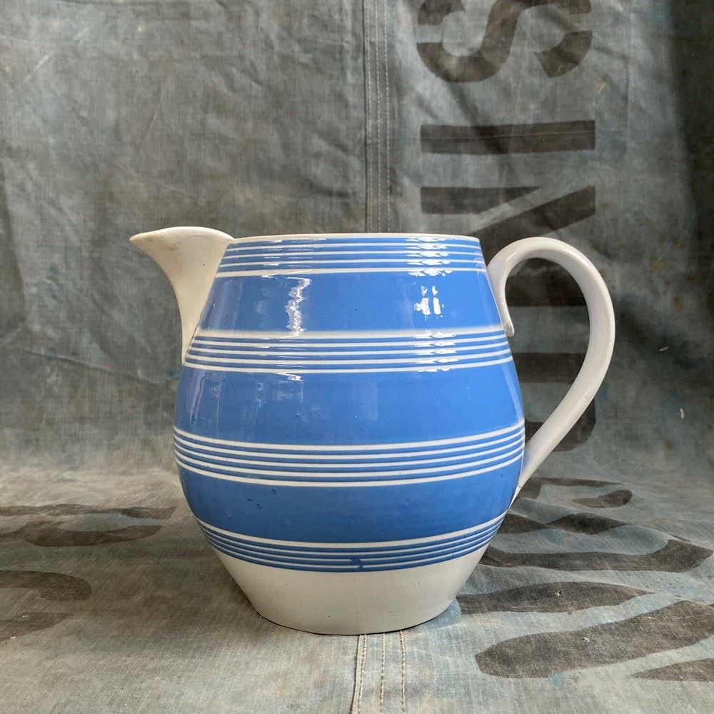 A large early 19th c. barrel shaped tavern jug, banded in blue slipware. In good condition for age, with no chips to spout or restored areas. Small hairline to base of handle but not very obvious, and not affecting its structure.