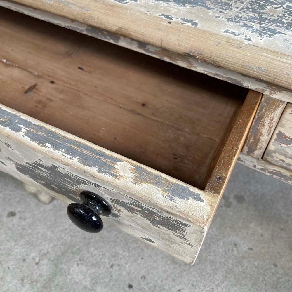 A late 19th century pine side table with a gorgeous 'bleached' look to it. Remnants of old grey paintwork, and original black porcelain knobs. Evidence of historic woodworm - as a precaution, this has been treated anyway. Slight warping to top surface. Drawers run smoothly.