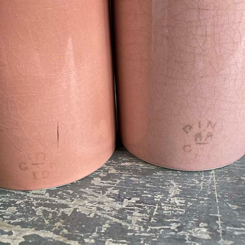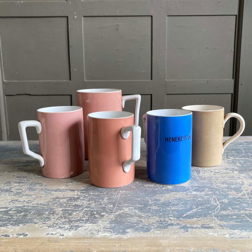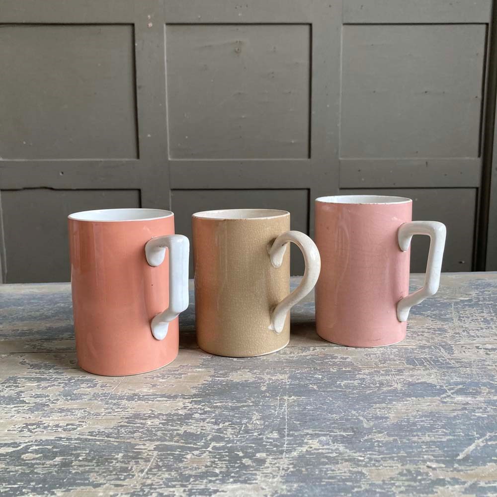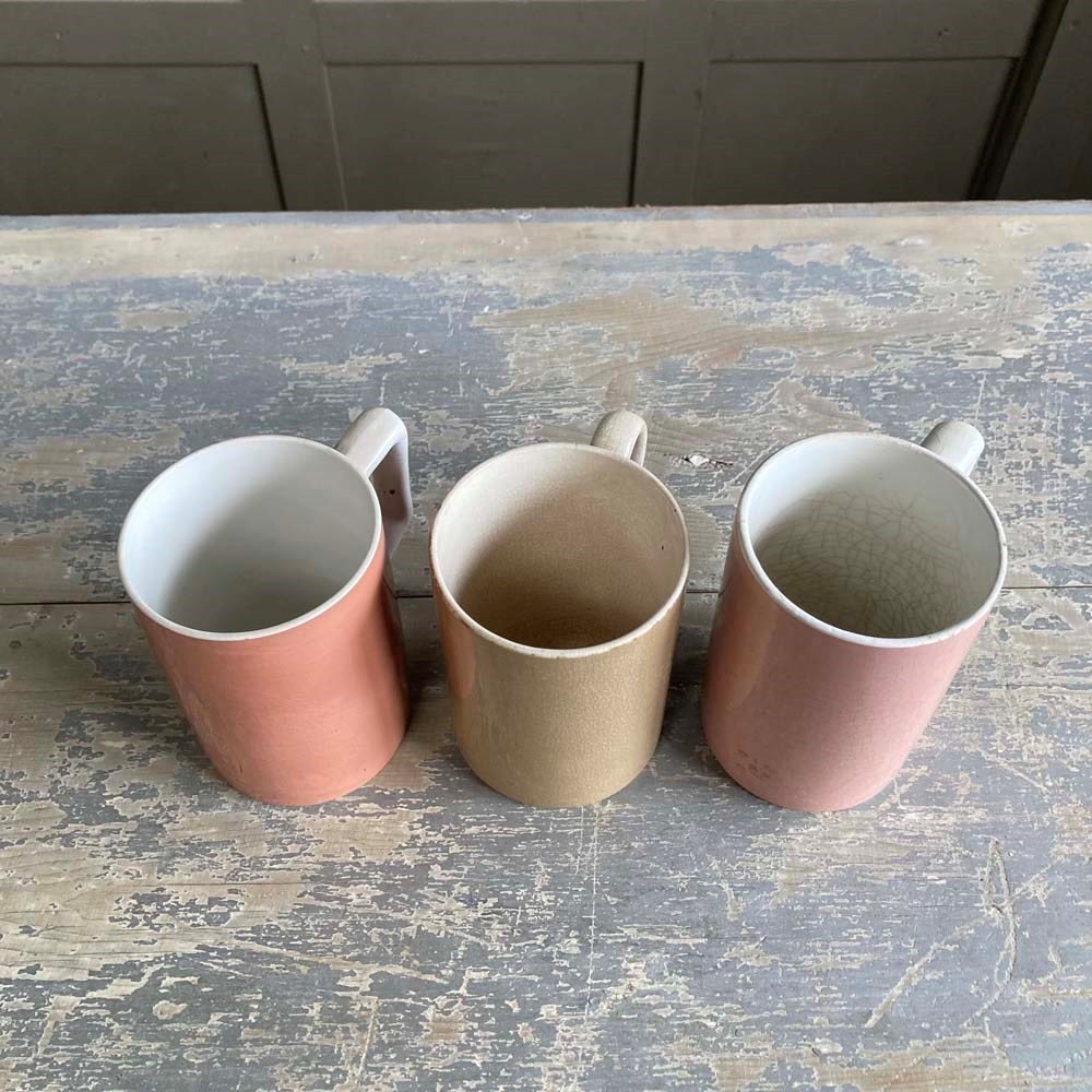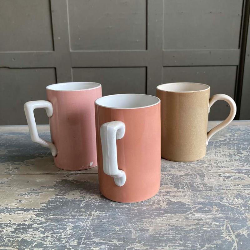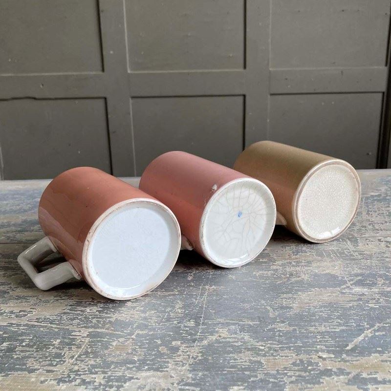 A group of three early 20th century glazed pottery mugs, produced for pubs and taverns for serving ale. These examples are in good condition with no chips or cracks. Some crazing to the glaze. Two of them still have their 'one pint' excise marks visible on their exteriors.