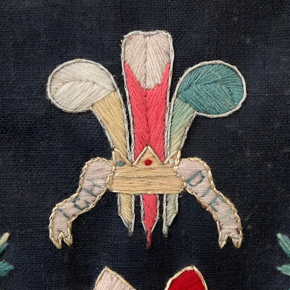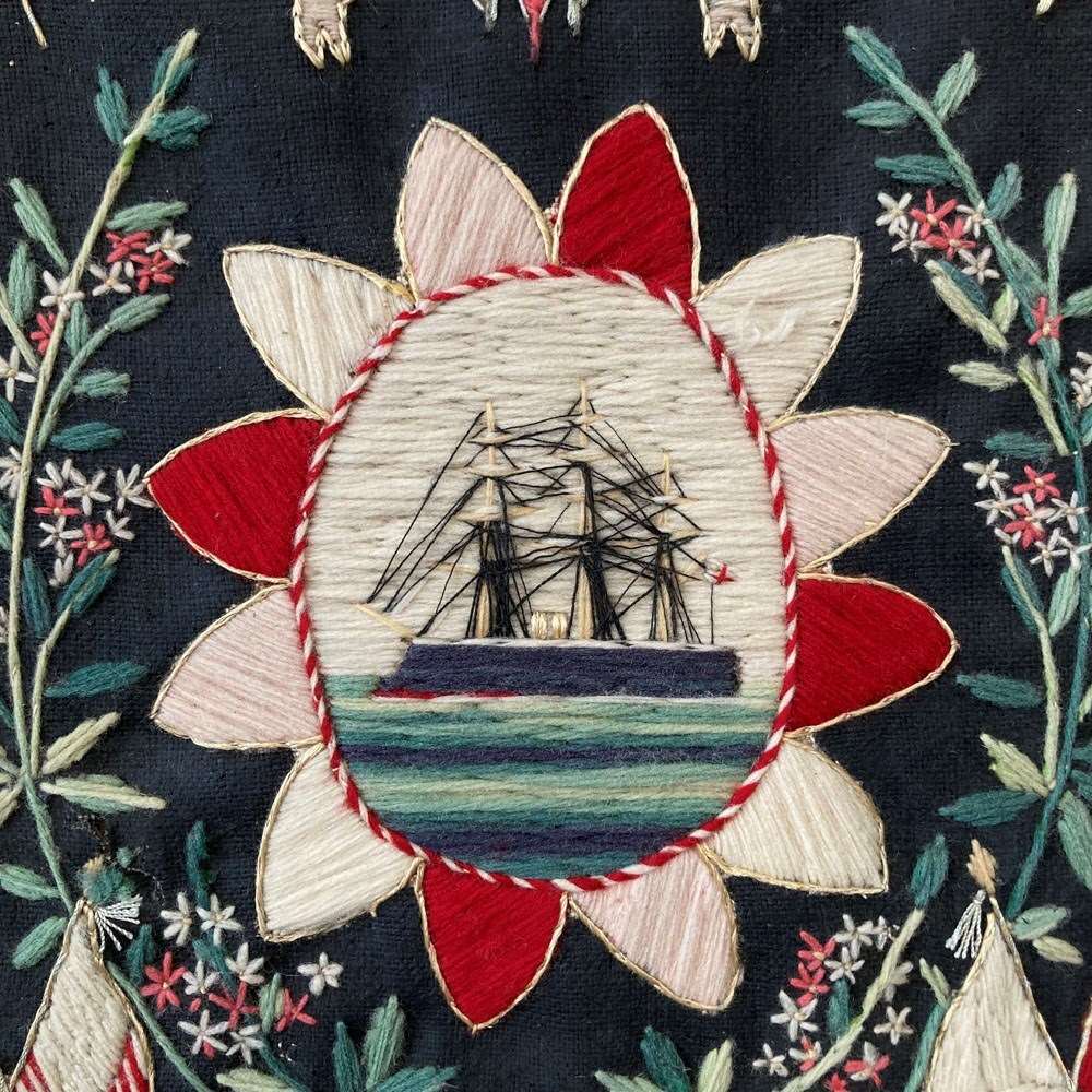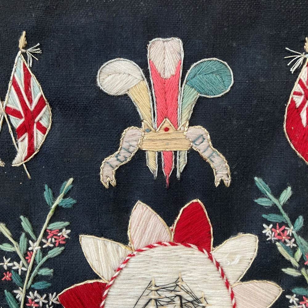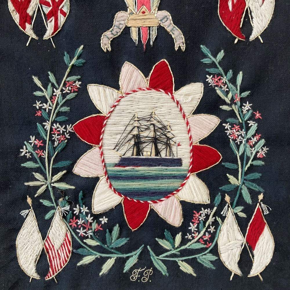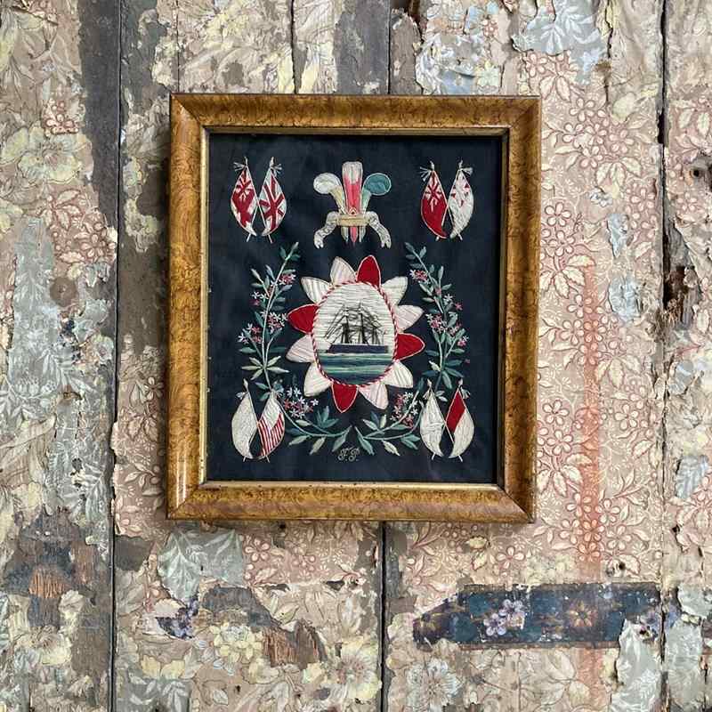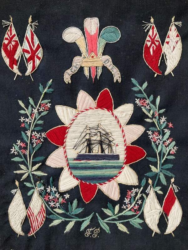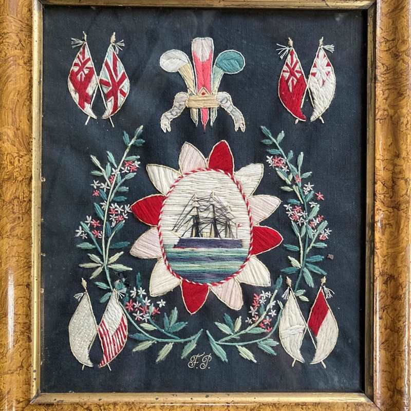 A late 19th c. sailor's woolwork, or 'woolie', featuring a British Naval Dreadnought battleship, surrounded by decorative floral sprigs, English and American flags, and the plumes of the British Prince of Wales. Signed with intials 'F.P.'. In good condition. Framed in a simulated maple frame.