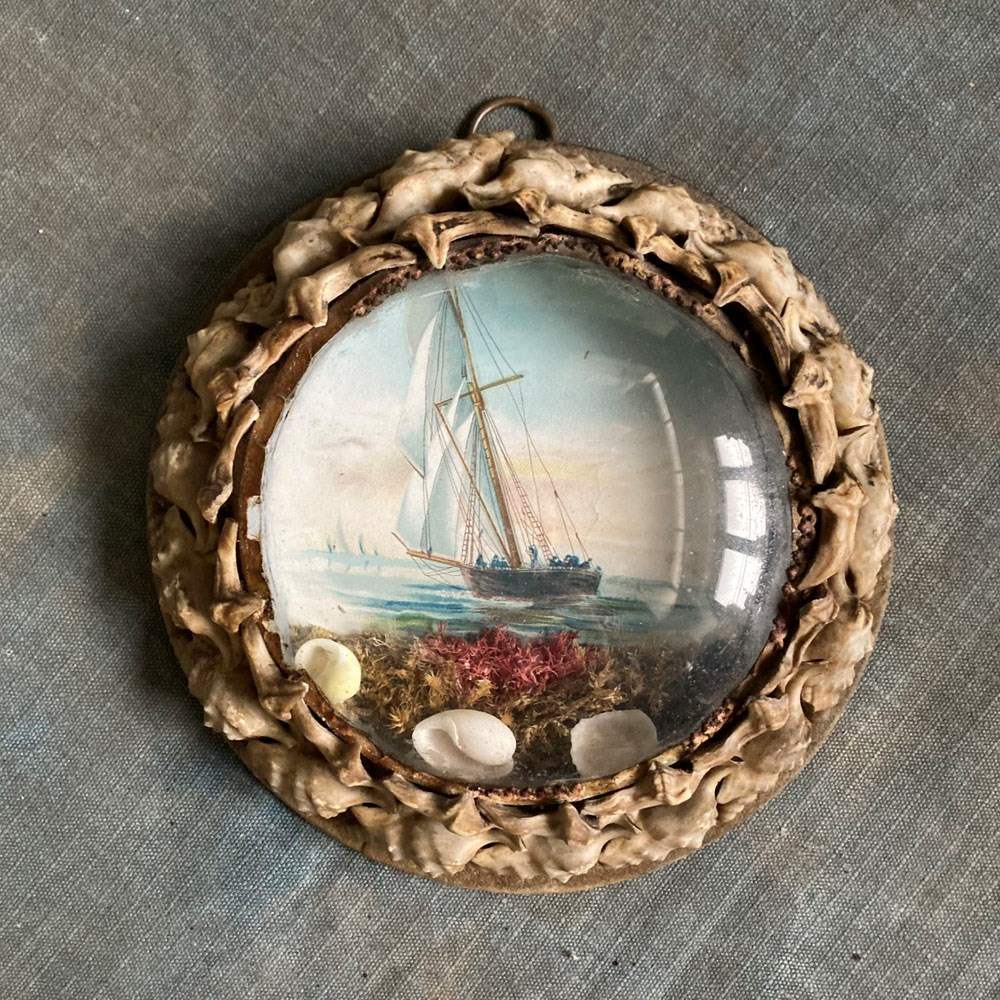 A small Edwardian round shellwork diorama featuring a sailing boat in sail. In front of this image is an artfully arranged display of shells, seaweed, and coral, creating a 3D effect to the view. In good condition, and ready to hang.
