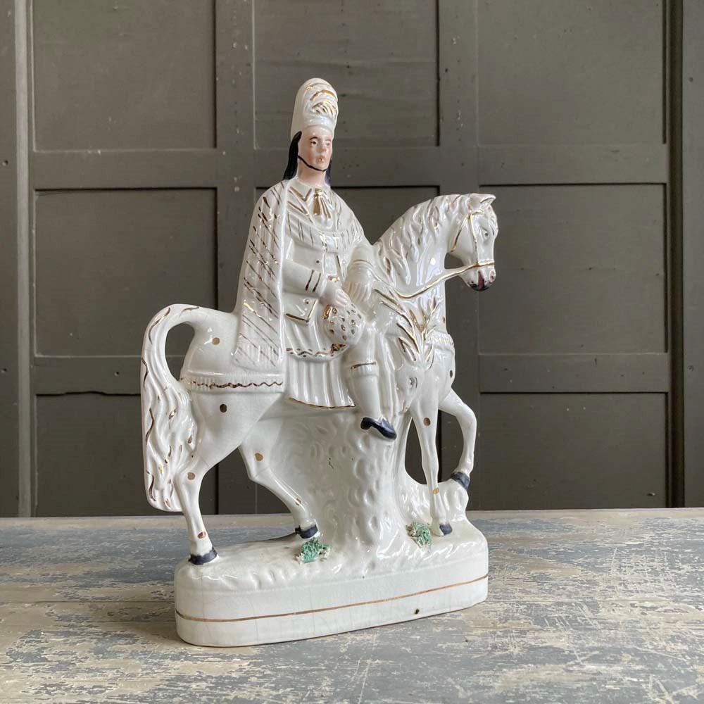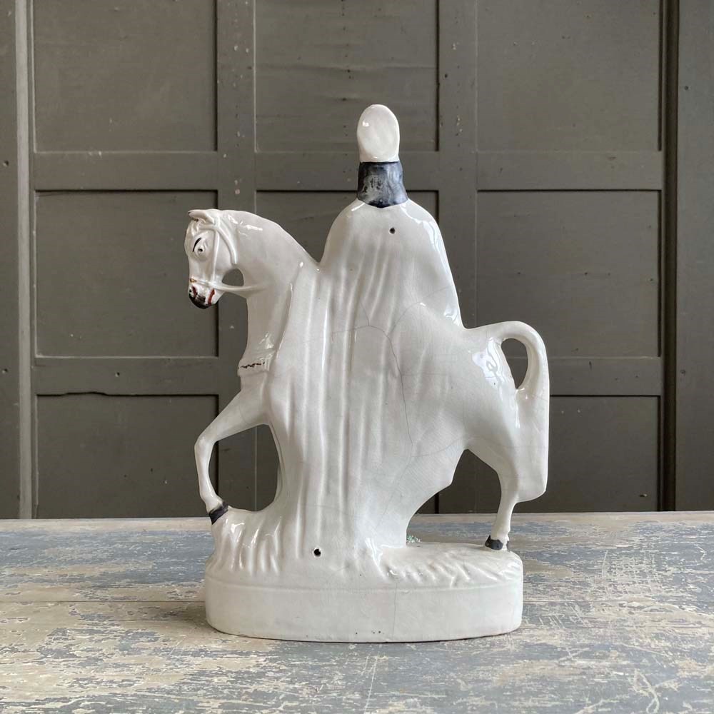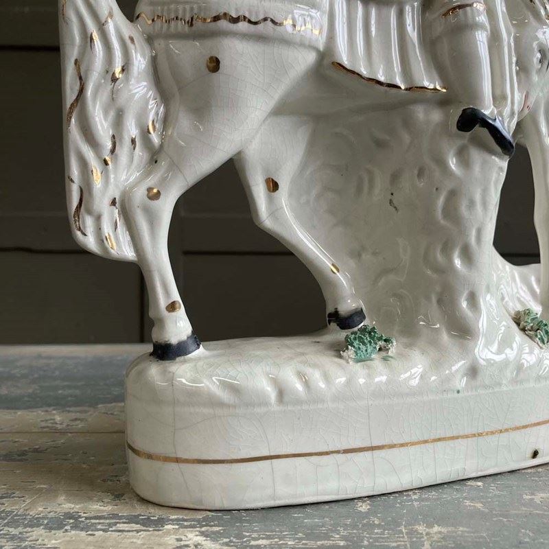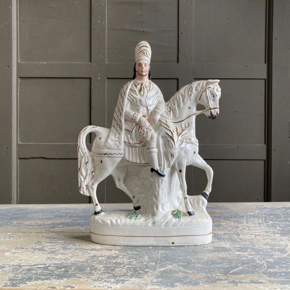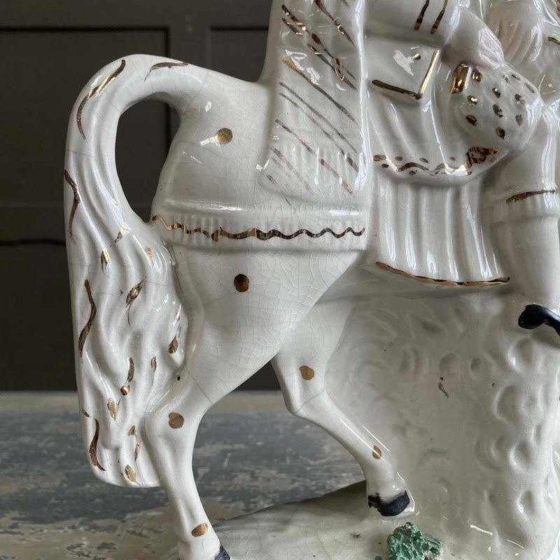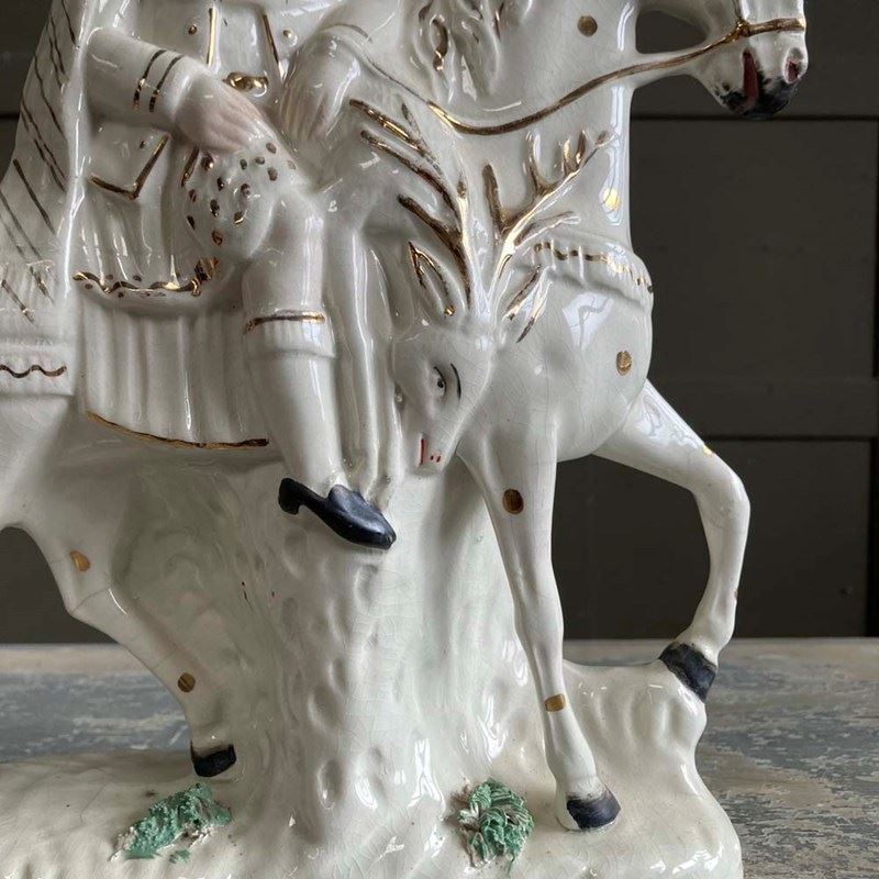 A large Staffordshire pottery group of a highlander on horseback. Hand-painted gilt decoration on a white ground. In good condition with no repairs. Some crazing to glaze on reverse.