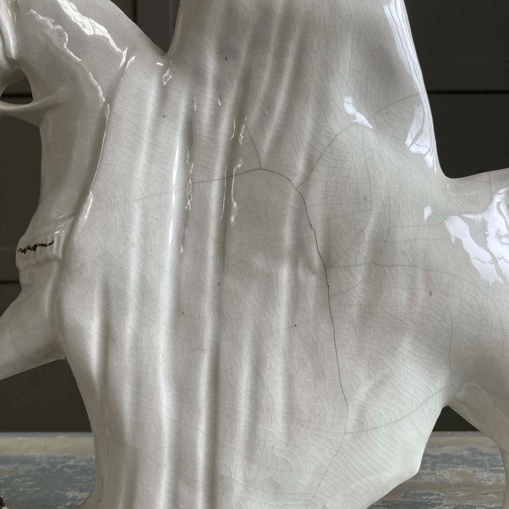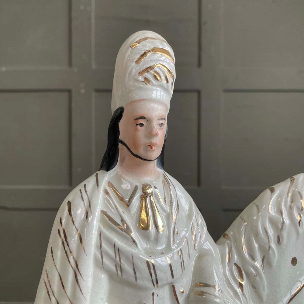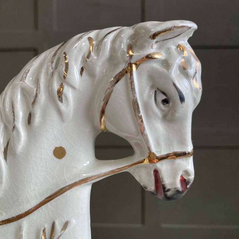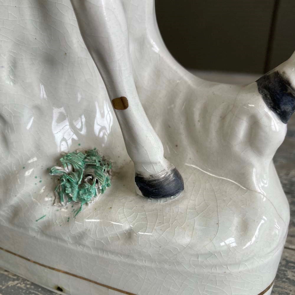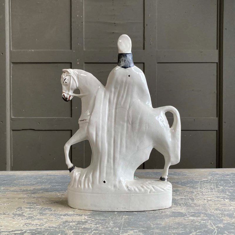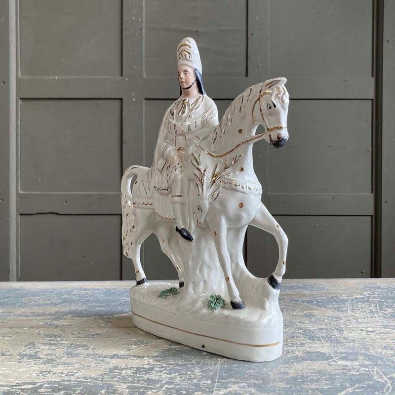 A large Staffordshire pottery group of a highlander on horseback. Hand-painted gilt decoration on a white ground. In good condition with no repairs. Some crazing to glaze on reverse.
