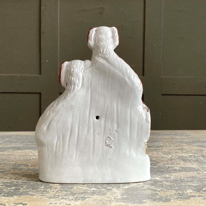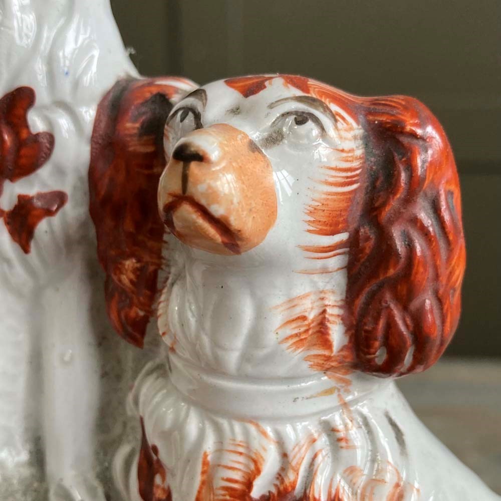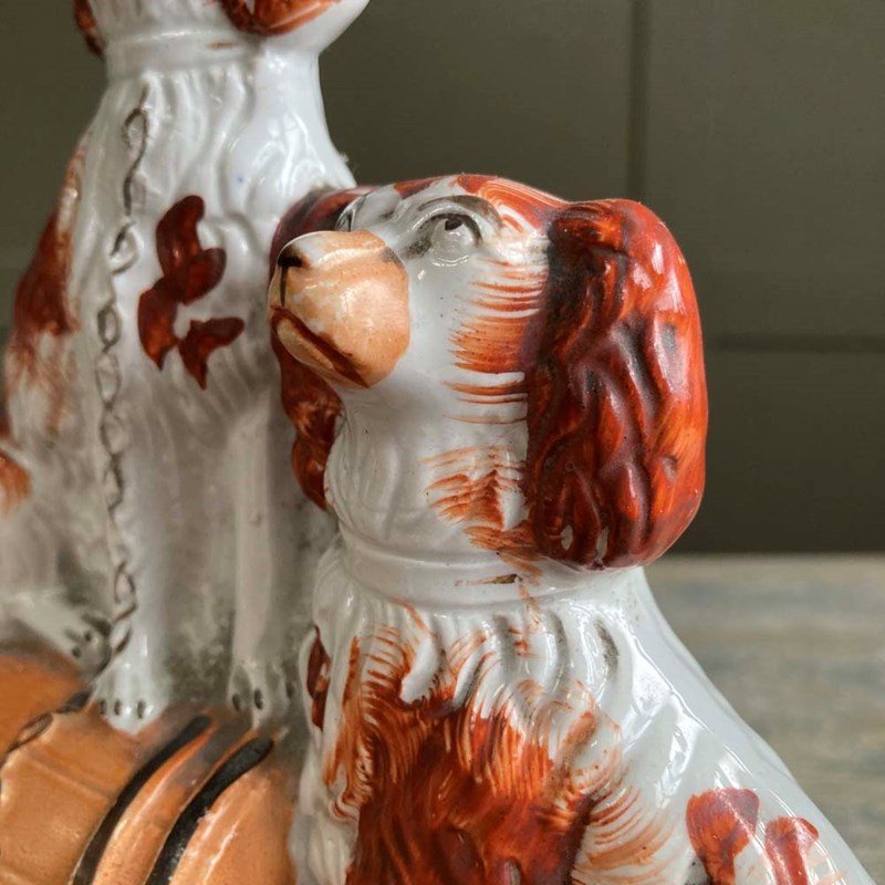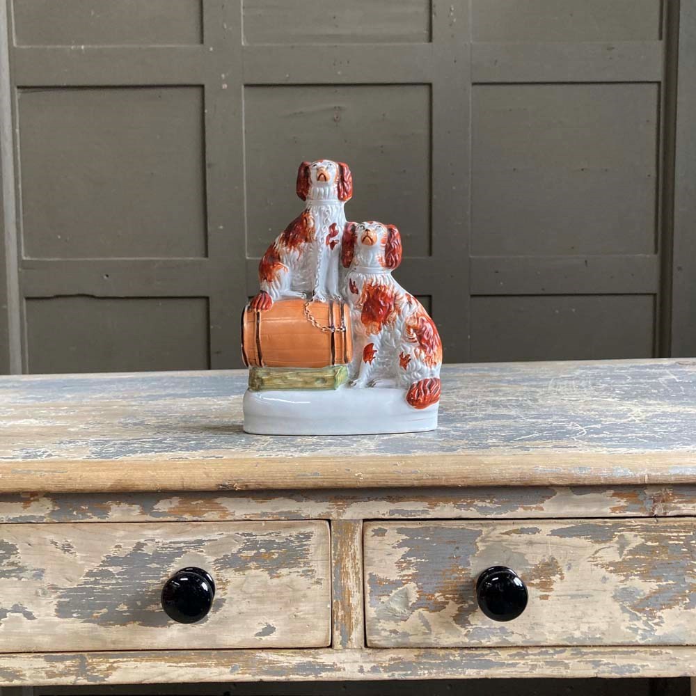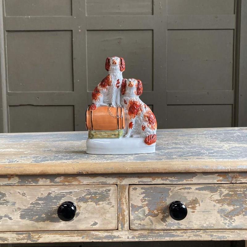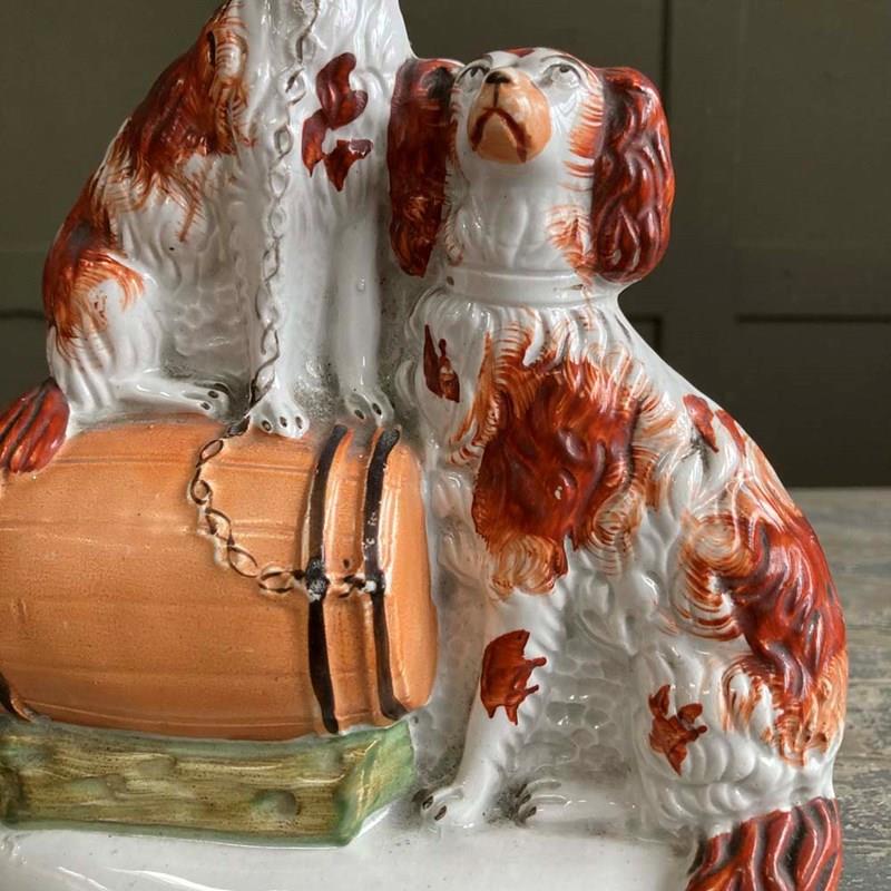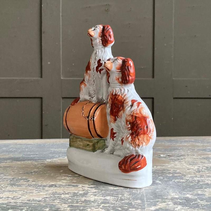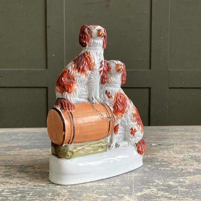 A lovely Staffordshire pottery group of two spaniels seated around a barrel. Nicely modelled with lots of relief detail, and sensitively hand-coloured. Good condition with no obvious damage.