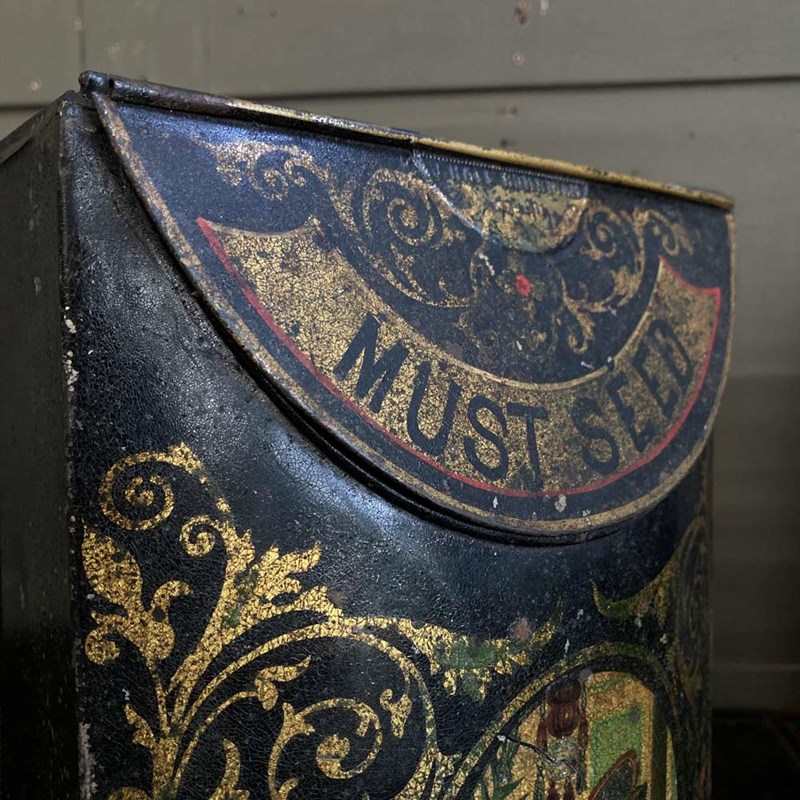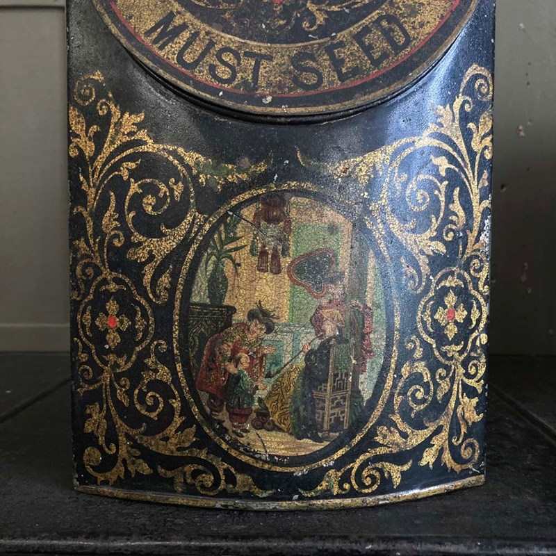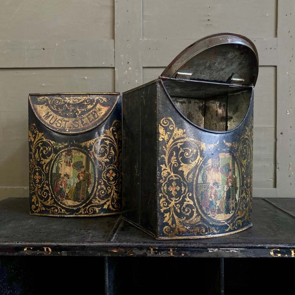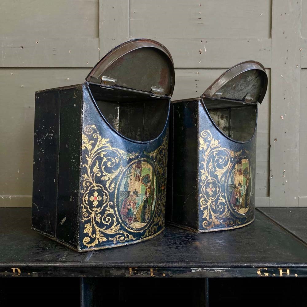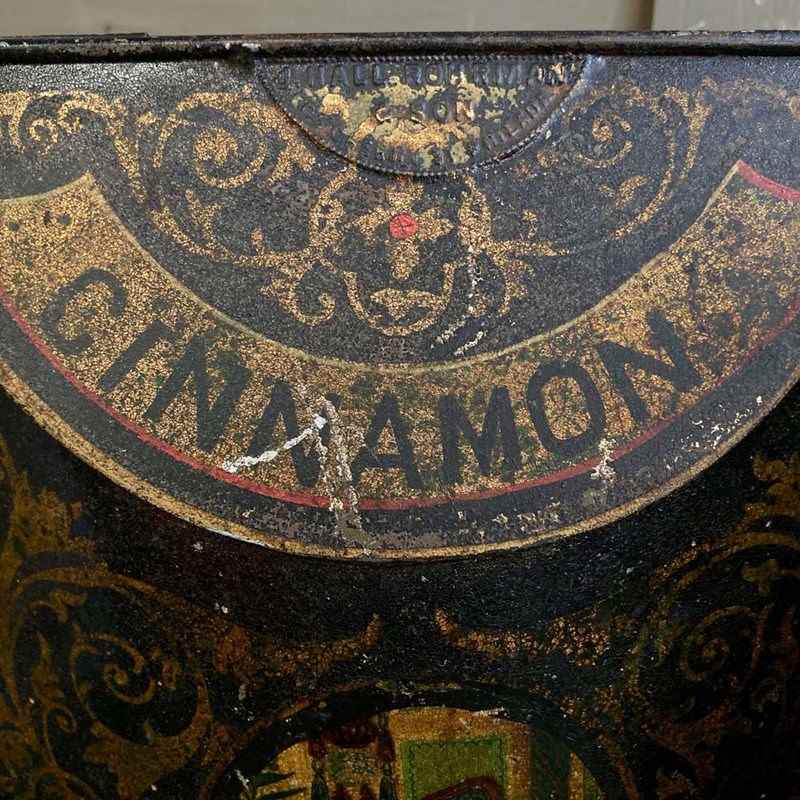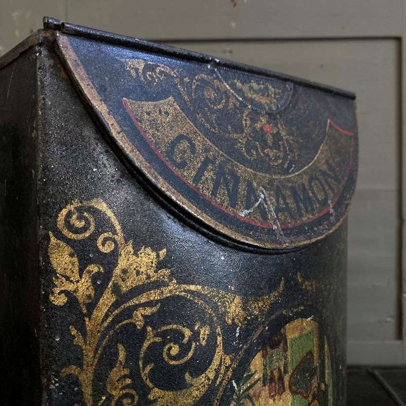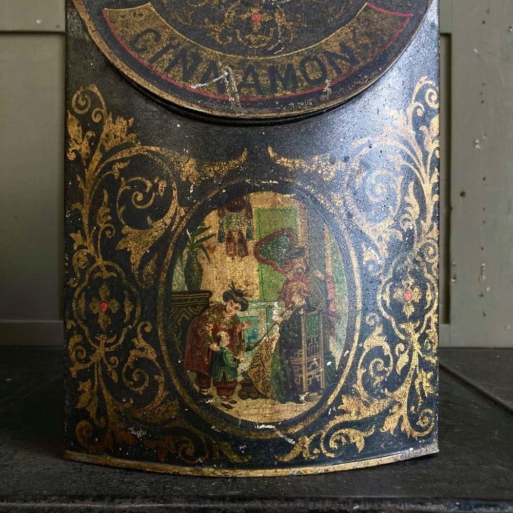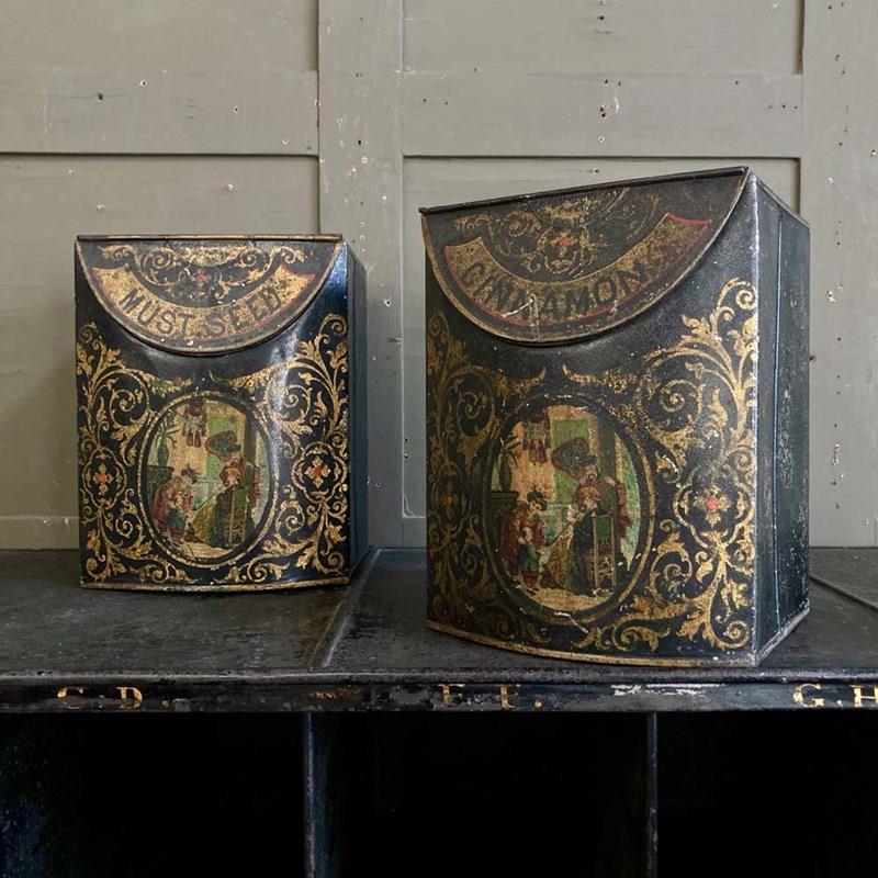 A pair of late 19th century grocer's shop spice tins decorated with chinoiserie motifs. In lovely condition for their age, with contents labels still perfectly readable. The maker's label attached to them is for 'J. Hall Rohrman & Son'.