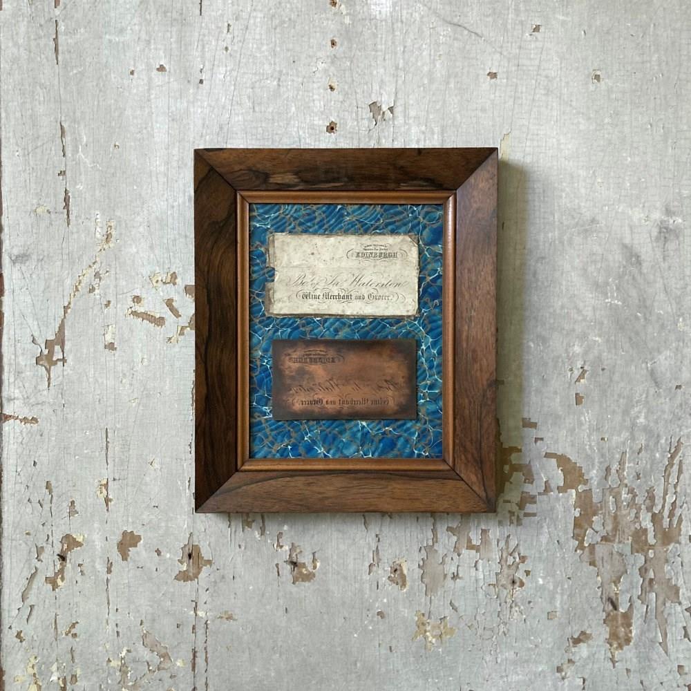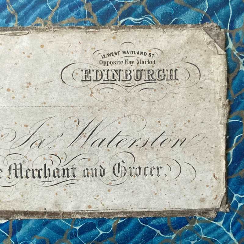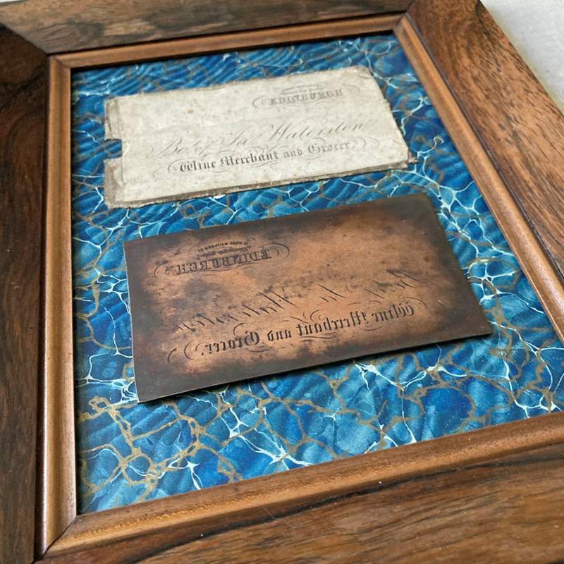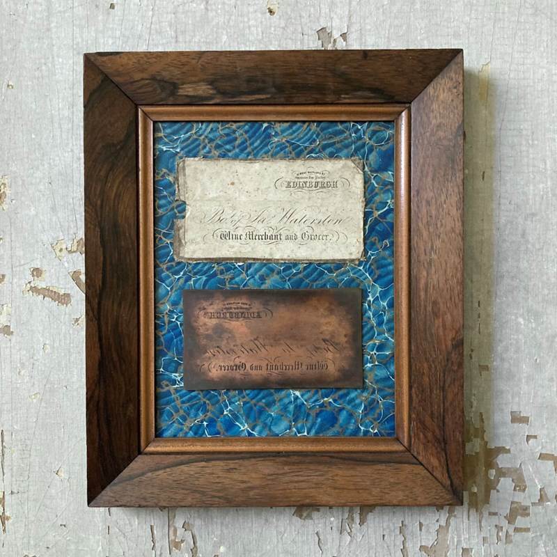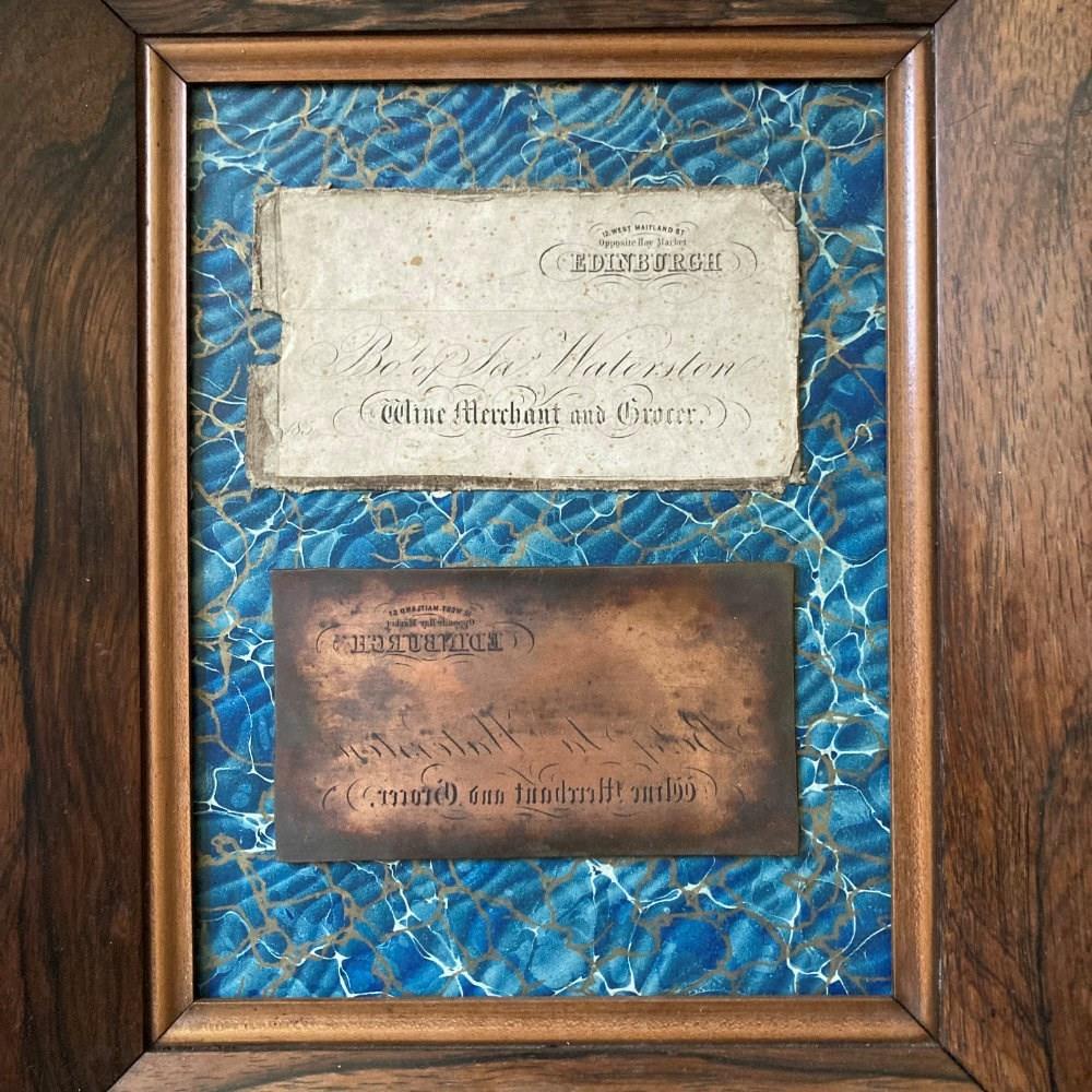 An original trade card for an Edinburgh wine merchant and grocer trading in the 1850s. It has been mounted on an antique marbled board along with its original engraved copper printing plate. Set within a period rosewood frame. No glass.