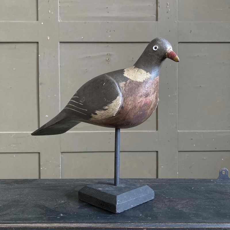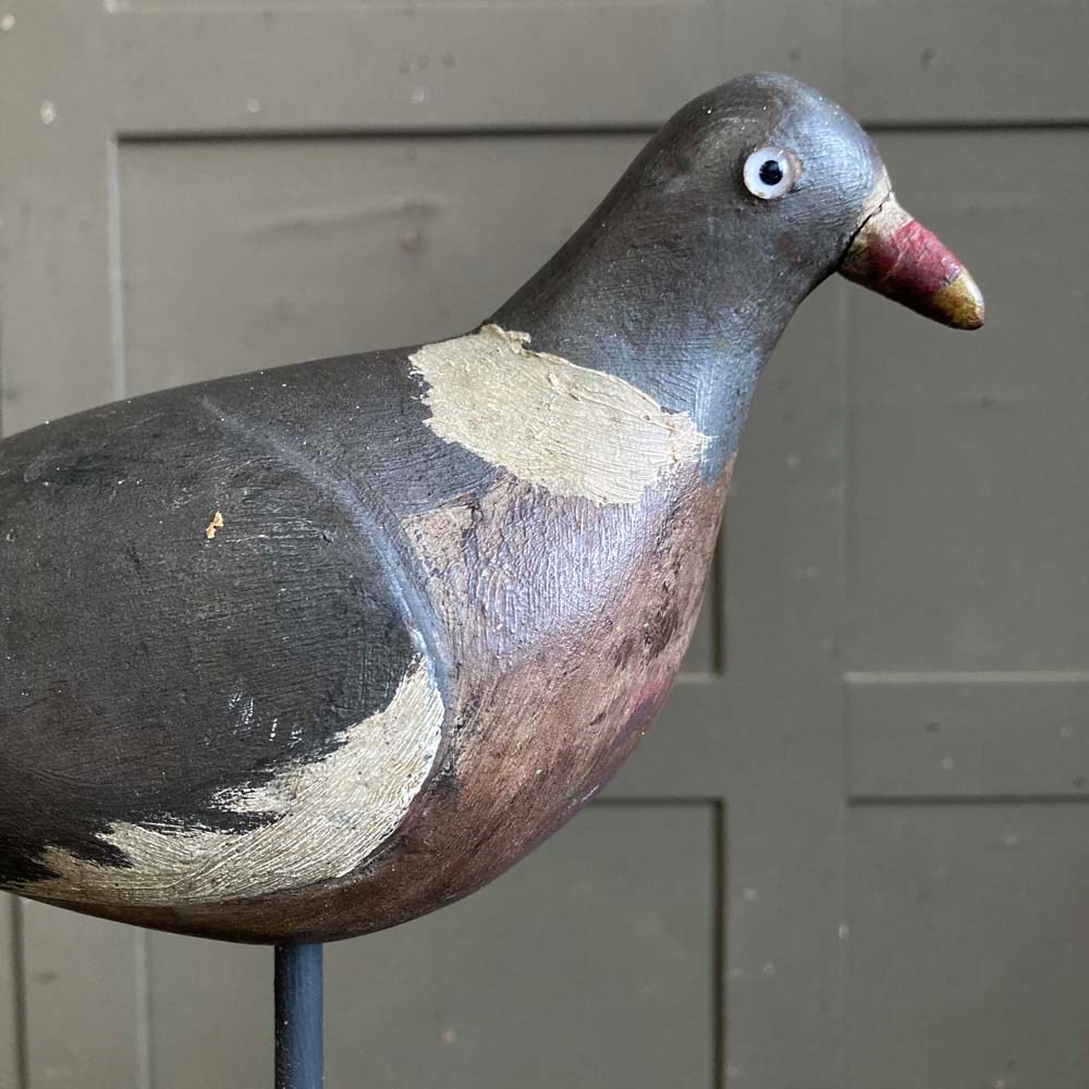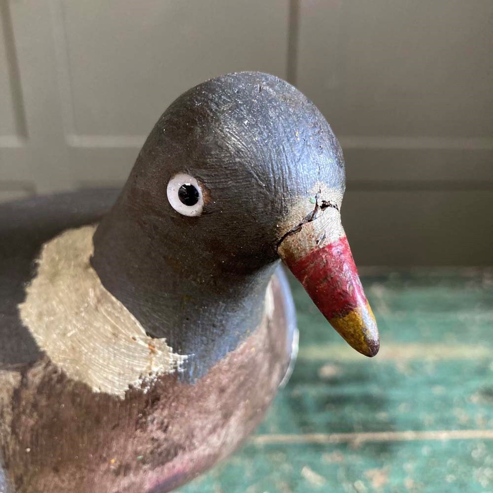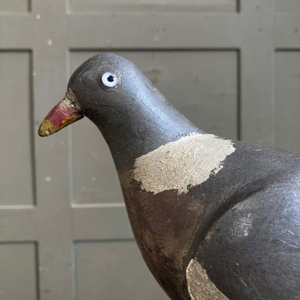 An early 20th century carved wood wild pigeon decoy. A lovely example attributed to Norfolk-based James Rolph. His father, Francis Rolph, is reputed to have been carving pigeon decoys as early as 1880. This example shows signs of use as a working decoy but retains much of its original paint finish, as well as its beak and glass eyes. Very good condition.
