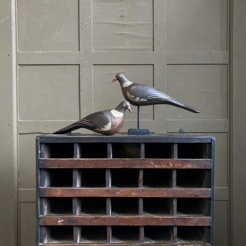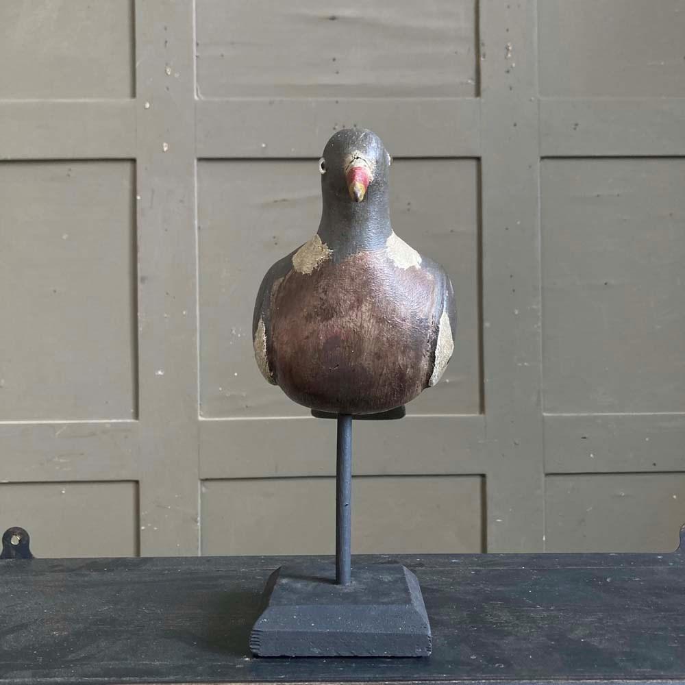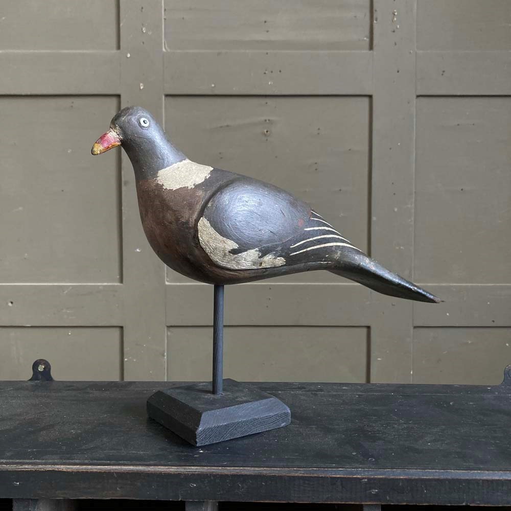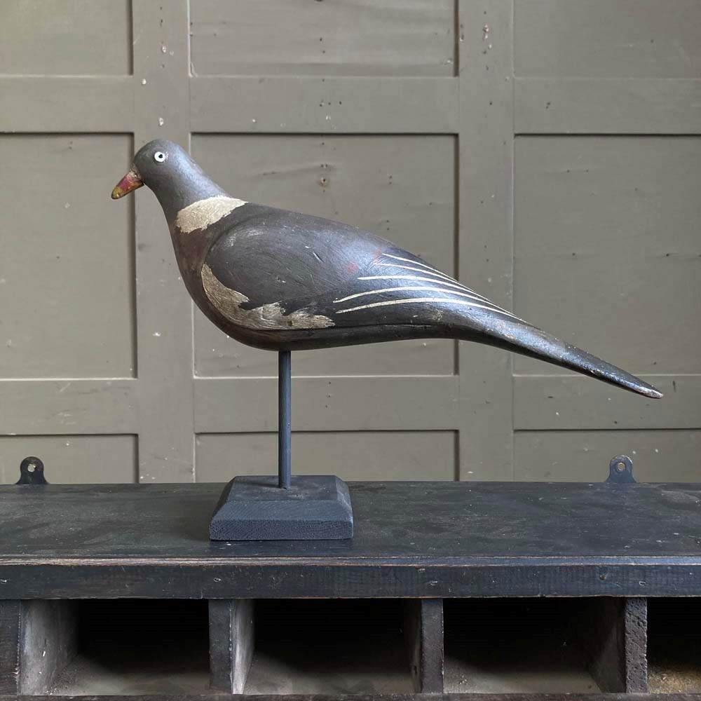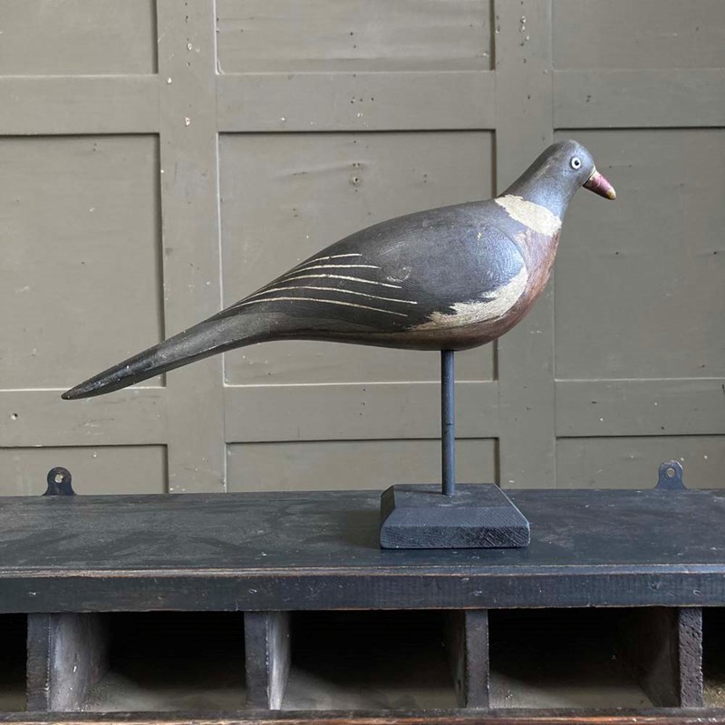 An early 20th century carved wood wild pigeon decoy. A lovely example attributed to Norfolk-based James Rolph. His father, Francis Rolph, is reputed to have been carving pigeon decoys as early as 1880. This example shows signs of use as a working decoy but retains much of its original paint finish, as well as its beak and glass eyes. Very good condition.
