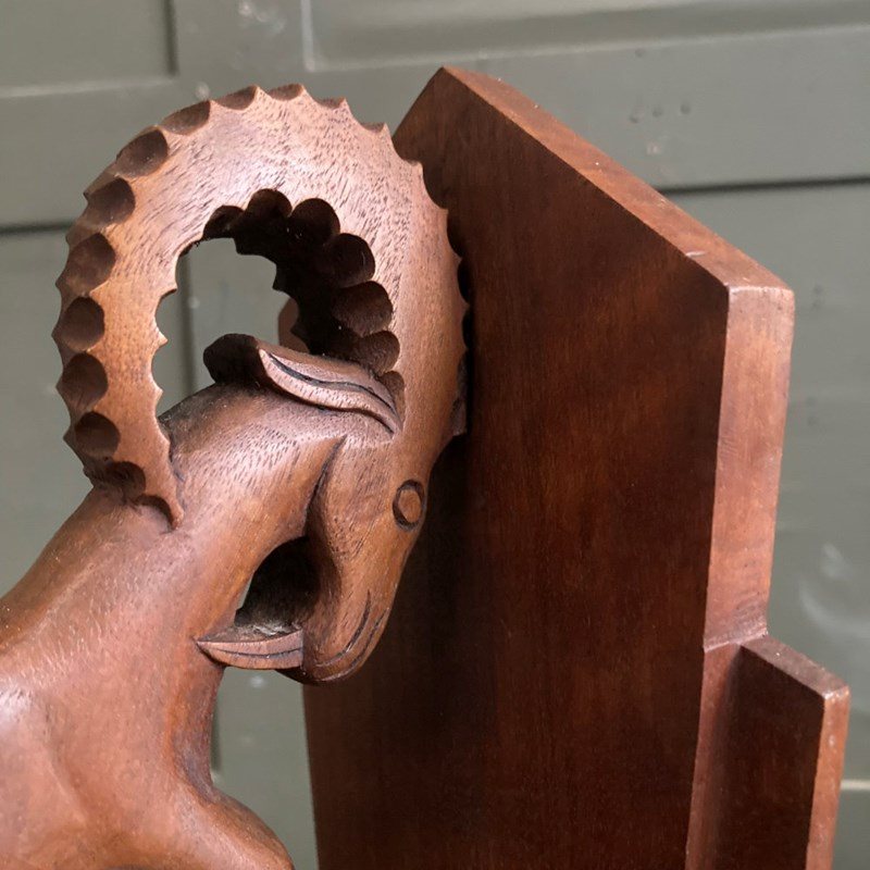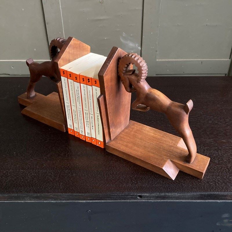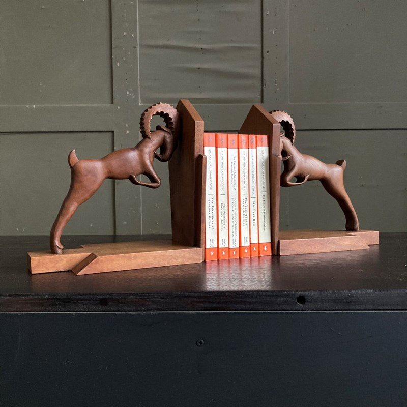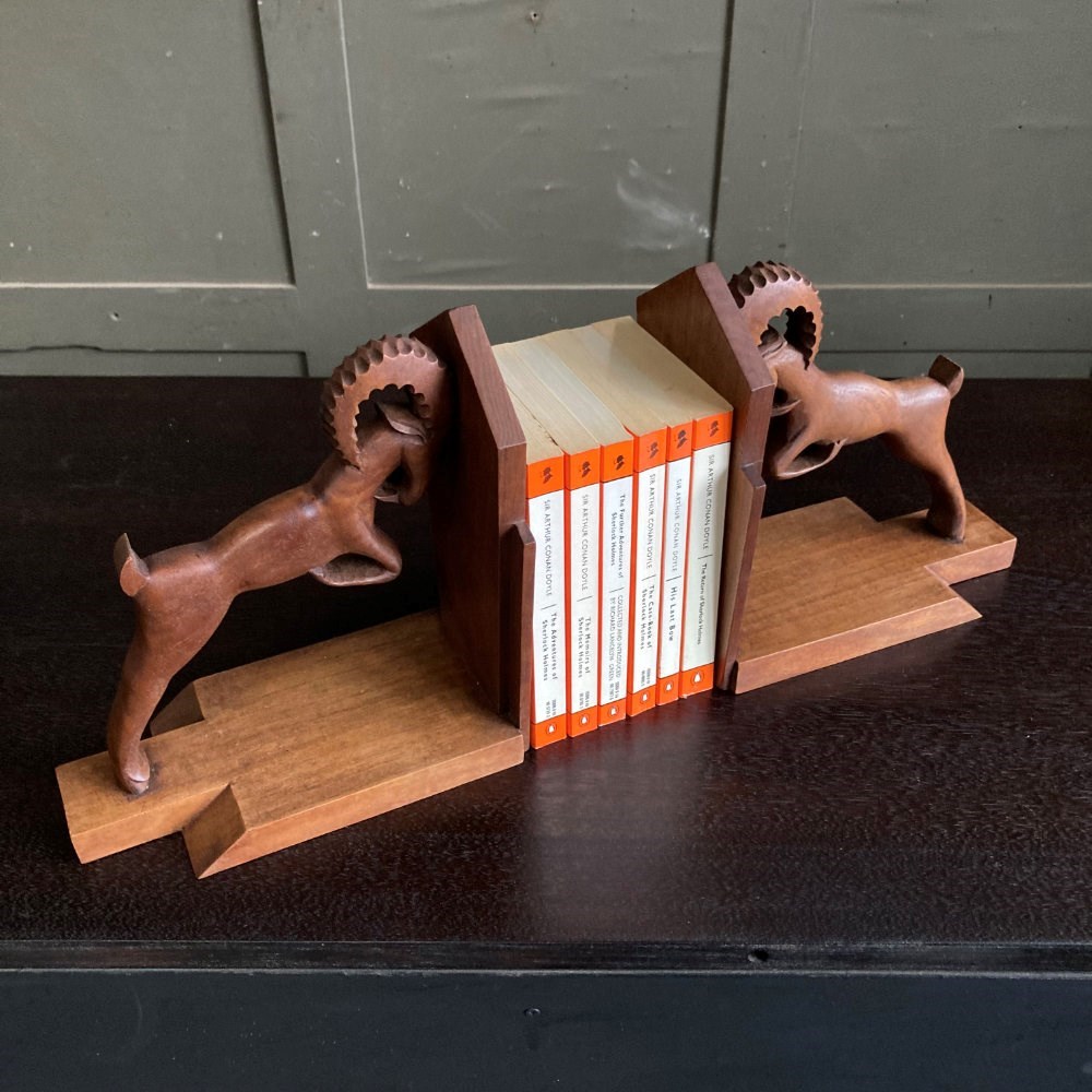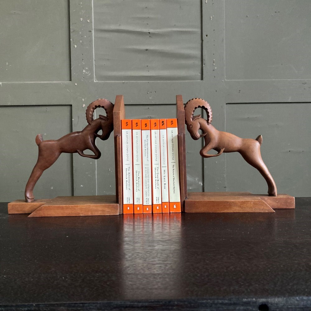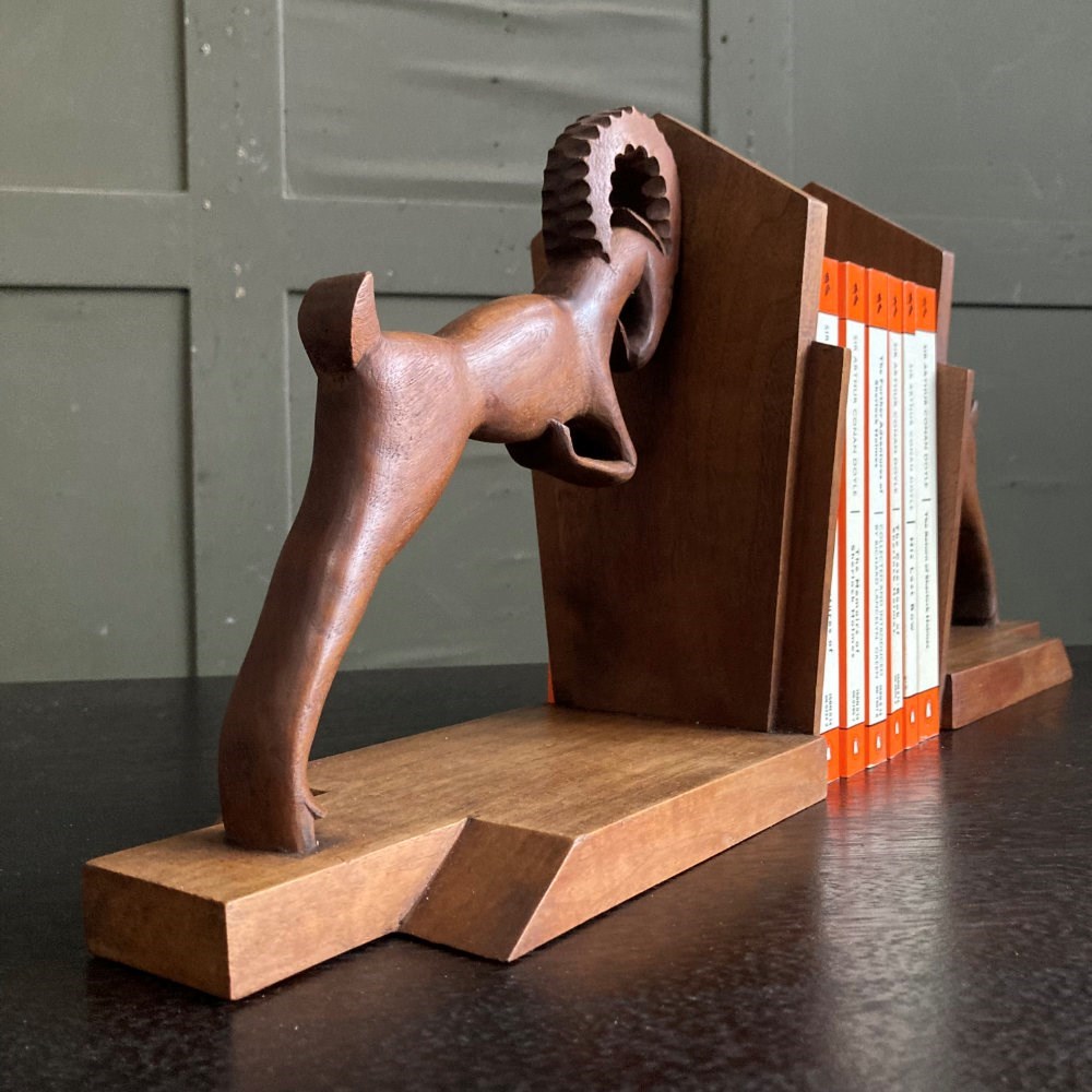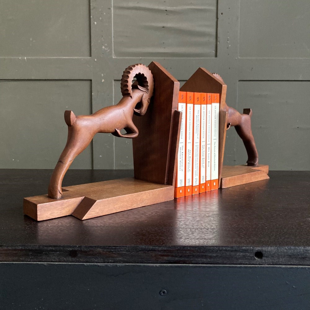 A large pair of carved wood bookends, featuring stylised ibex, on Art Deco-inspired plinths. Both the scale and the graphic qualities of these book supports makes them particularly striking.