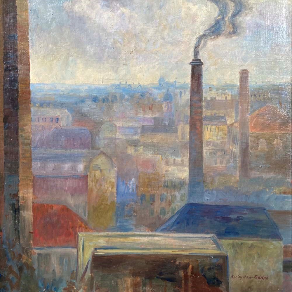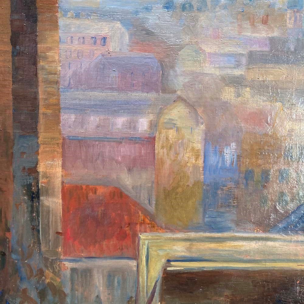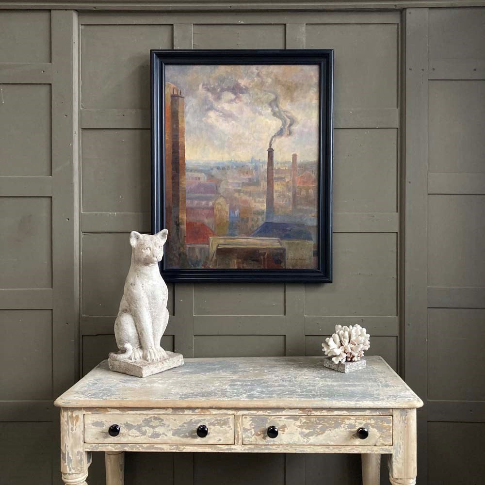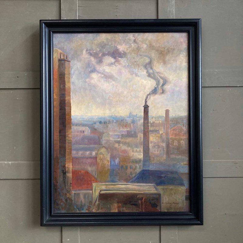 An entrancing mid-20th century oil on canvas landscape painting by the Swedish artist Brita von Sydow-Södöö (1884–1959). The subject matter appears to be a view from a window of the sprawling roof tops and chimneys of a city. The painting is beautifully composed with industrial chimney stacks framing the lower buildings in the scene, and providing perspective to the picture. The colour palette of mauves and purples in the distance, and the use of warmer hues in the foreground also add to its visual depth and intrigue. The painting is in lovely condition, and ready to hang.