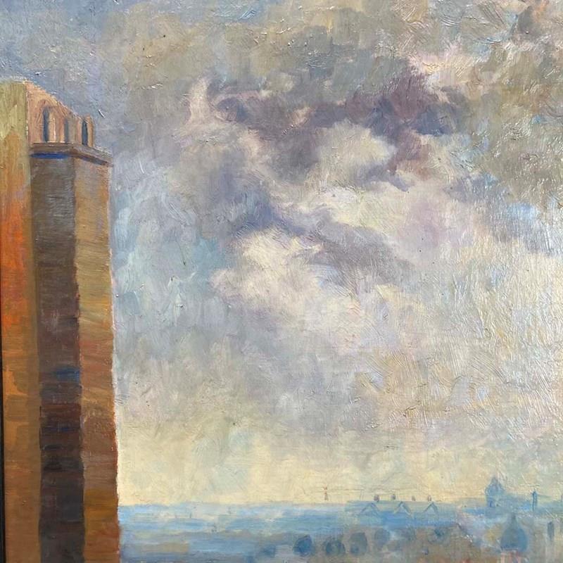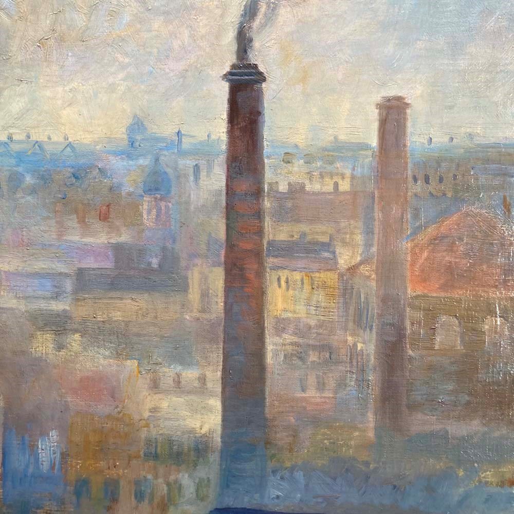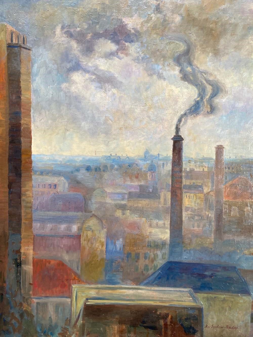 An entrancing mid-20th century oil on canvas landscape painting by the Swedish artist Brita von Sydow-Södöö (1884–1959). The subject matter appears to be a view from a window of the sprawling roof tops and chimneys of a city. The painting is beautifully composed with industrial chimney stacks framing the lower buildings in the scene, and providing perspective to the picture. The colour palette of mauves and purples in the distance, and the use of warmer hues in the foreground also add to its visual depth and intrigue. The painting is in lovely condition, and ready to hang.
