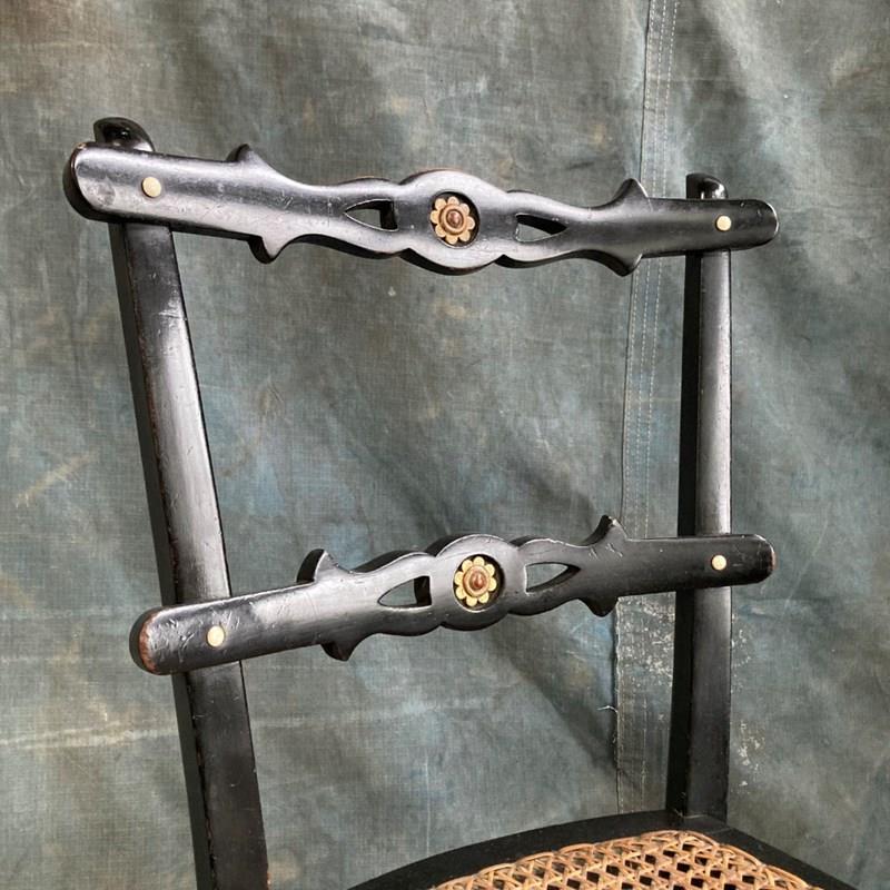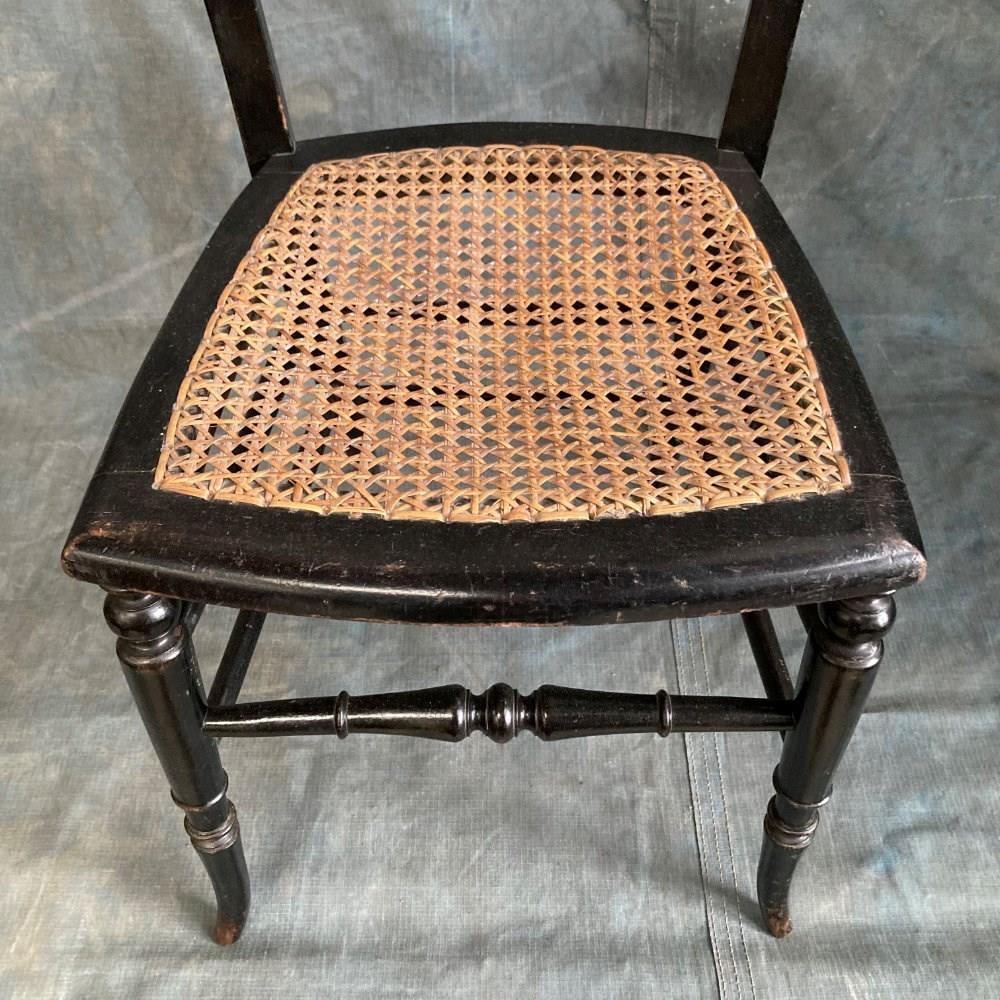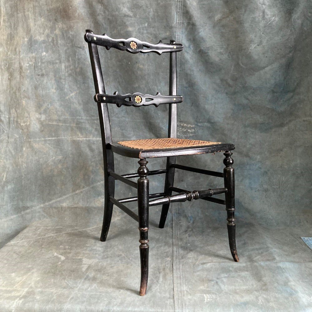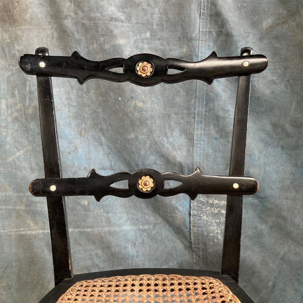 A late 19th century ebonised bedroom chair with influences from the Aesthetic Movement. The back rest bars incorporate inset bone 'dots', and carved and gilded stylised sunflower motifs. Double stretchers between the legs at the back and sides means this little chair has kept its sturdyness. Cane seat in good order. Overall a very pretty chair. Seat height 42cm.