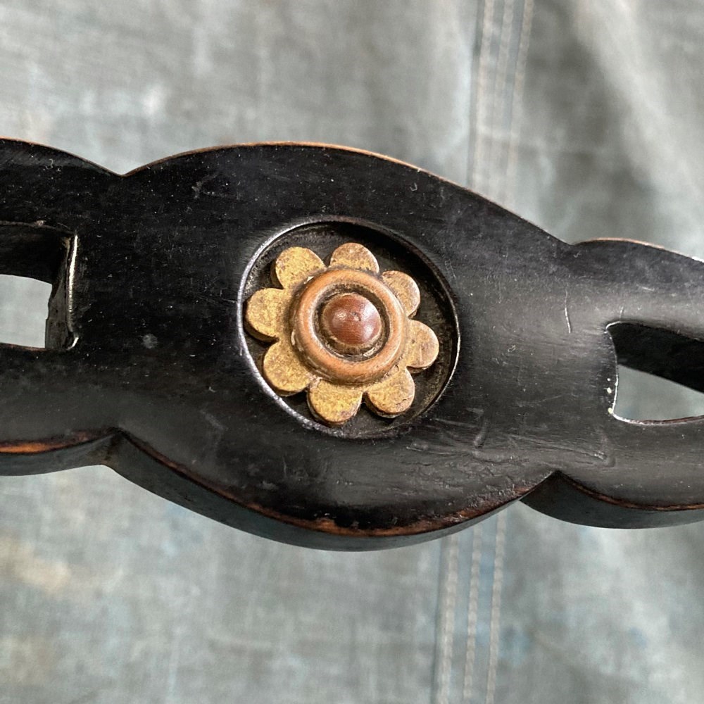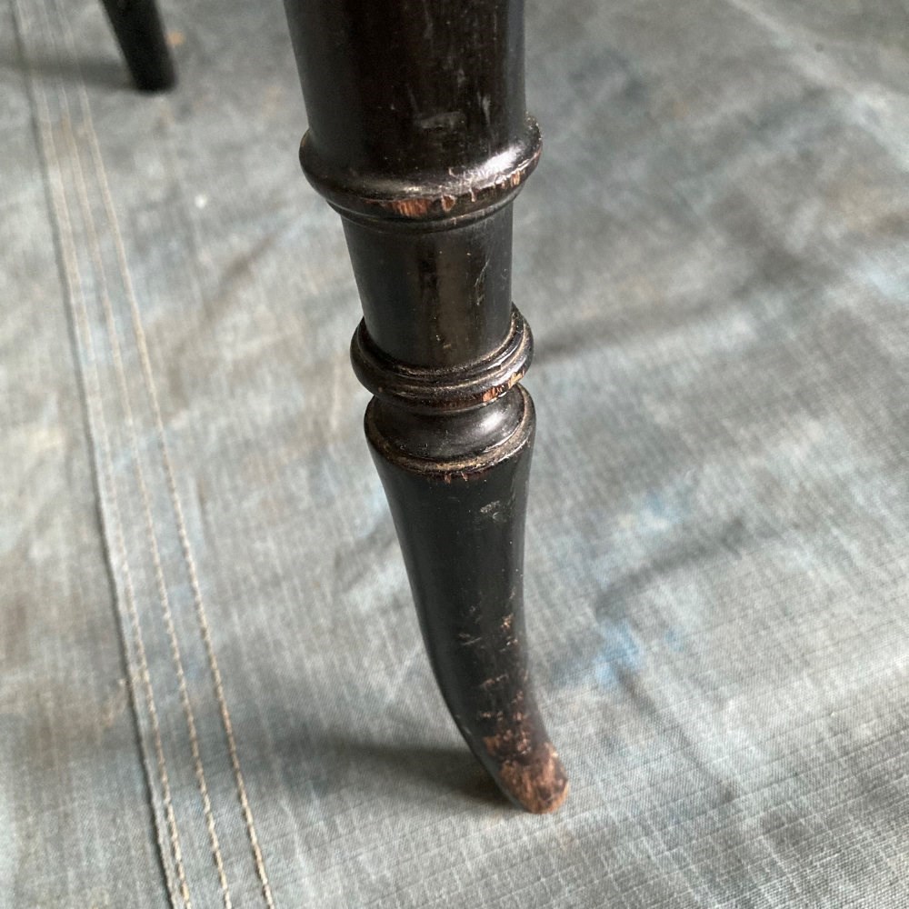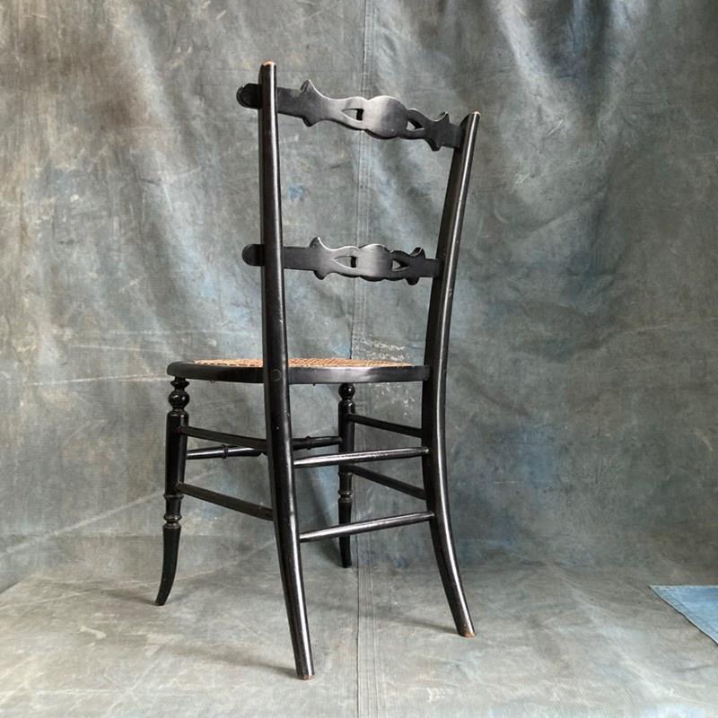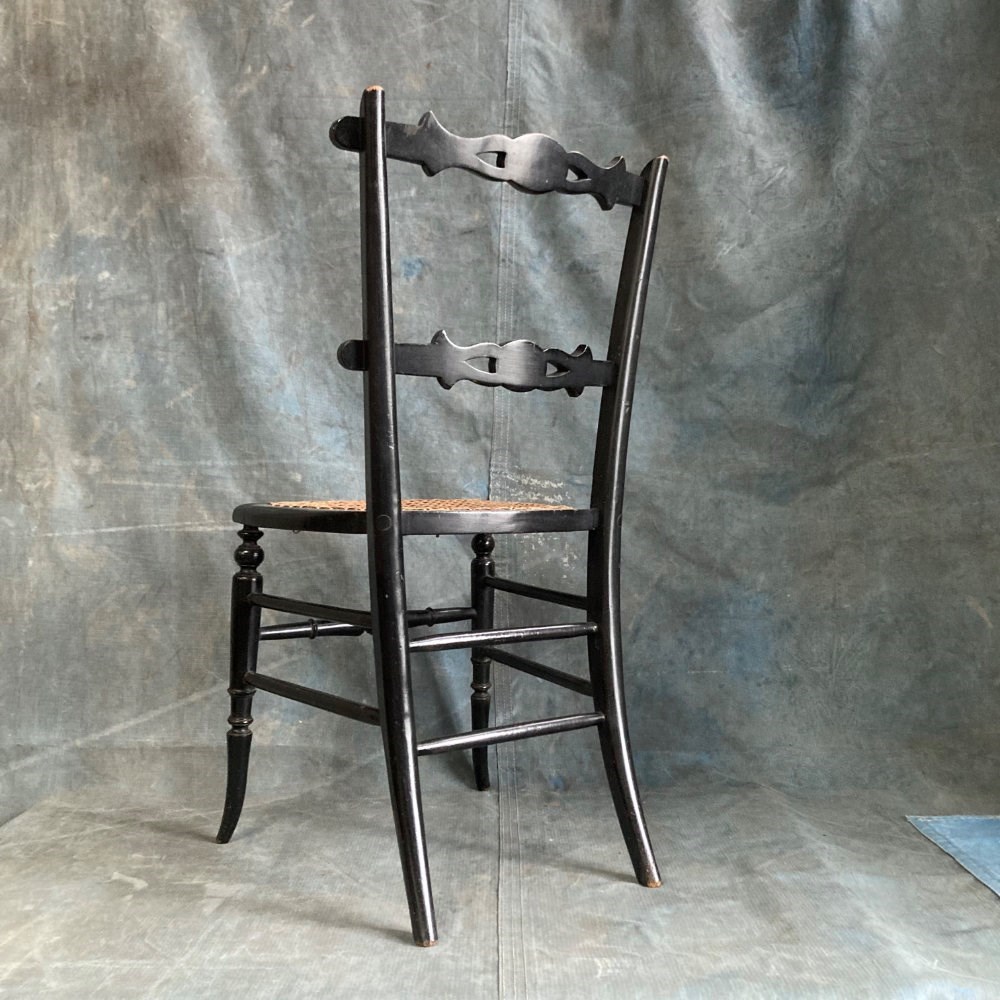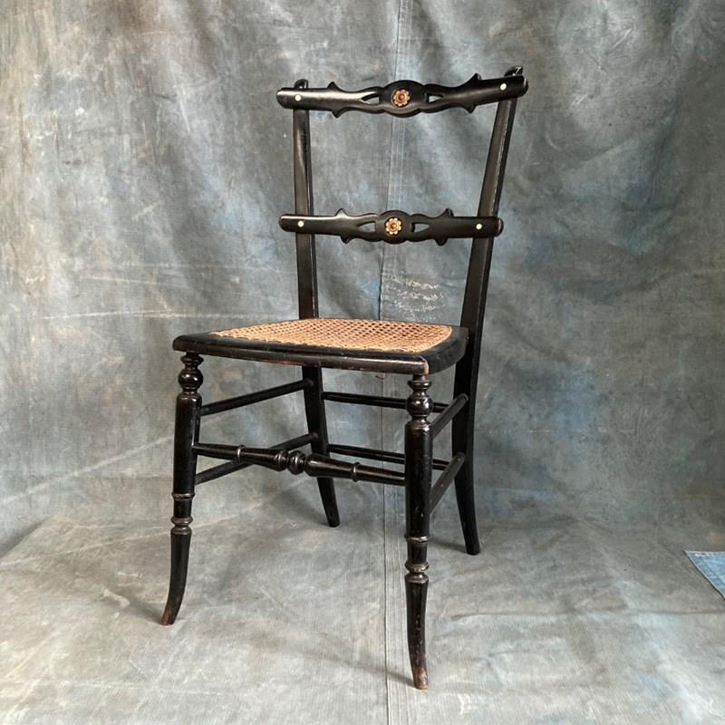 A late 19th century ebonised bedroom chair with influences from the Aesthetic Movement. The back rest bars incorporate inset bone 'dots', and carved and gilded stylised sunflower motifs. Double stretchers between the legs at the back and sides means this little chair has kept its sturdyness. Cane seat in good order. Overall a very pretty chair. Seat height 42cm.