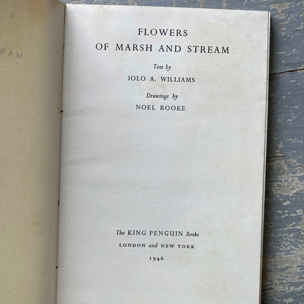 A 1946 first edition King Penguin book 'Flowers of Marsh & Stream' by Iolo A Williams, with illustrations and cover design by Noel Rooke. A good crisp copy with perfect spine. Some foxing to back pages.