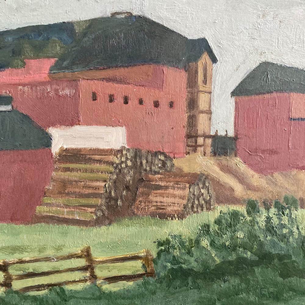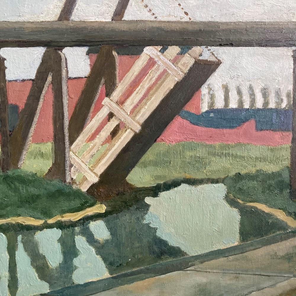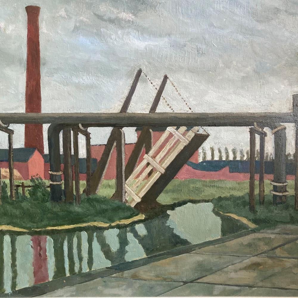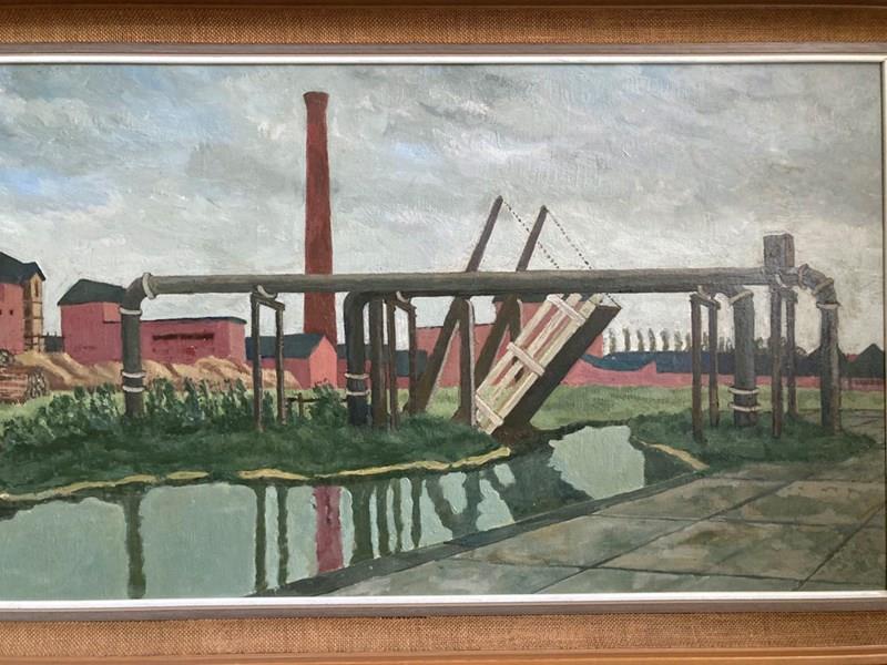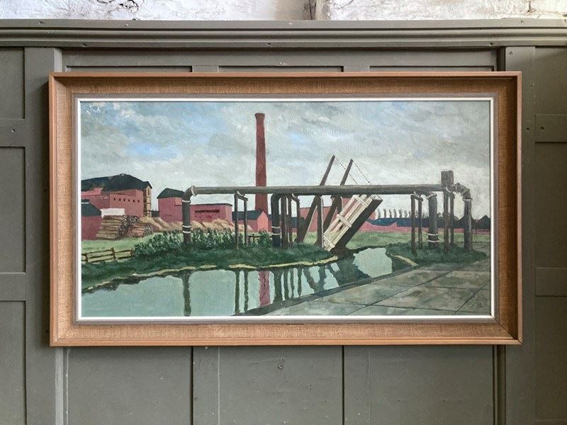 A large oil on board landscape of a canal alongside some historic industrial warehouse buildings. Well executed and confidently done, both in technique and choice of colour palette. Despite being an industrial scene, the painting exudes serenity. It is possibly due to the still reflections of the pipework in the calm water of the canal. Unfortunately not signed. In original frame.