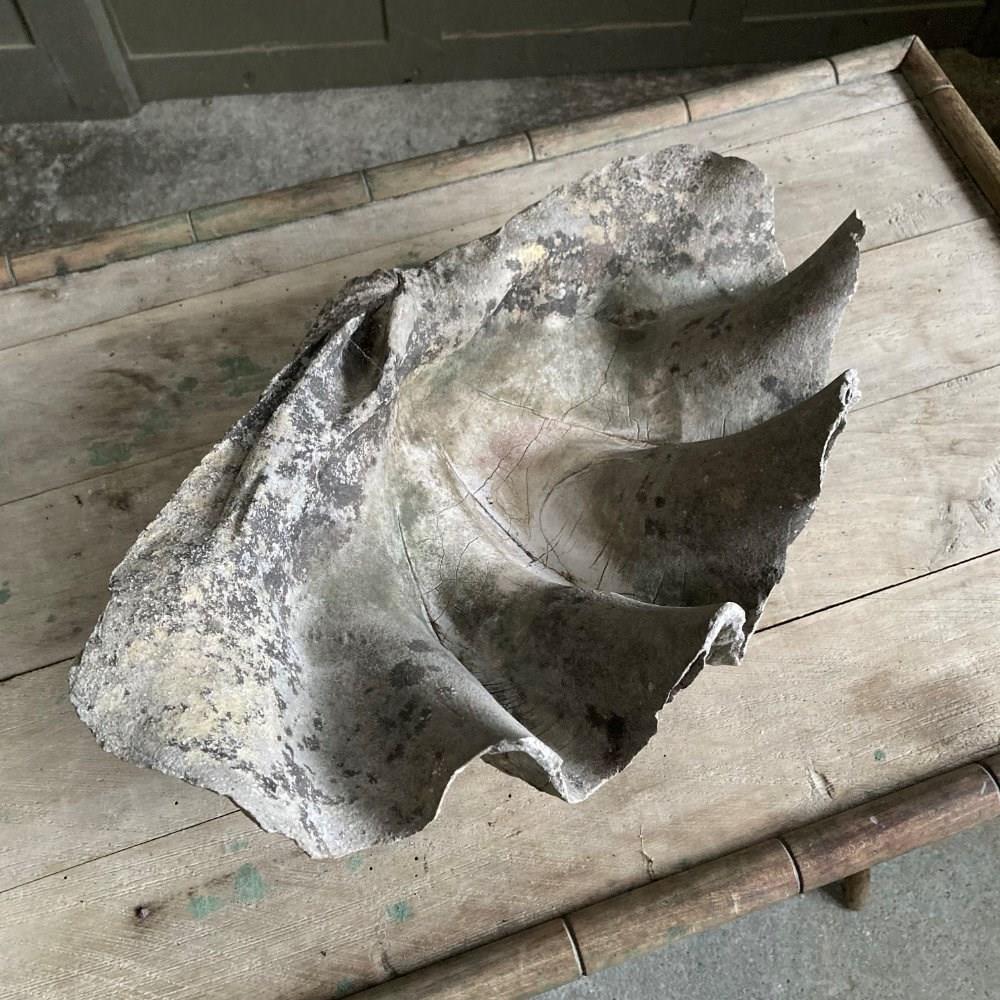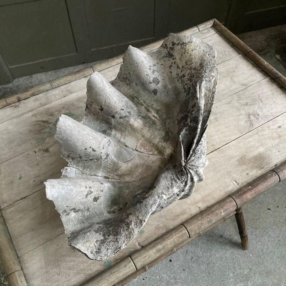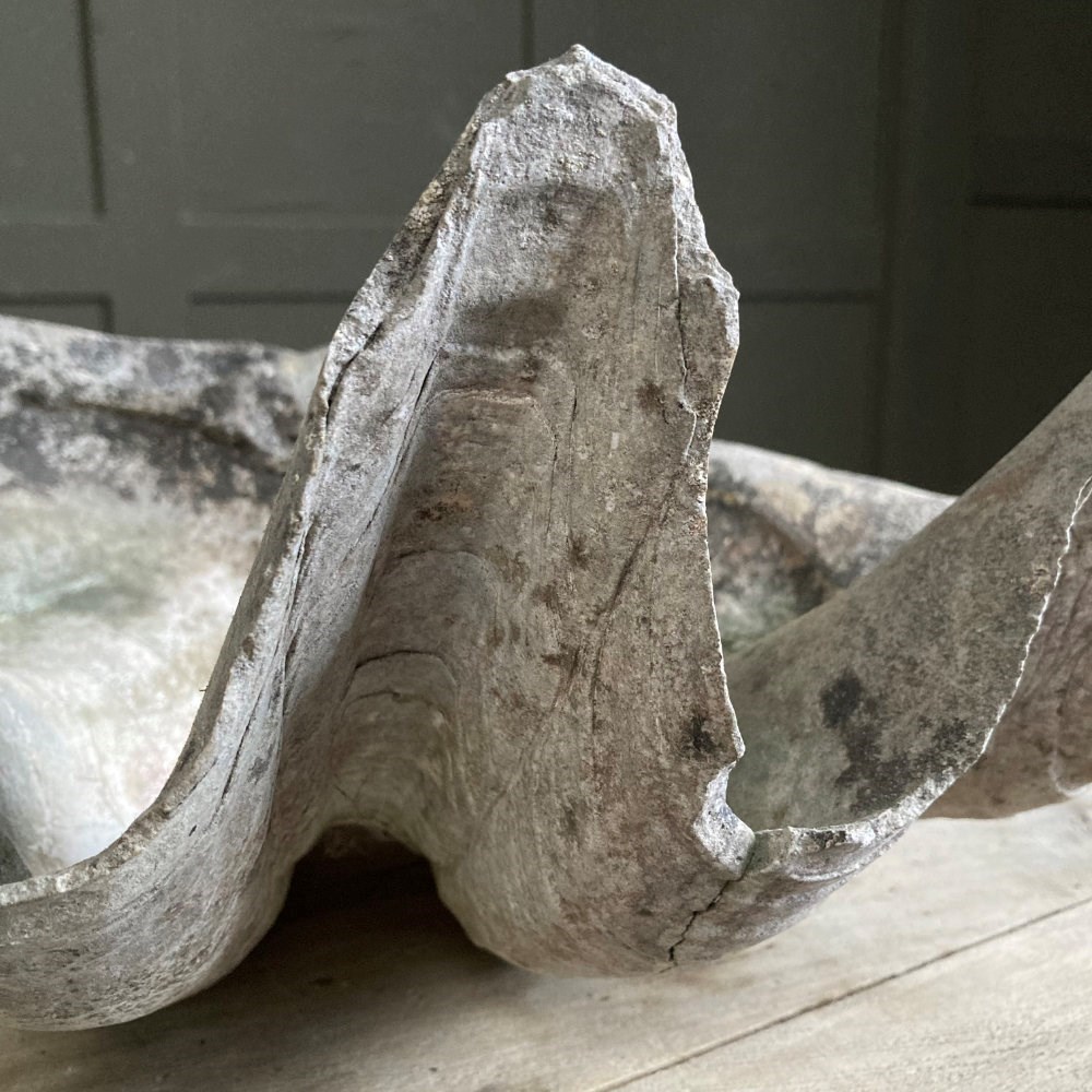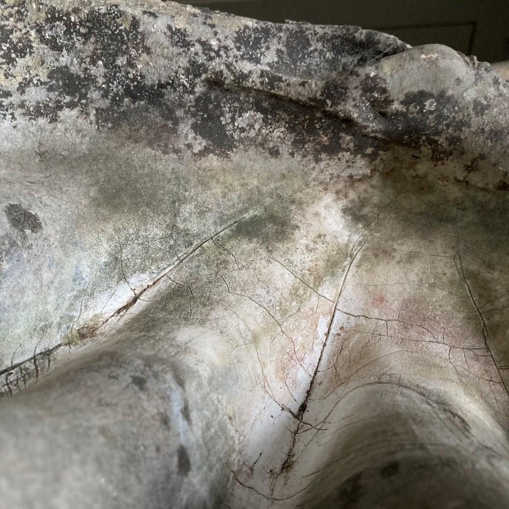 A large clam shell, sourced from a Cornish estate garden. It has now acquired a lovely weathered patina, including fissures and discolouration, having been exposed to the outdoor elements for many years. There is something quite prehistoric looking about it!