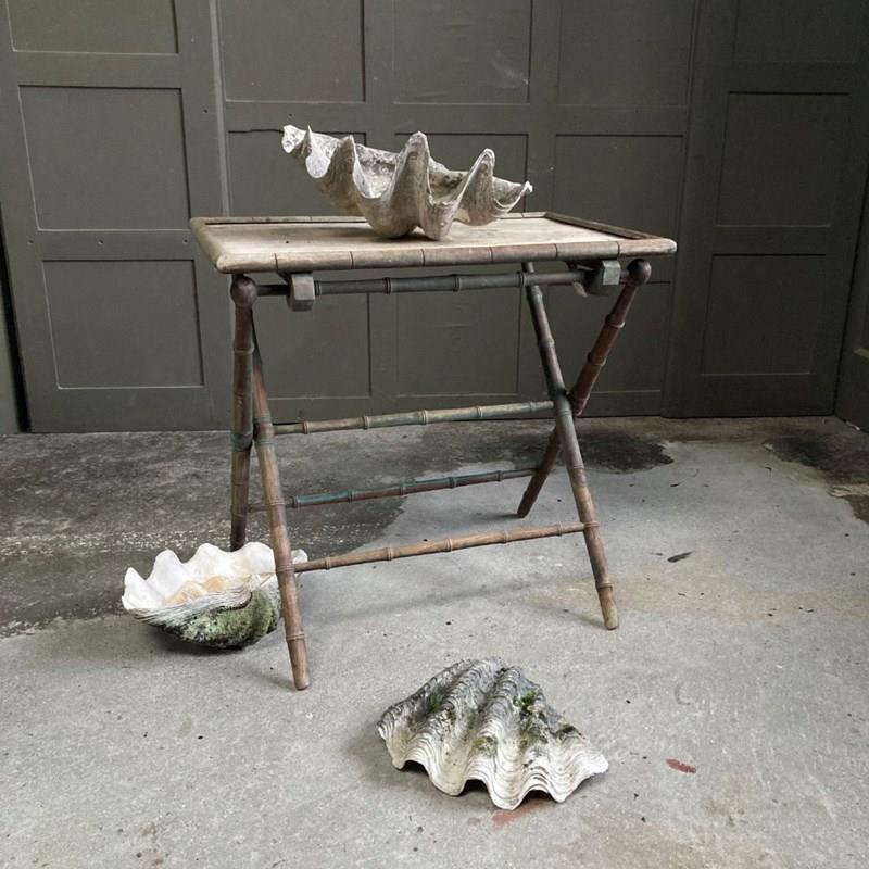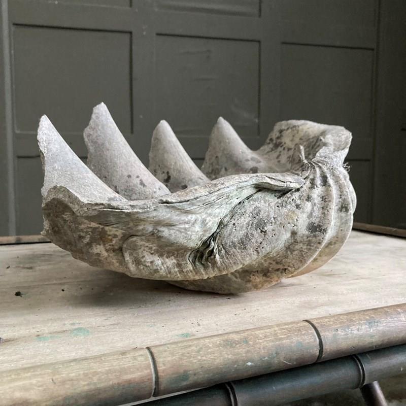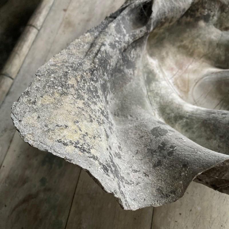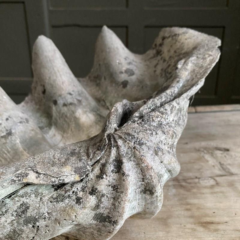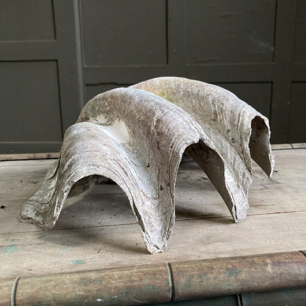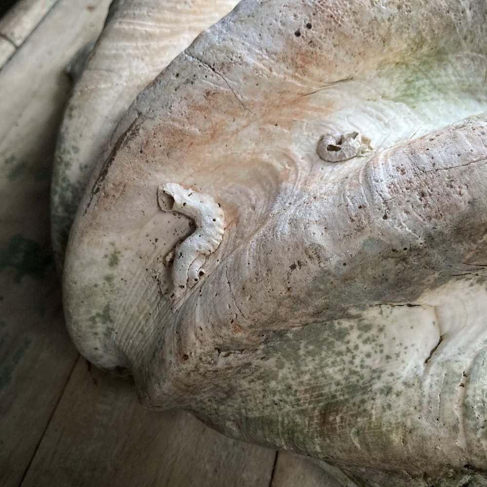 A large clam shell, sourced from a Cornish estate garden. It has now acquired a lovely weathered patina, including fissures and discolouration, having been exposed to the outdoor elements for many years. There is something quite prehistoric looking about it!