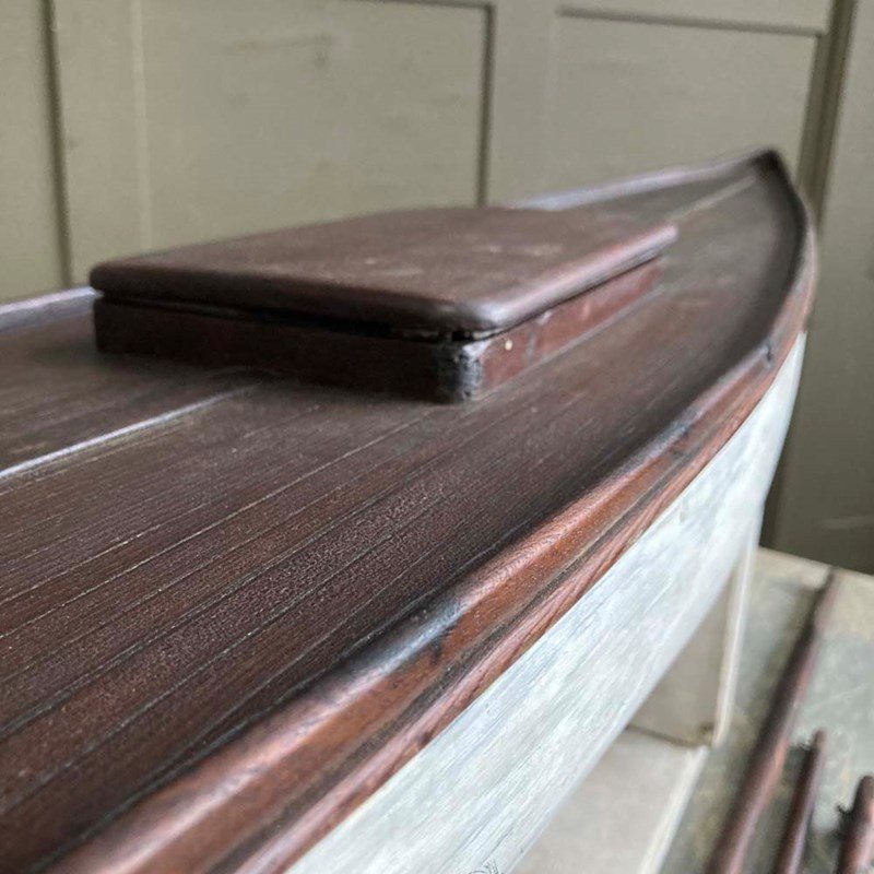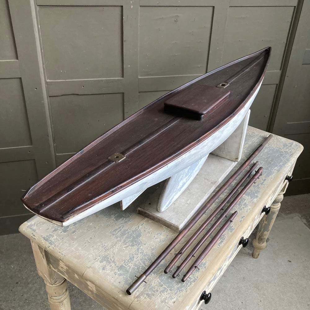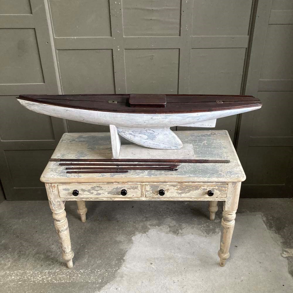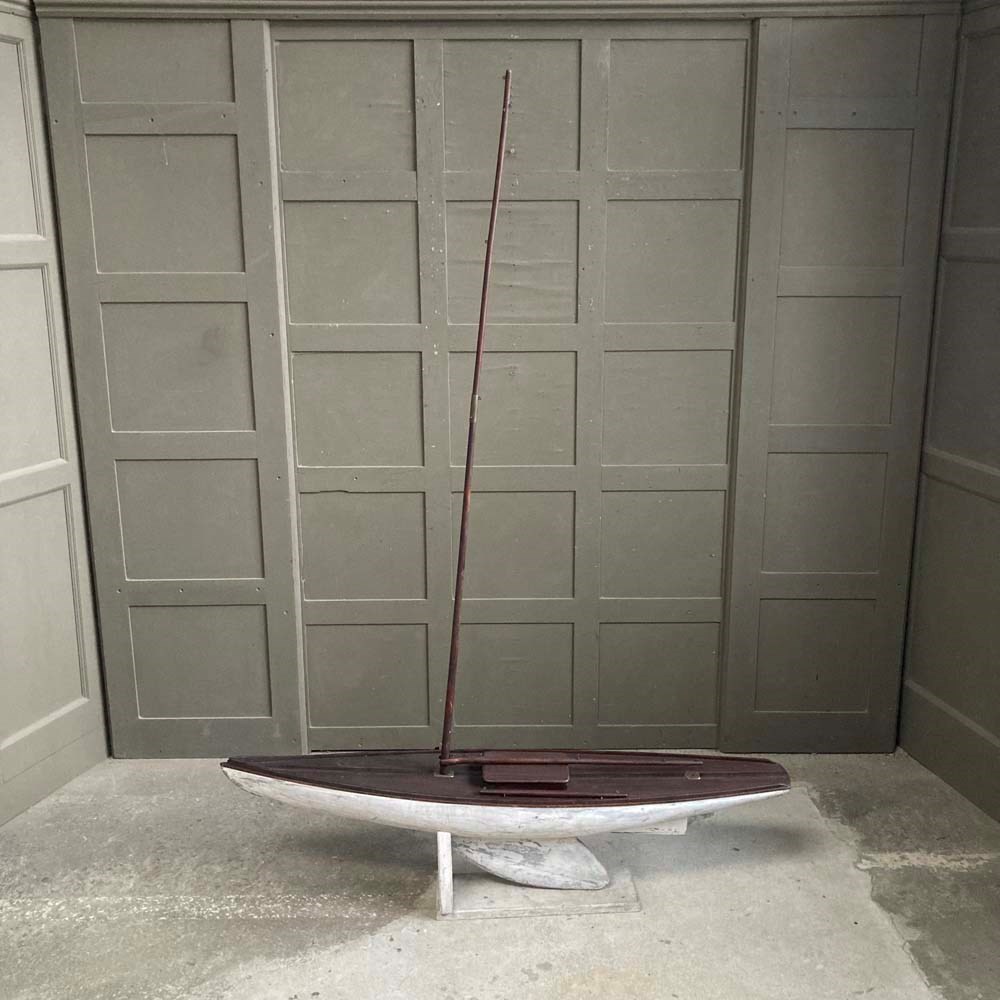 A very large wooden pond yacht hull. Its impressive size makes it a great maritime display piece, with or without sails.