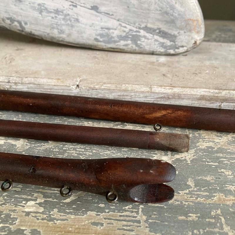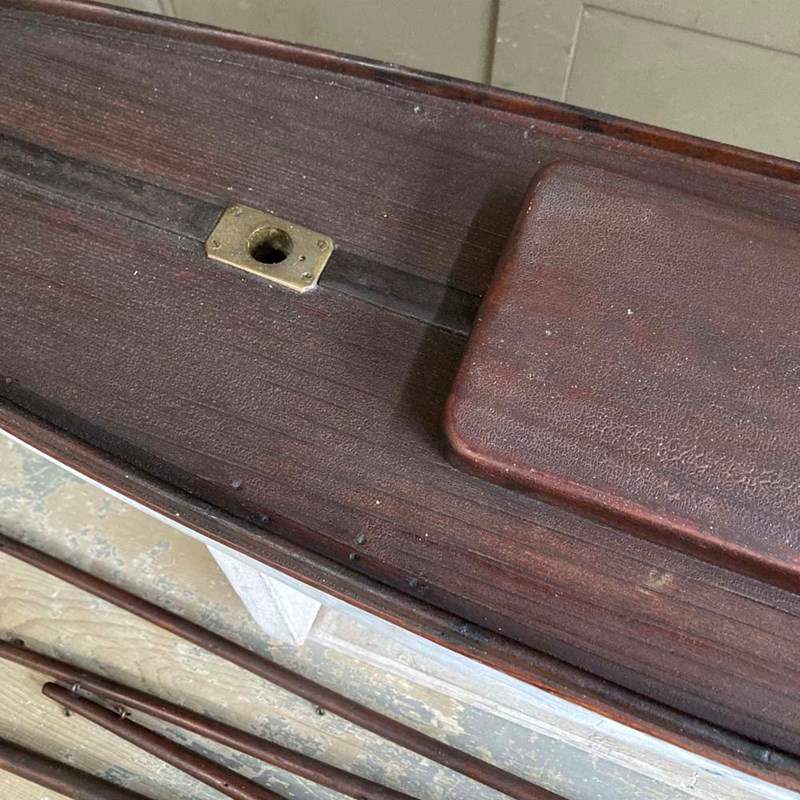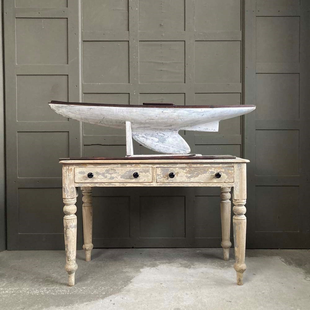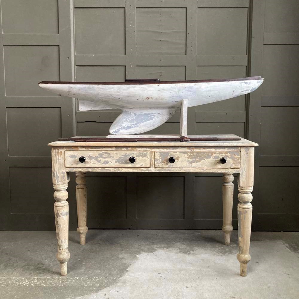 A very large wooden pond yacht hull. Its impressive size makes it a great maritime display piece, with or without sails.