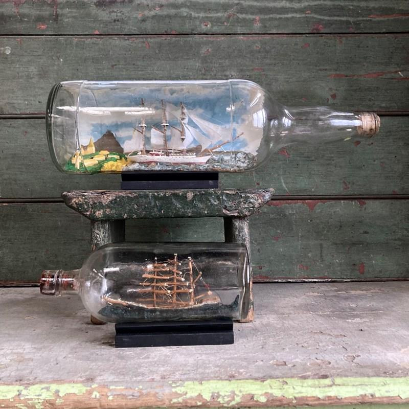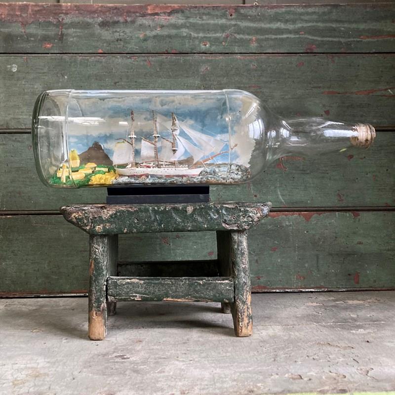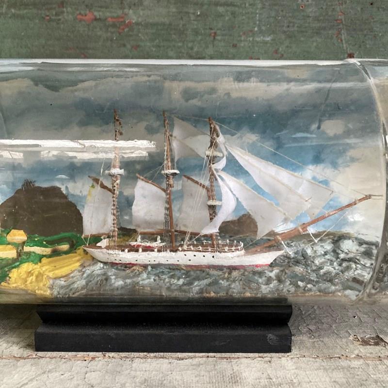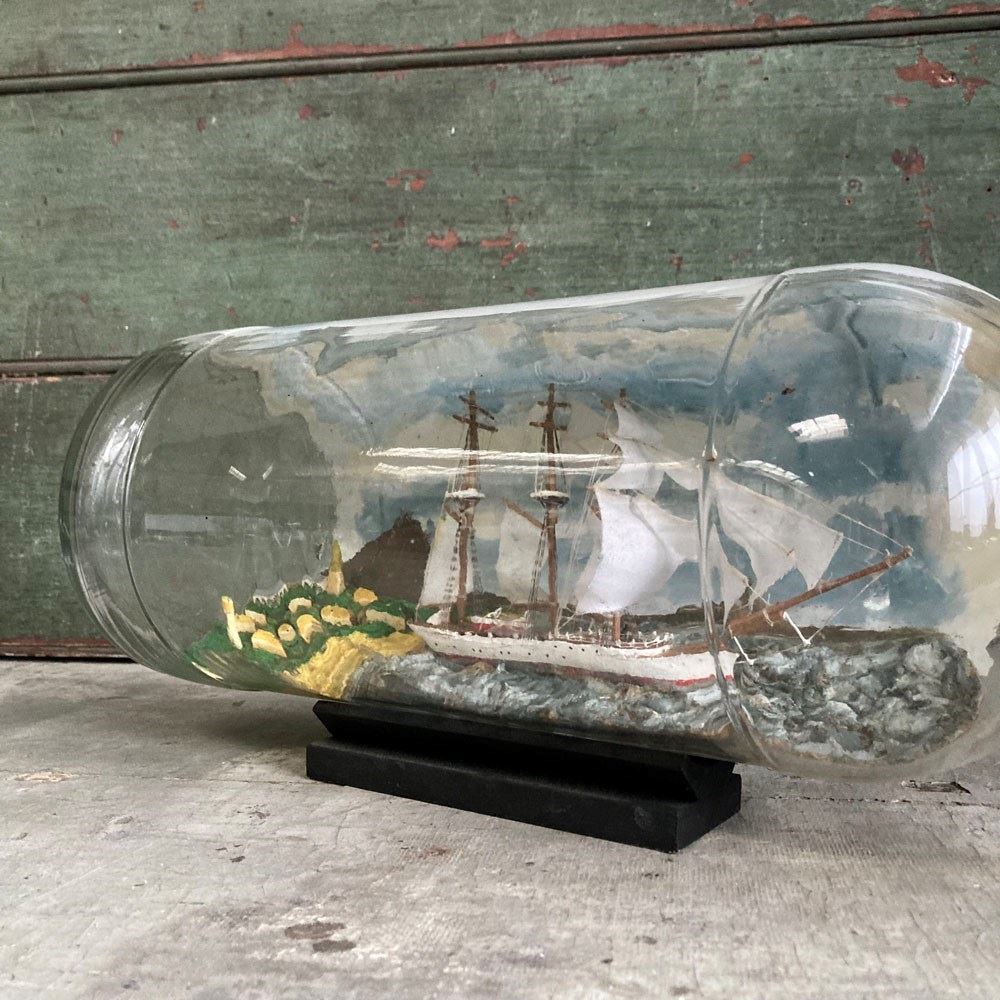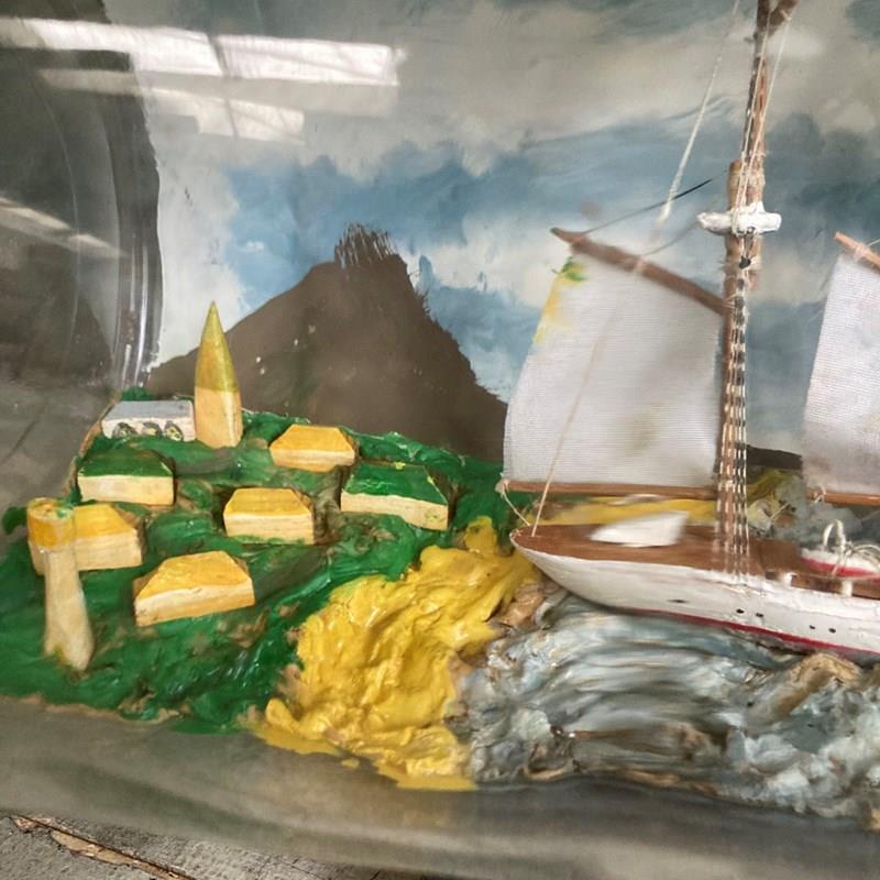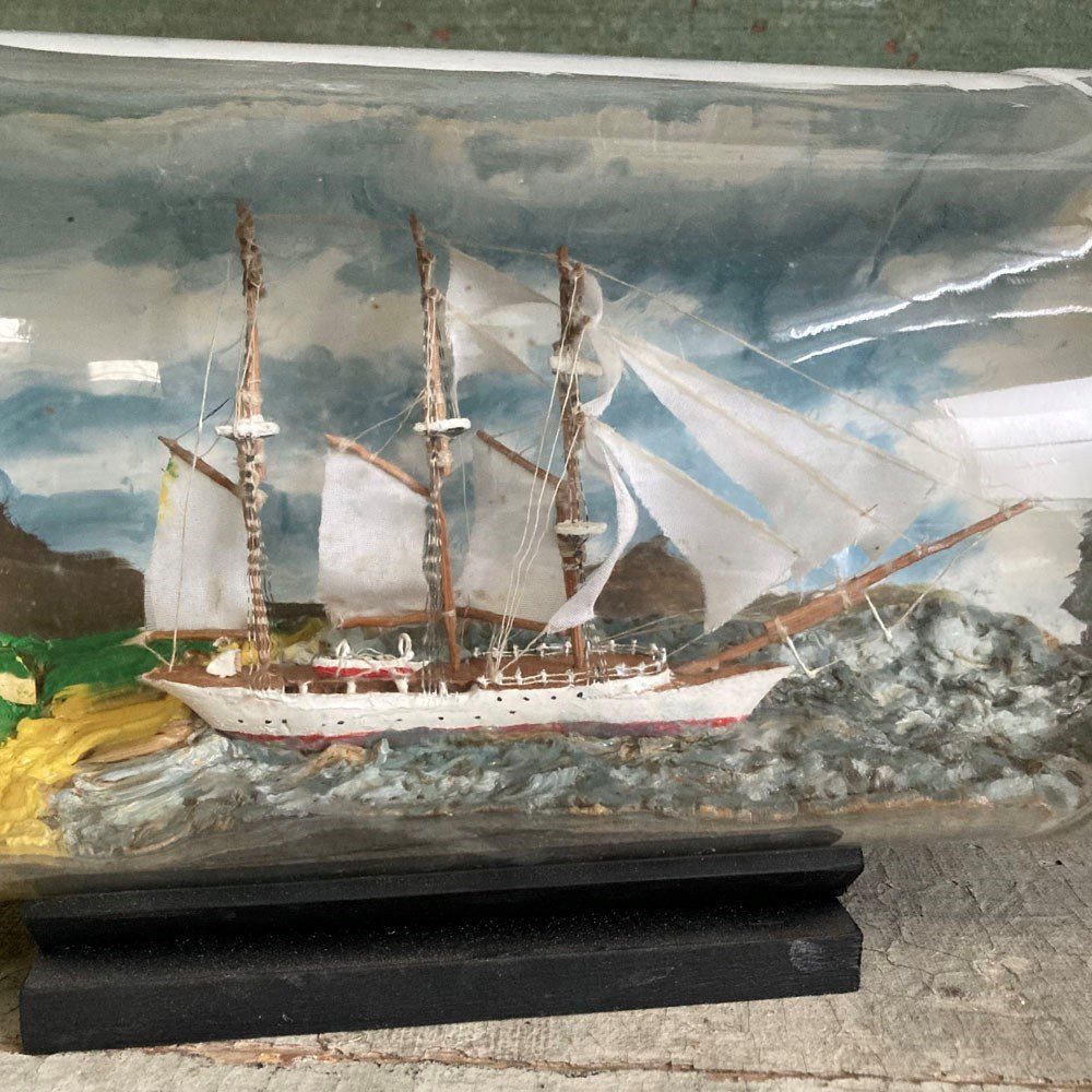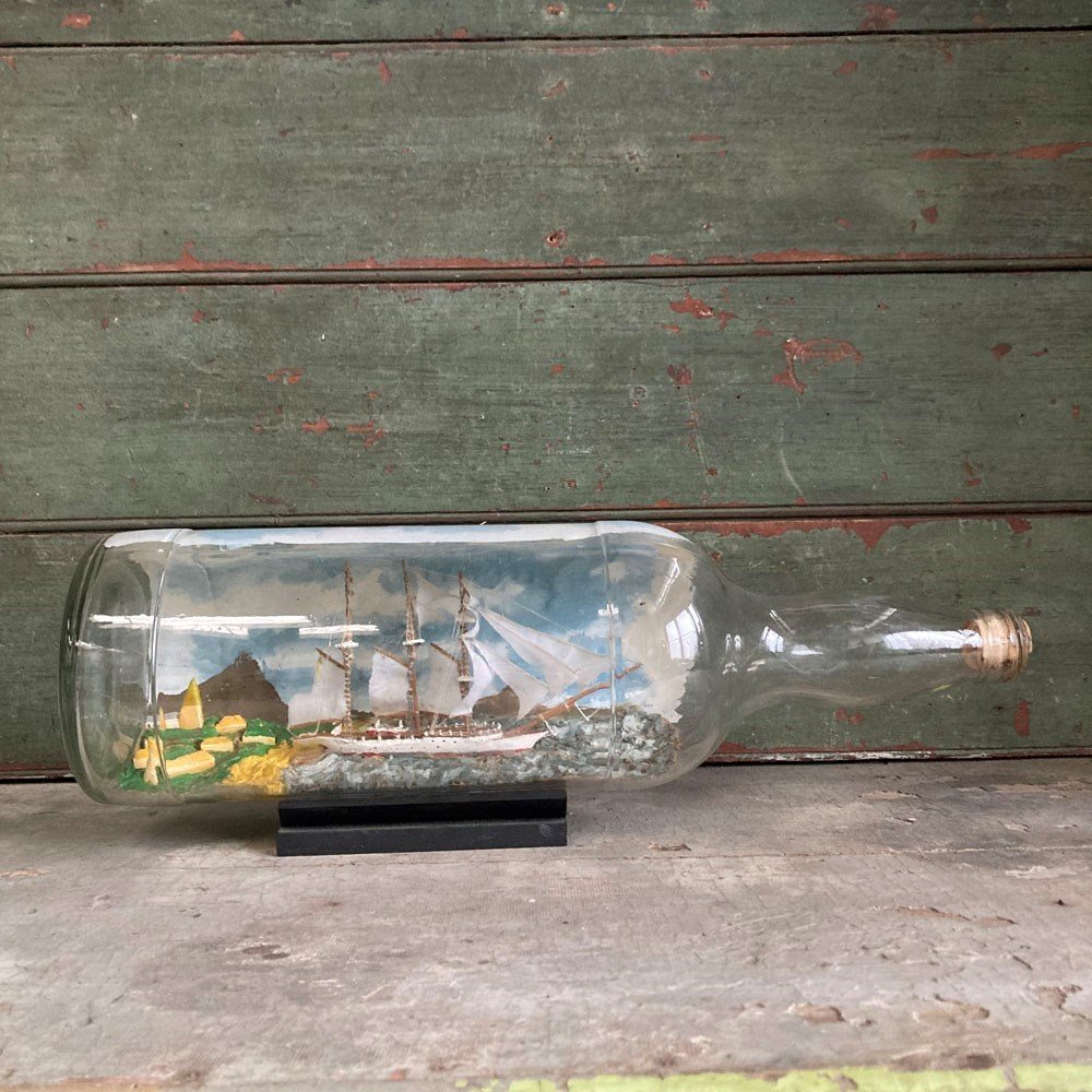 A particularly large bottle containing a scratch-built, wooden, three-masted ship surrounded by sculpted land and sea.