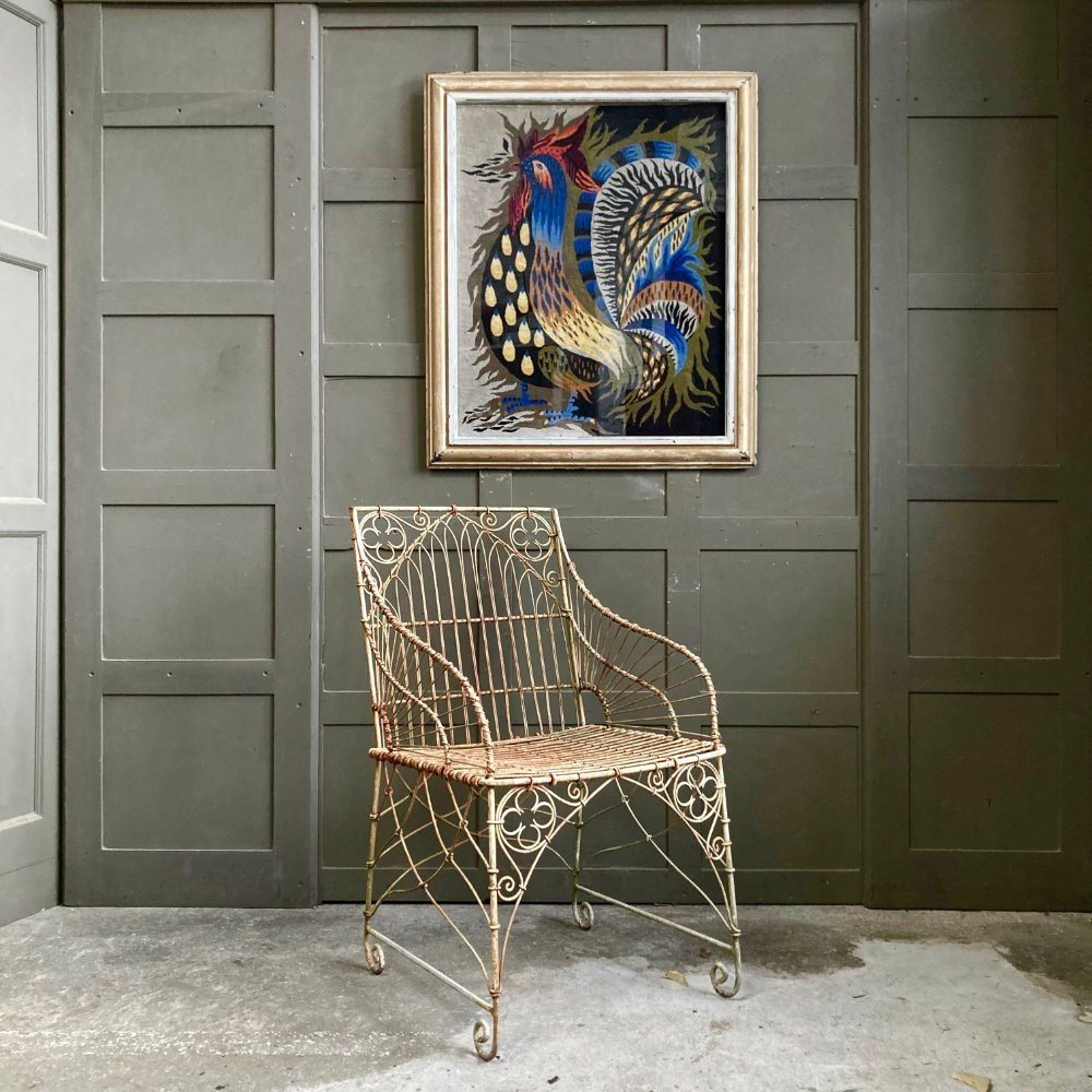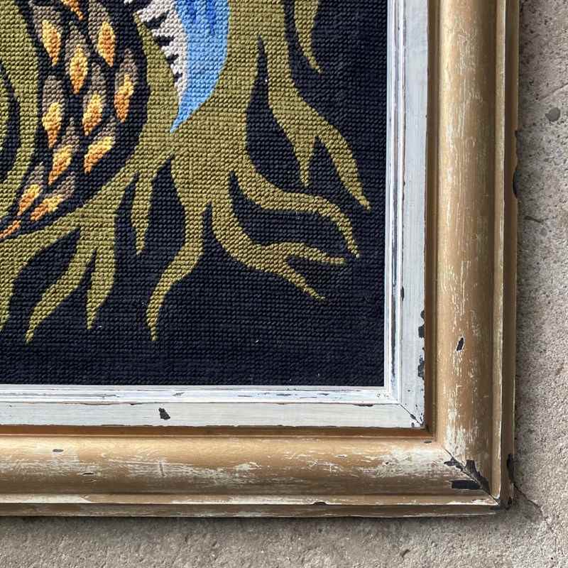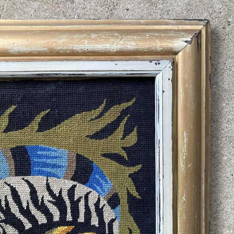 A striking woolwork of a stylized cockerel. In excellent condition with bright strong colours. Framed and glazed. Due to the size of this item, delivery would be by courier only.