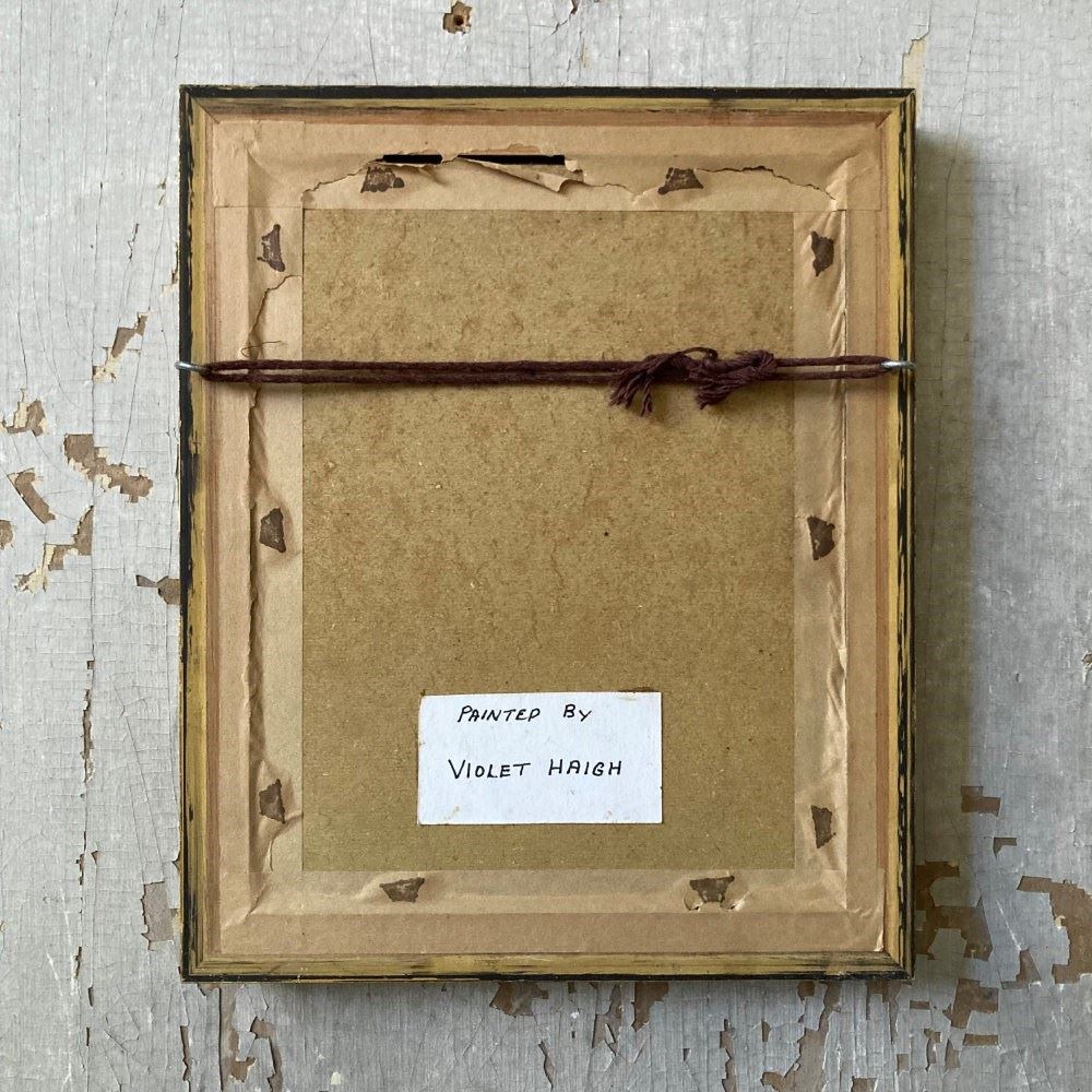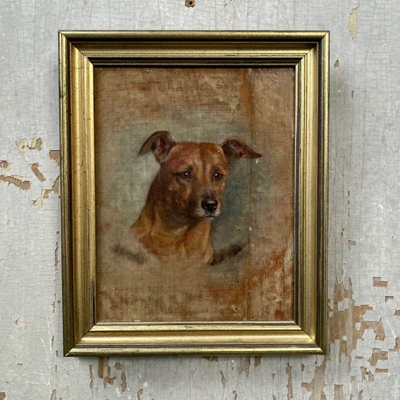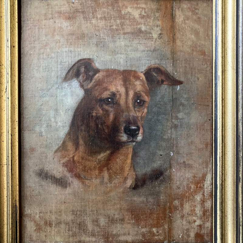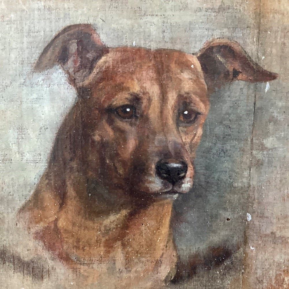 A well-executed Edwardian oil on board head portrait of a terrier-type dog. Label to reverse reads 'Painted by Violet Haigh'.