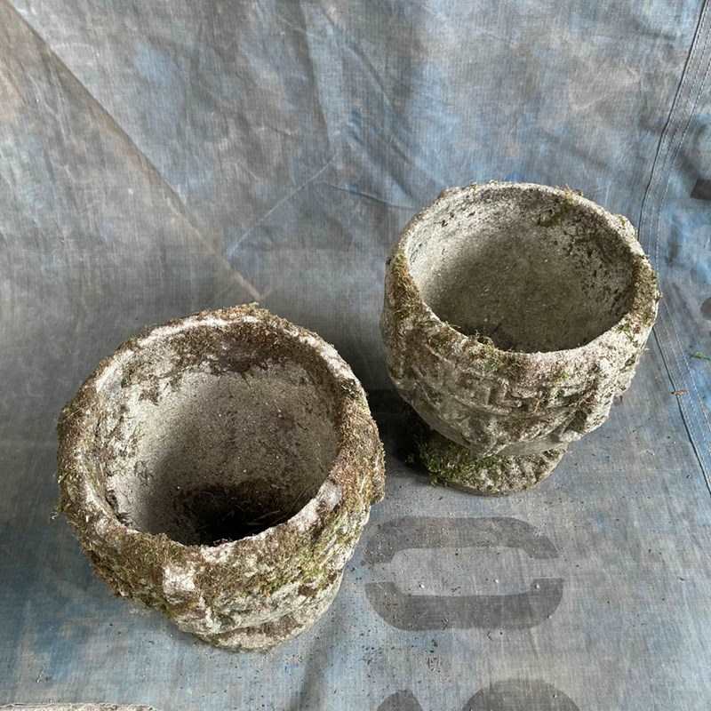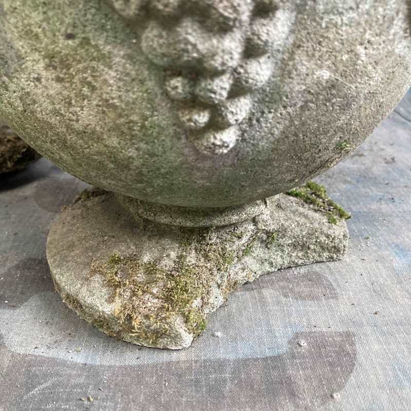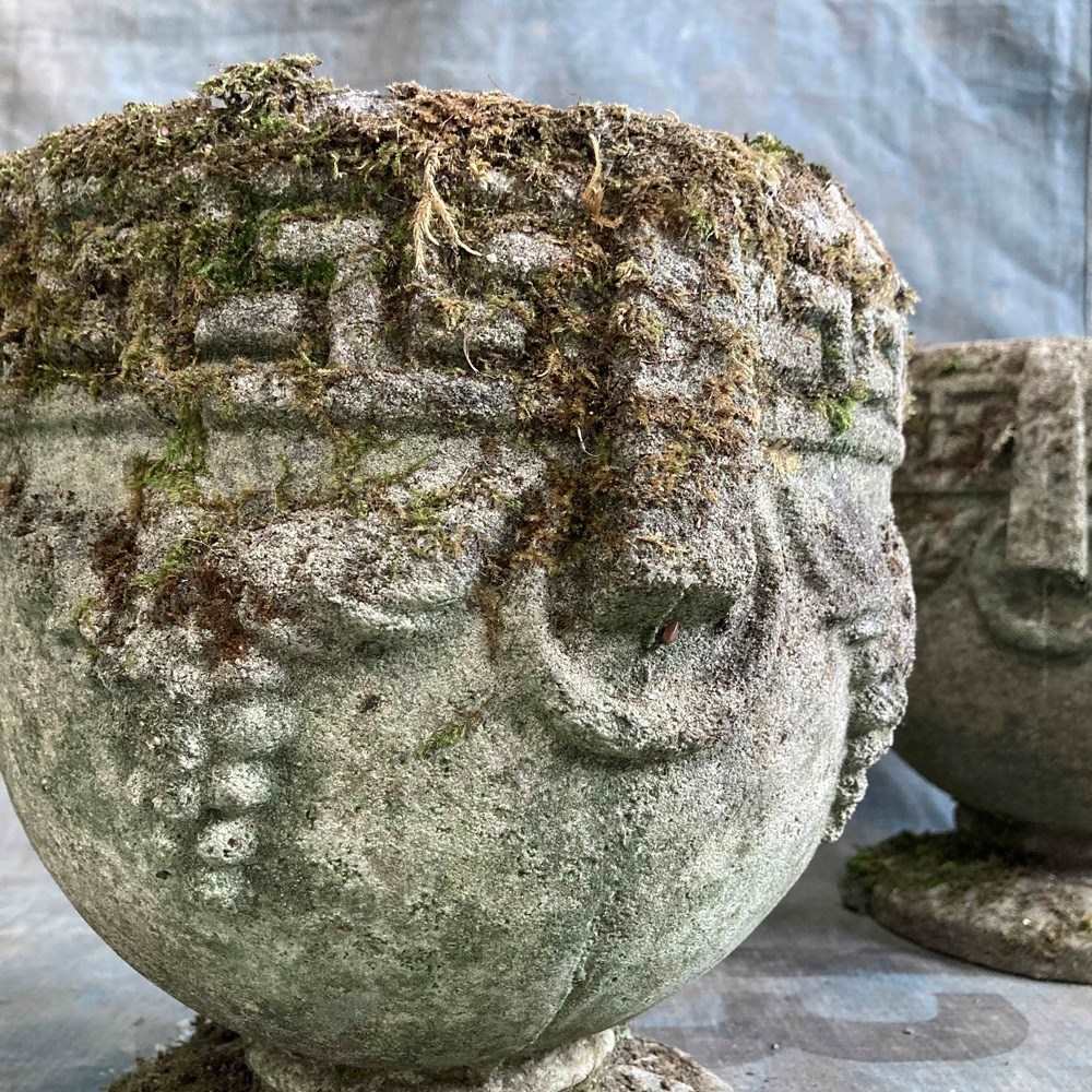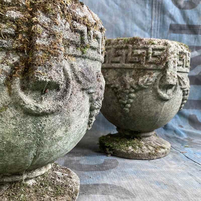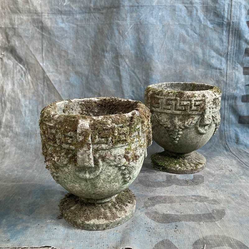 A small pair of nicely weathered and mossy concrete planters, cast with neo-classical style detailing. The foot of one does have a section broken off, but it is still very stable and sturdy. Their size makes them perfect for adorning the tops of stone or brick gate posts.