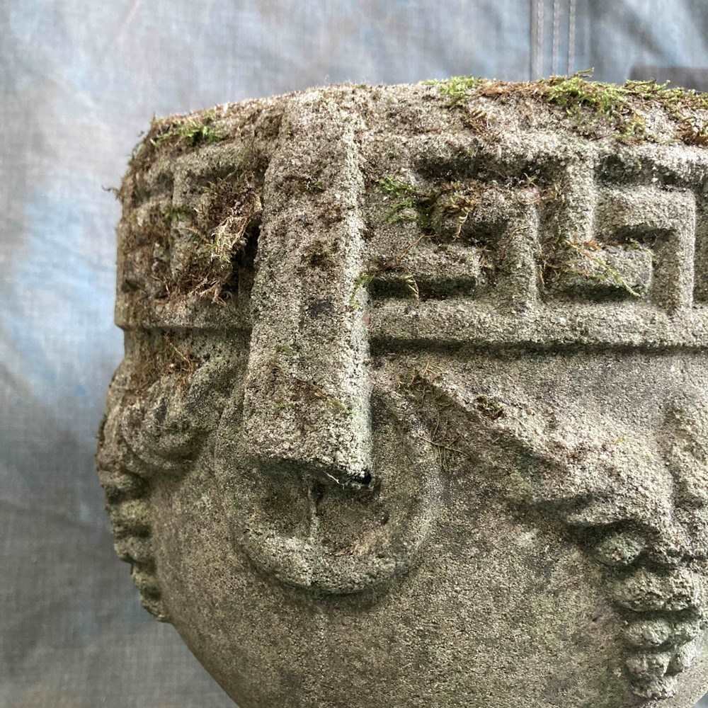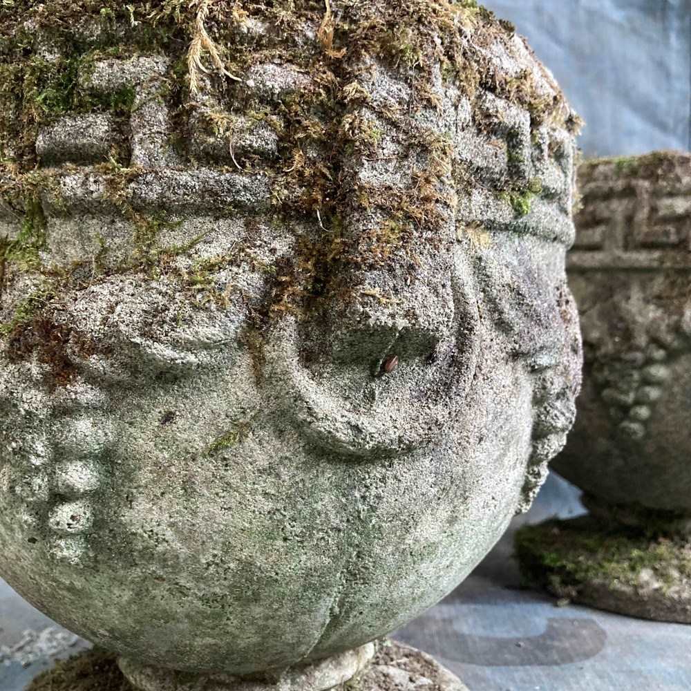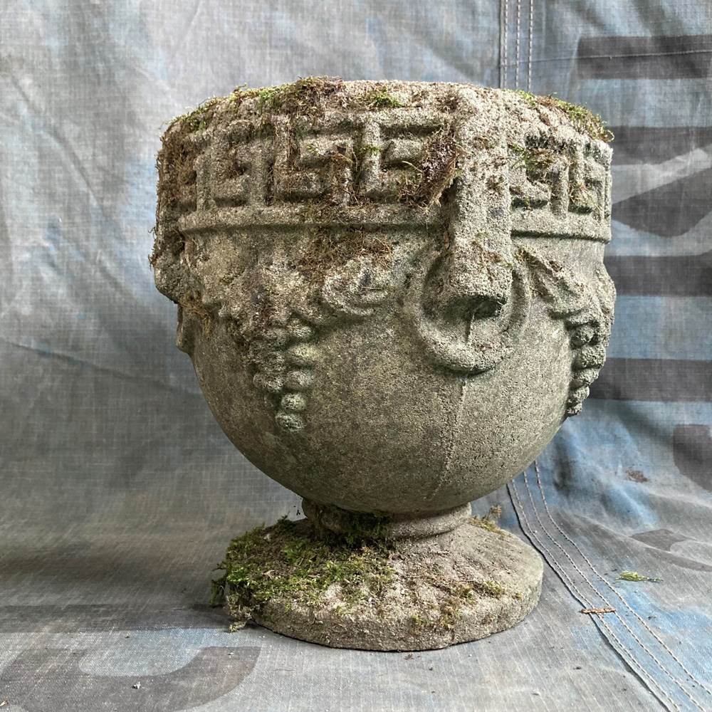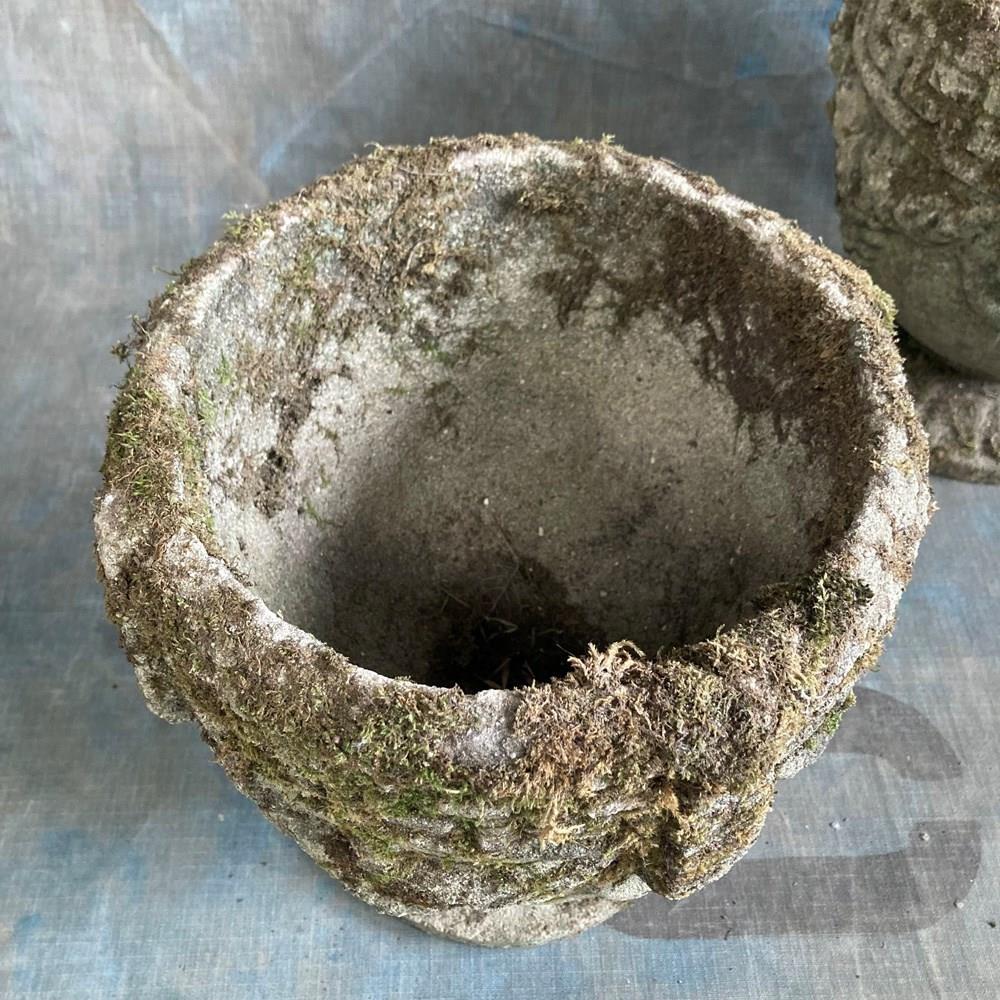 A small pair of nicely weathered and mossy concrete planters, cast with neo-classical style detailing. The foot of one does have a section broken off, but it is still very stable and sturdy. Their size makes them perfect for adorning the tops of stone or brick gate posts.