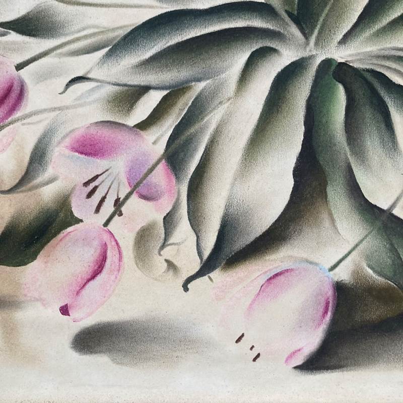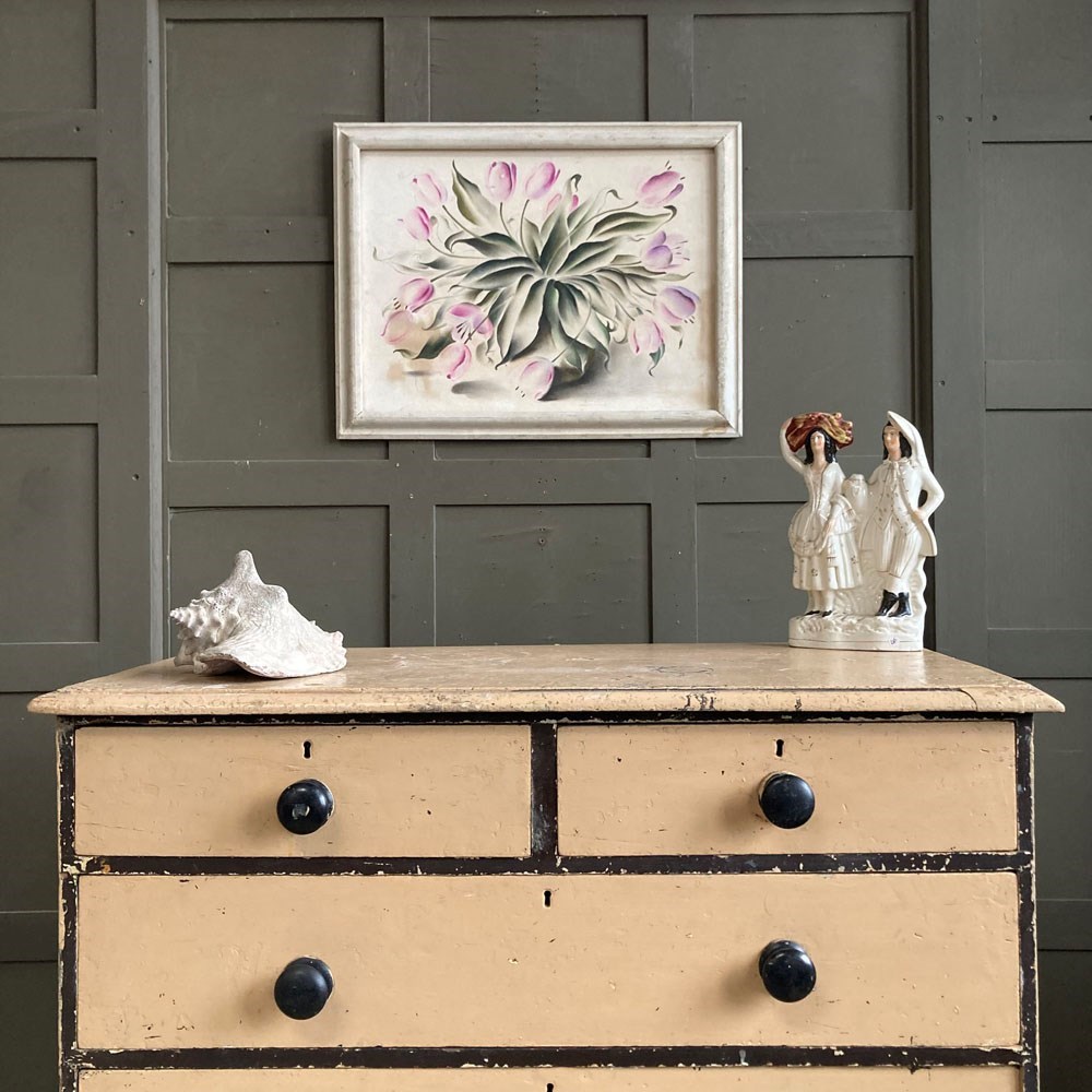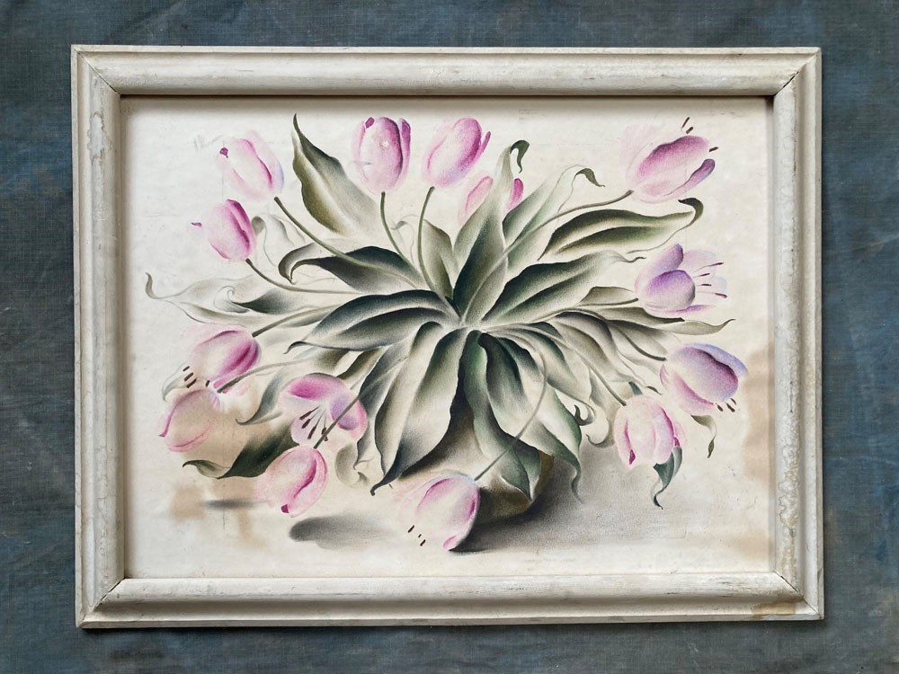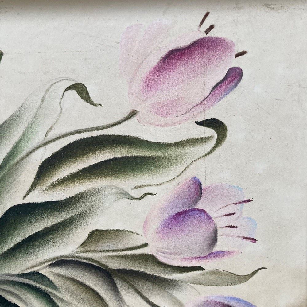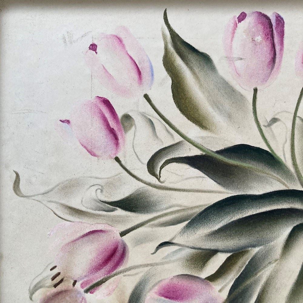 A stylised, almost abstract, painting of a bunch of tulip flowers in a vase by Frederick Roberts Johnson (1900–1986). Mixed media on papered board. Unglazed. Some patches of staining but we don't think this detracts from the strong composition of this artwork. Unsigned.