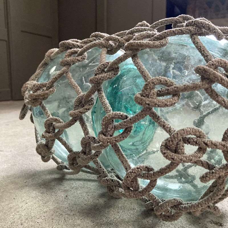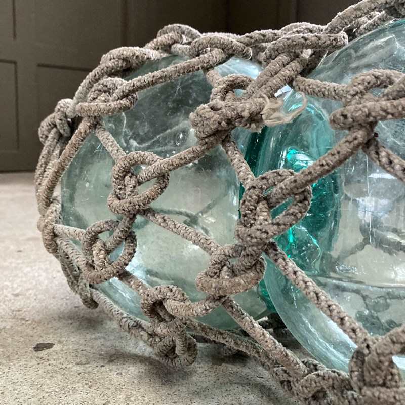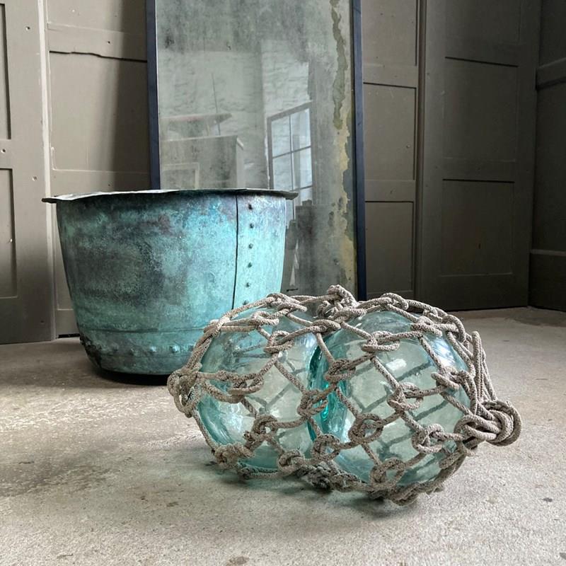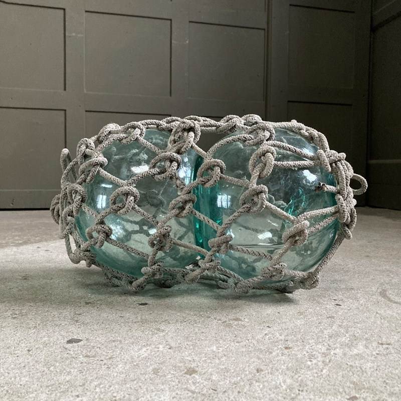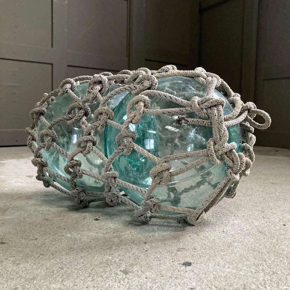 An extremely rare glass fishing float, made of two spheres fused together. This would have been made like this for extra buoyancy, possibly for catching tuna. The glass is a beautiful aqua colour, and would look amazing with a light source projected through it. The float retains its original rope-net protection, which will also help it sit safely on a shelf, or in a cabinet.