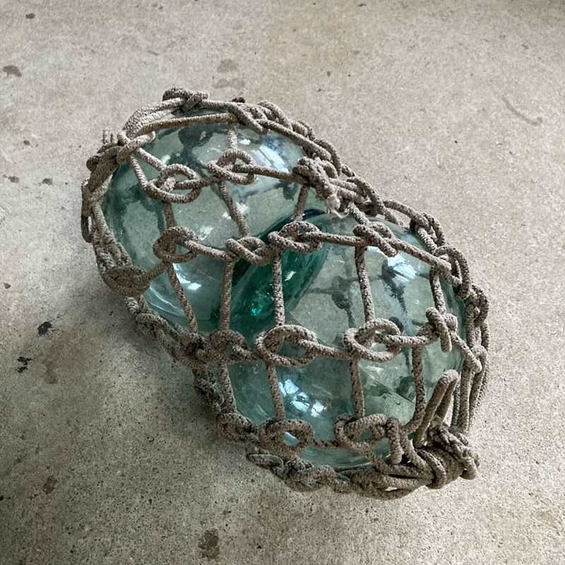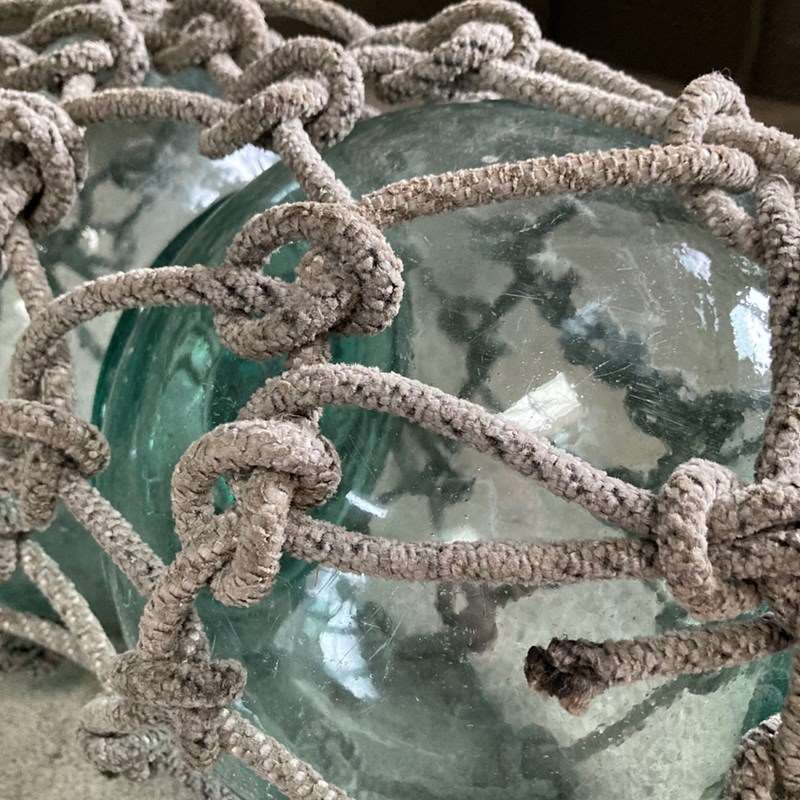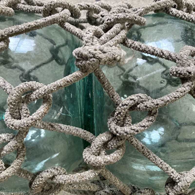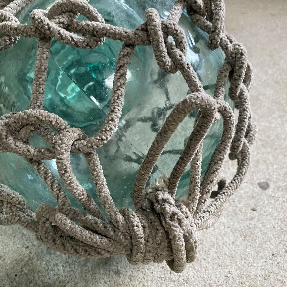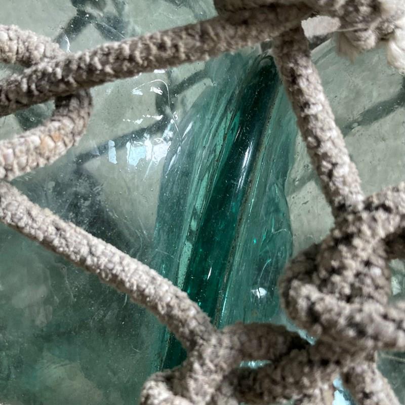 An extremely rare glass fishing float, made of two spheres fused together. This would have been made like this for extra buoyancy, possibly for catching tuna. The glass is a beautiful aqua colour, and would look amazing with a light source projected through it. The float retains its original rope-net protection, which will also help it sit safely on a shelf, or in a cabinet.