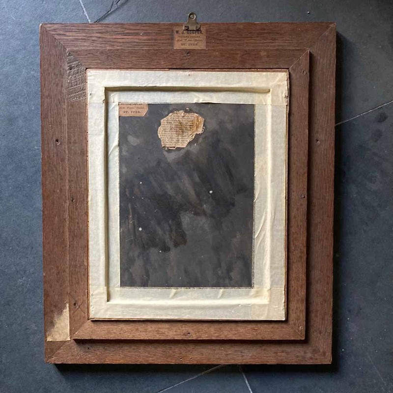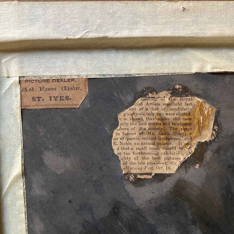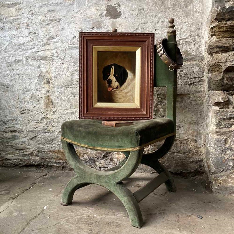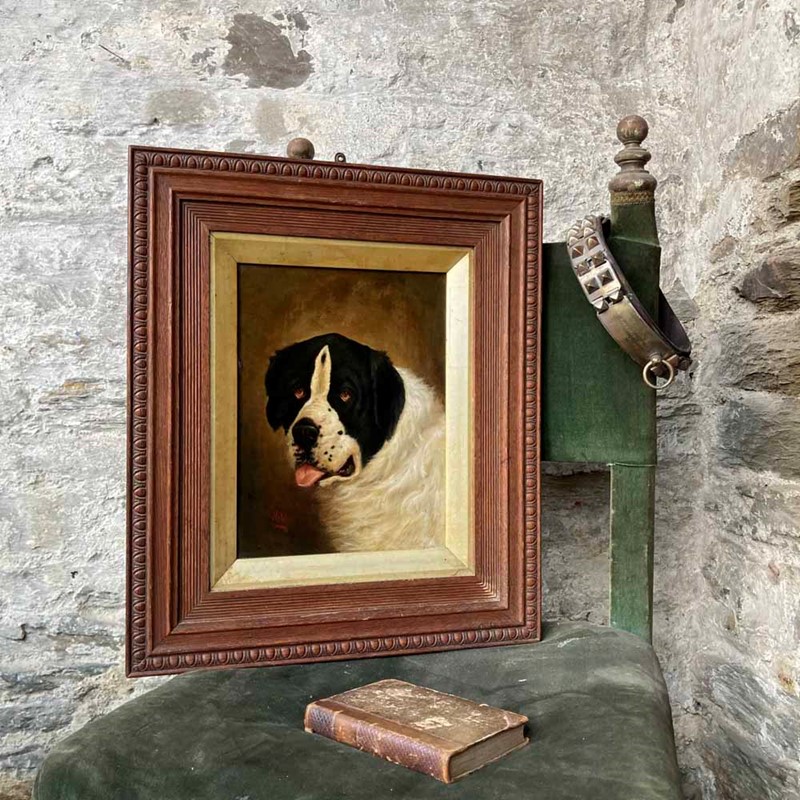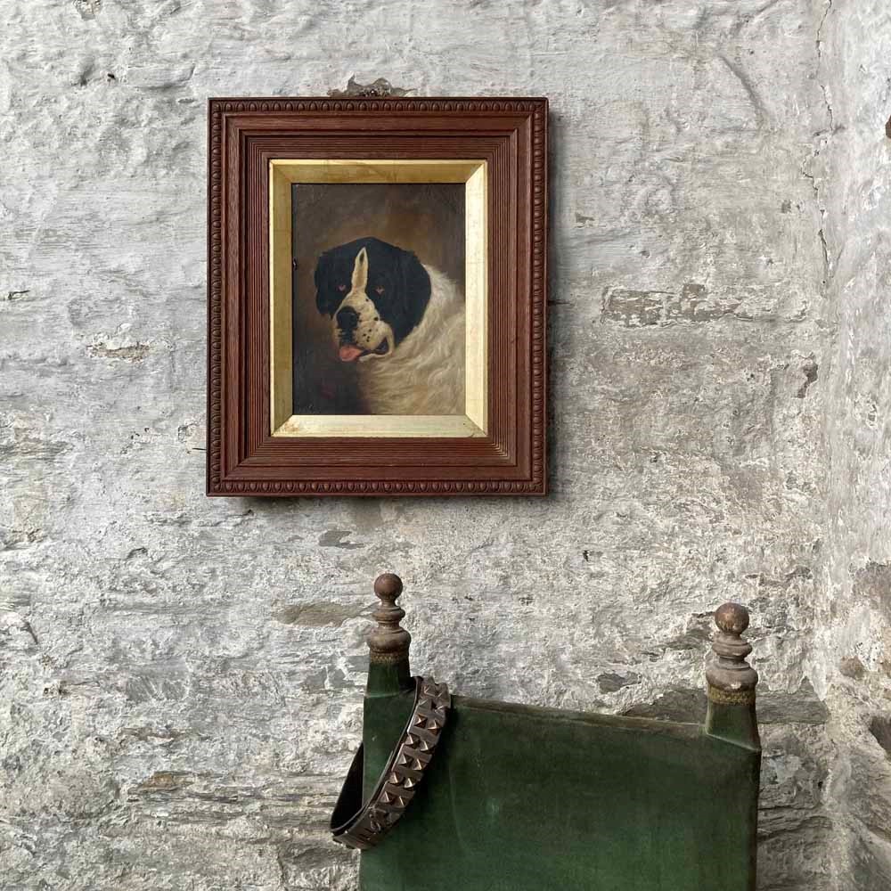 An engaging portrait of a St Bernard mountain dog by Cornish artist G. Noble. This beautifully observed study captures the animal's fur and and soft muzzle remarkably well. Oil on board, in its original oak frame. The original St Ives picture framer's label is still attached to the back. Minor dents to the art board, but no distracting damage or marks.
