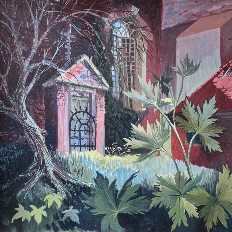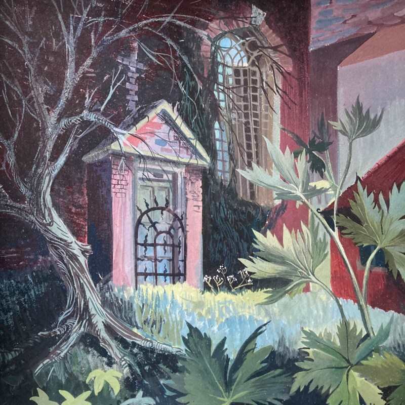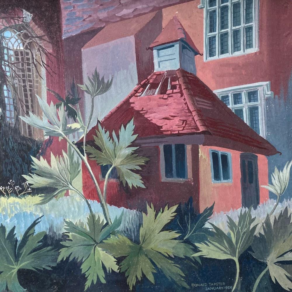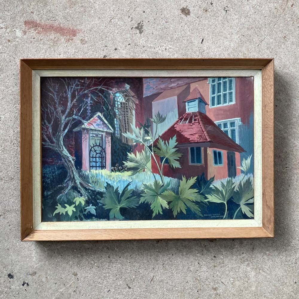 A midcentury gouache painting of St. Mary's churchyard by Donald Tapster (1928-2012). Signed and dated January 1954. Original chamfered frame.