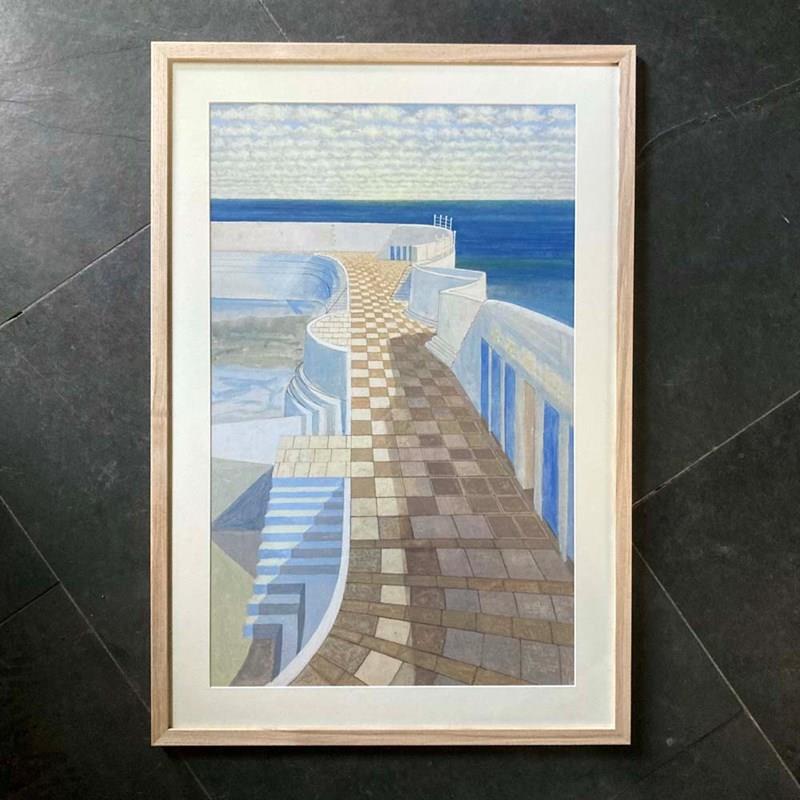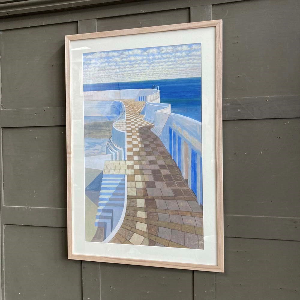 A wonderfully graphic gouache and watercolour by Cornish artist Victor Bramley (1934–2014). It features the iconic Jubilee Pool in Penzance, Cornwall, designed by Frank Latham in 1935. Victor has captured the clean geometric lines of the architecture, accentuated by the bright Cornish light, as well as highlighting its unique location jutting out as it does into the English Channel with nothing but sea and sky far into the distance. Inscribed to reverse. Framed in natural ash wood.