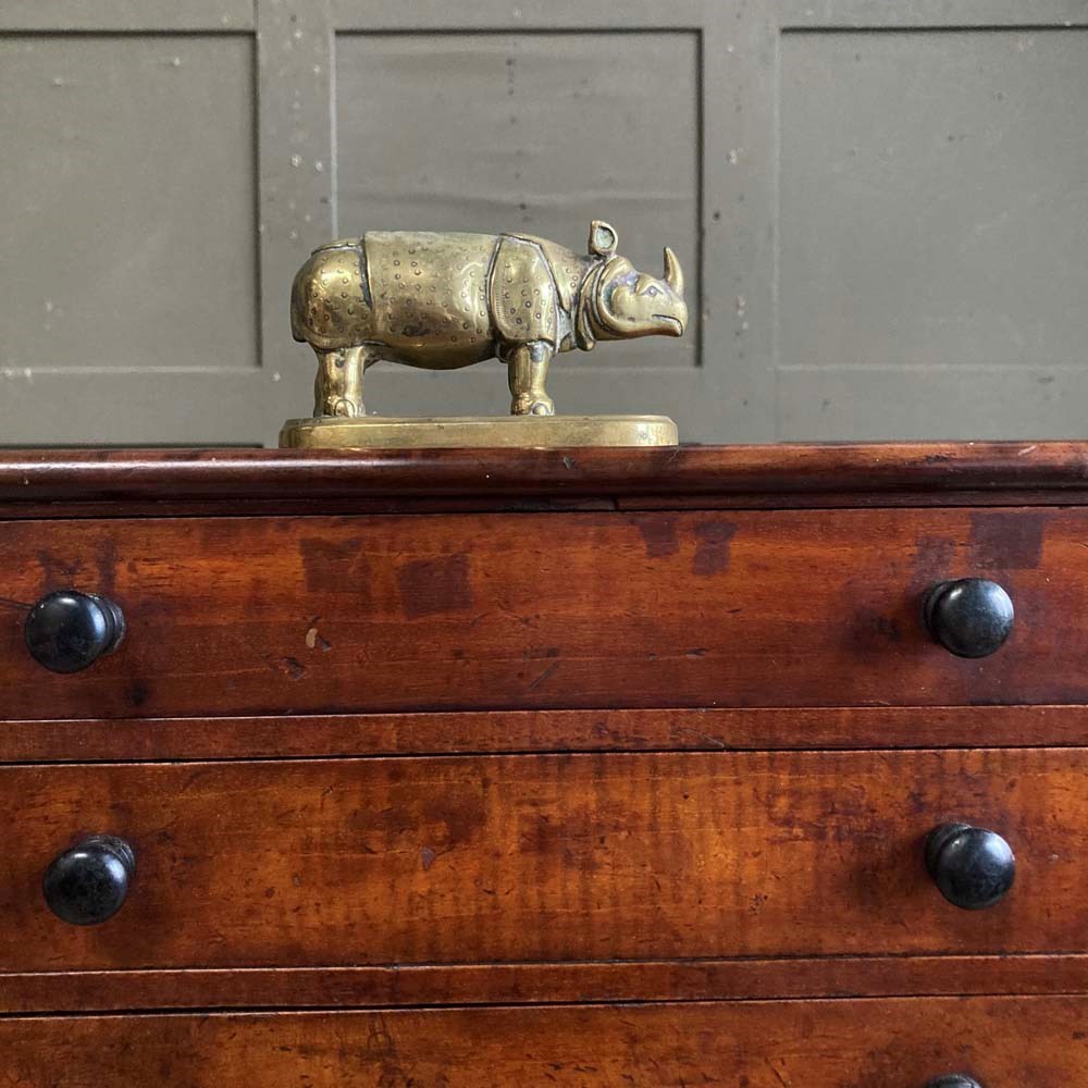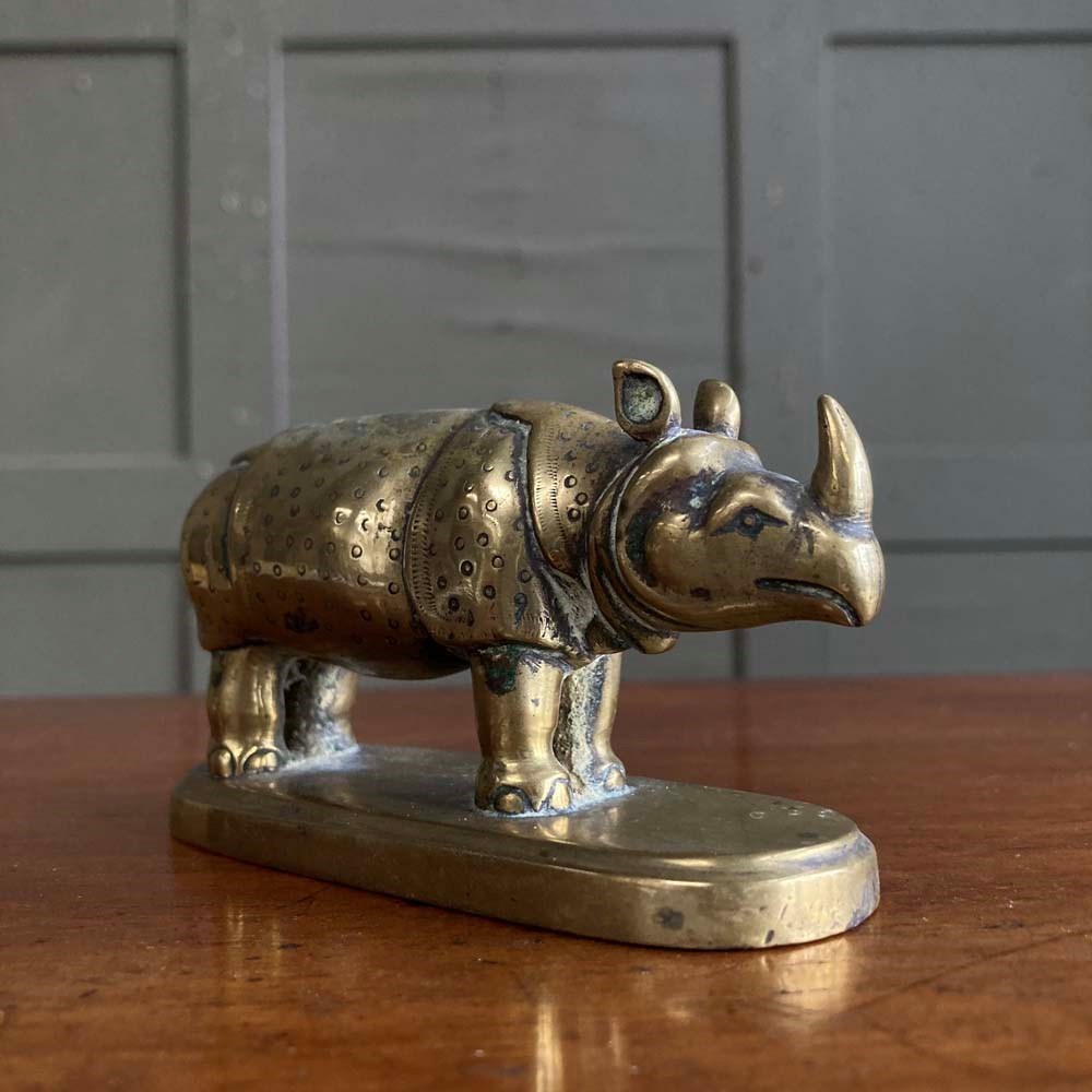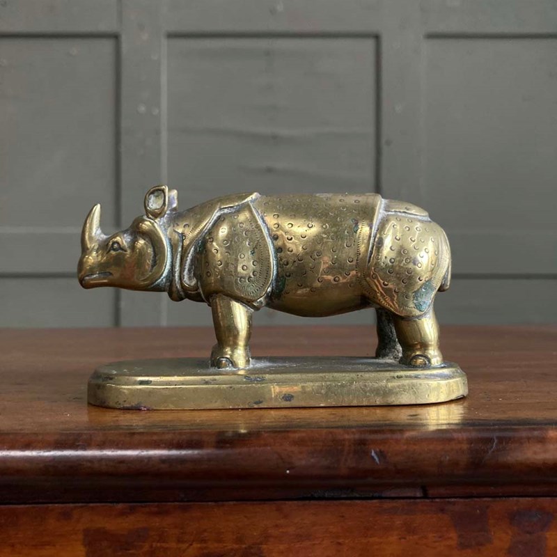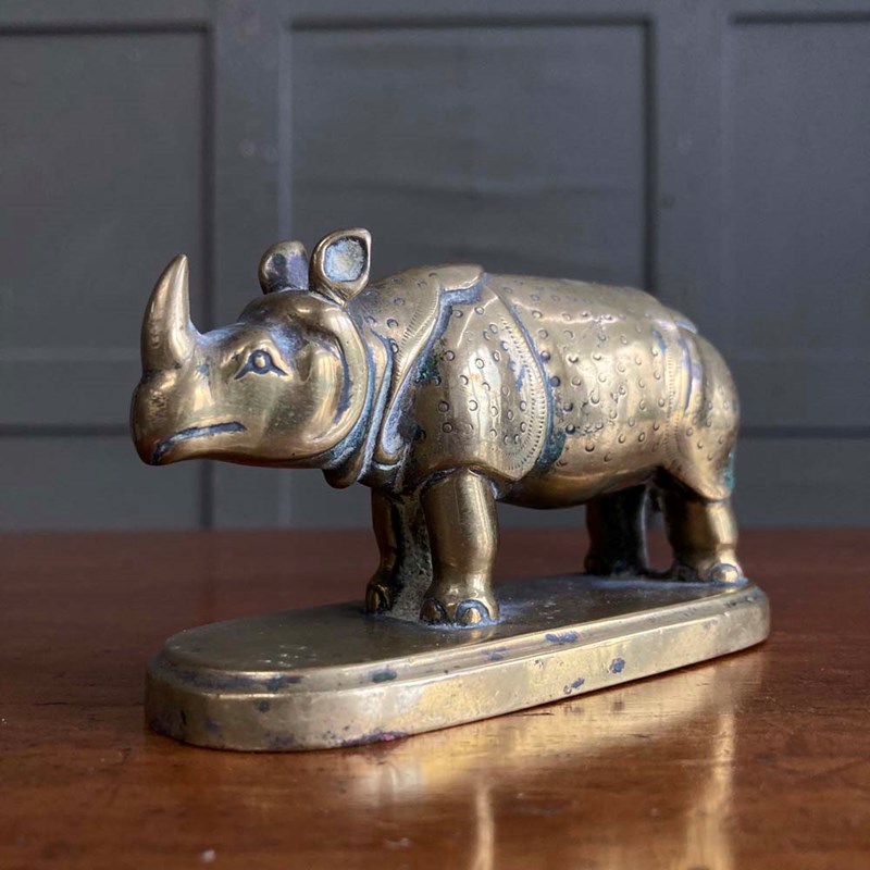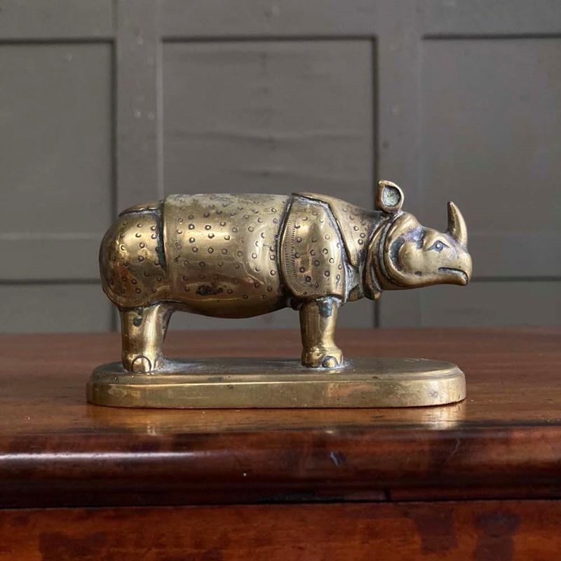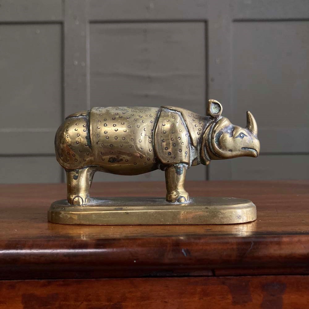 A charming brass rhinoceros ornament. Nice worn surface from years of polishing. Could be used as a paper weight.