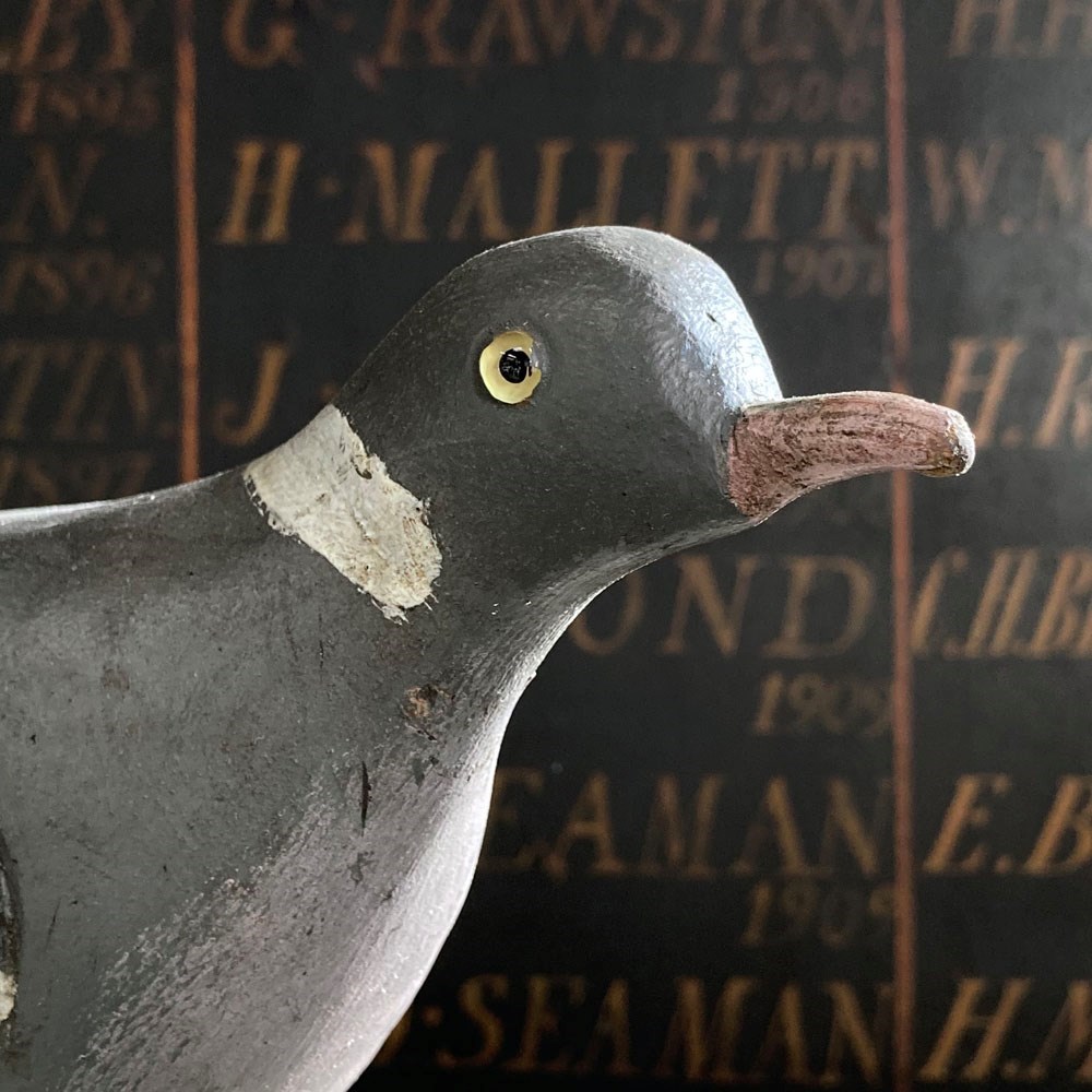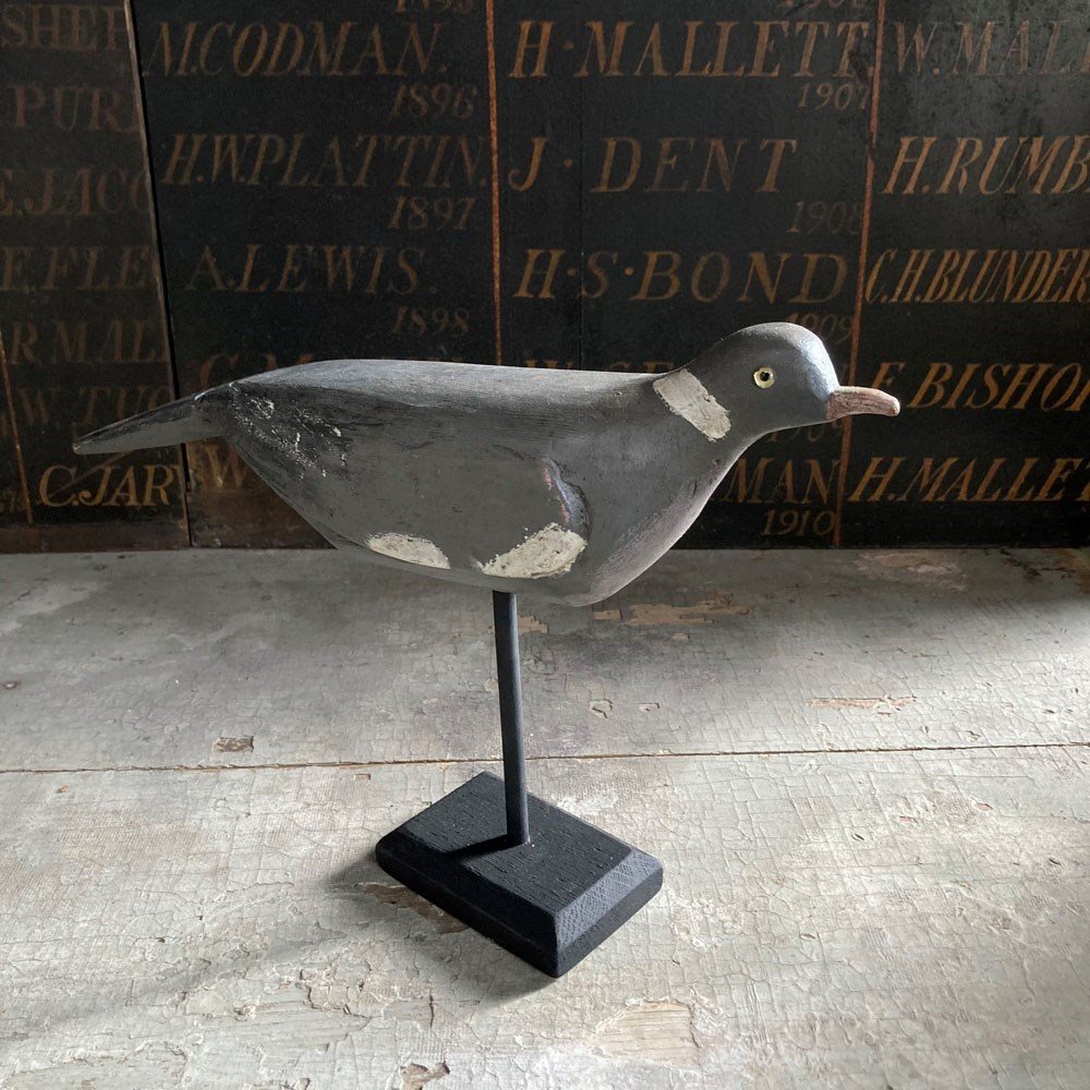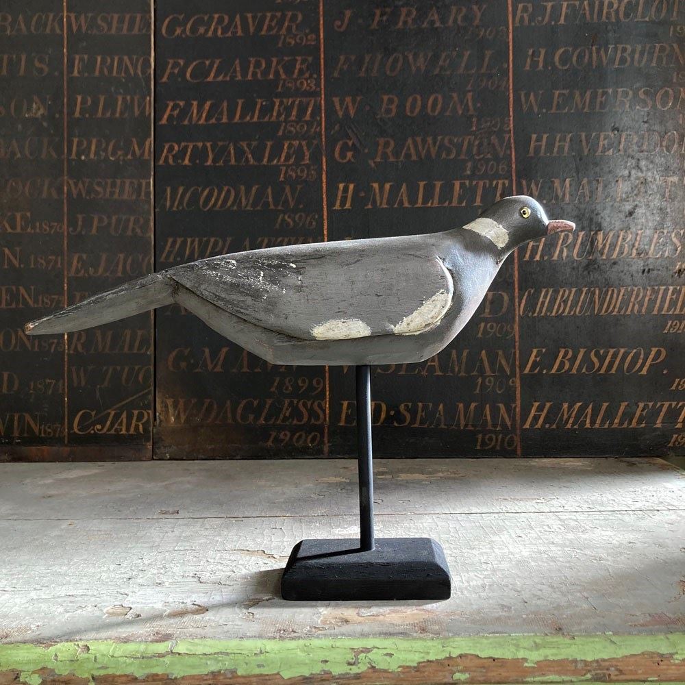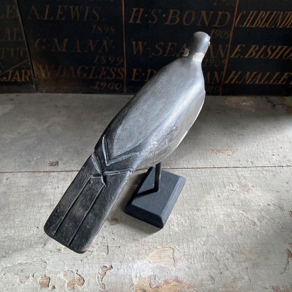 A naively carved wooden decoy of a pigeon possibly made by a hunter for his own rig, rather than commercially produced. Despite this, it has a lot of charm, with obvious thought and time put into creating it. Details such as the inset glass eyes, the geometric-style incised area where the wing tips meet the tail feathers, and the stylised yet functional paintwork, all make this piece of folk art quite unique. Stand included.