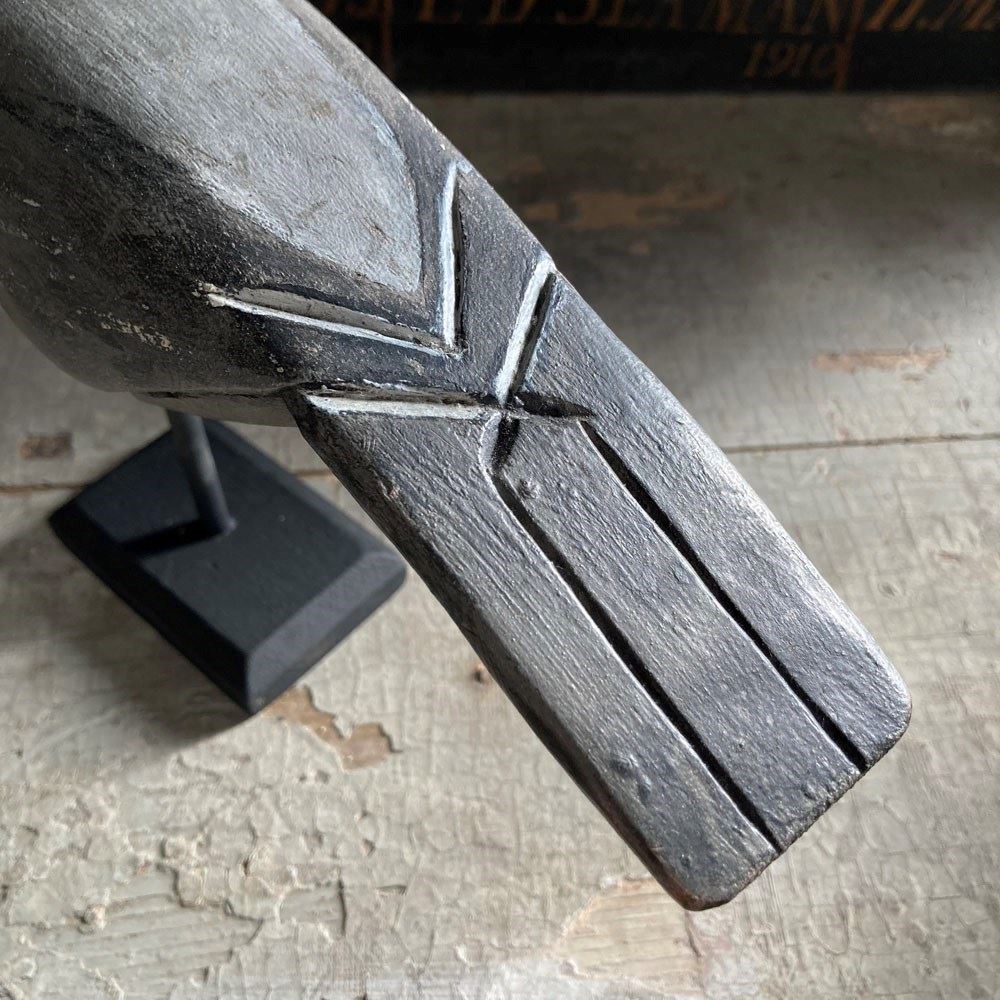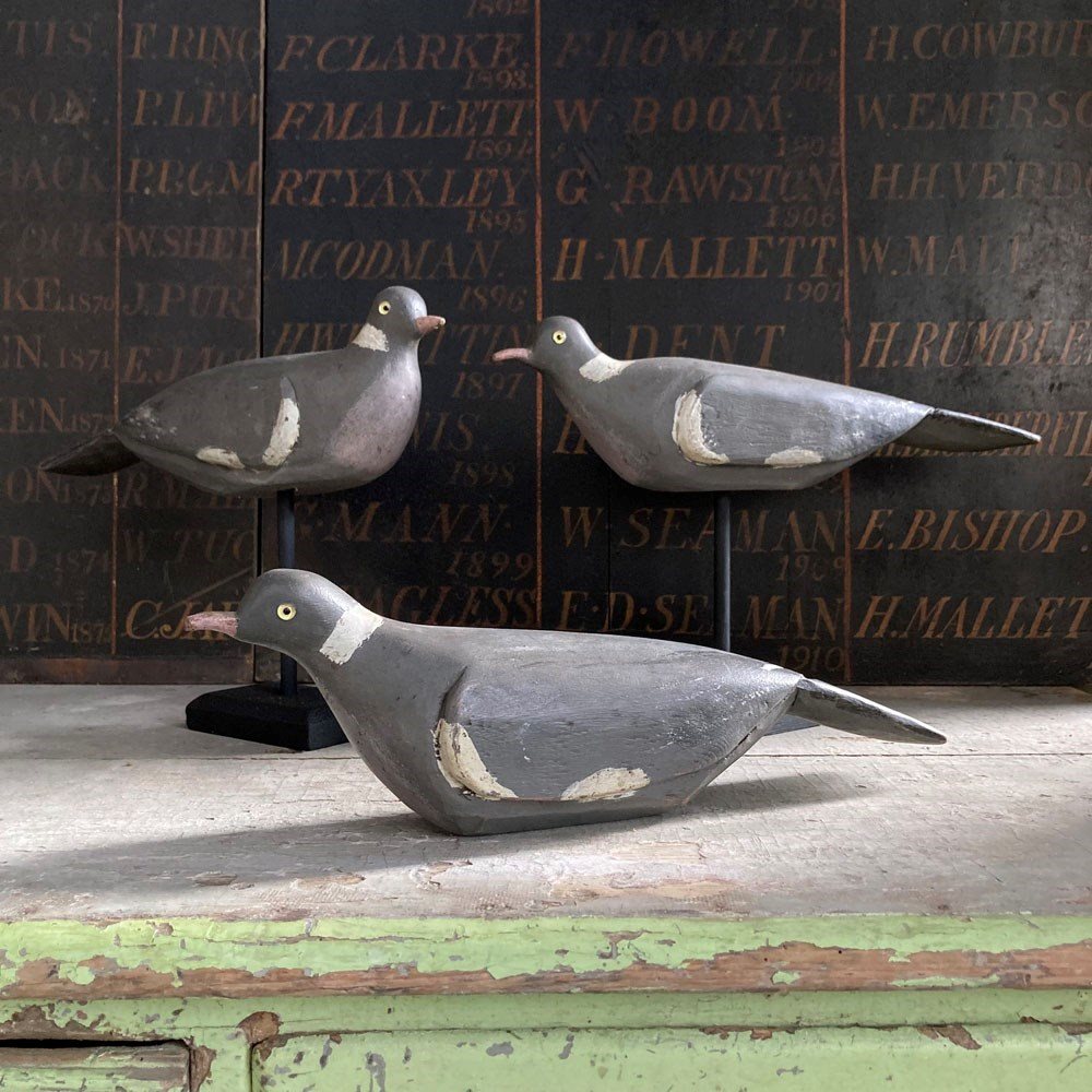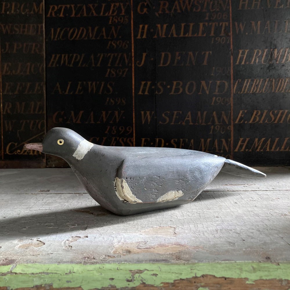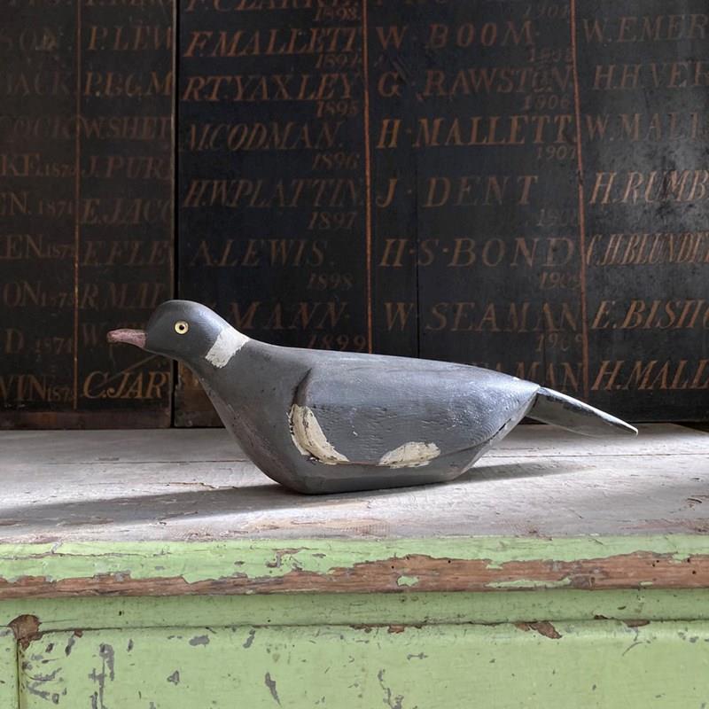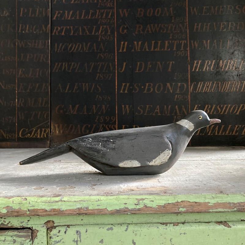 A naively carved wooden decoy of a pigeon possibly made by a hunter for his own rig, rather than commercially produced. Despite this, it has a lot of charm, with obvious thought and time put into creating it. Details such as the inset glass eyes, the geometric-style incised area where the wing tips meet the tail feathers, and the stylised yet functional paintwork, all make this piece of folk art quite unique. Stand included.